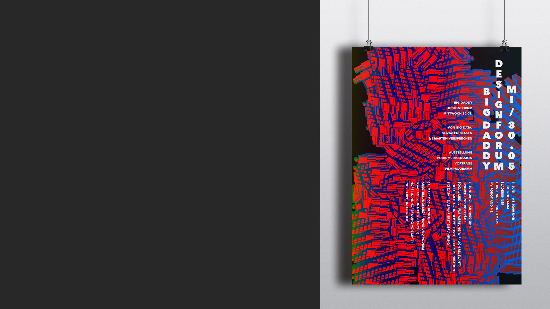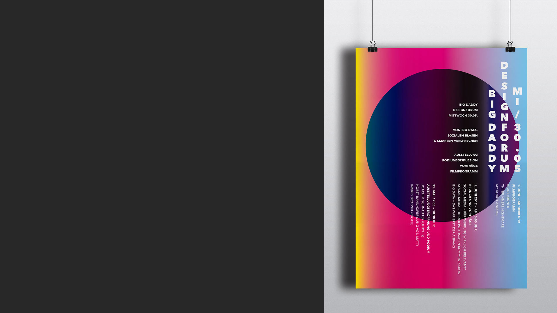 Im Rahmend der 5. Spurensuche wurde eine Ausstellung im Designforum veranstaltet. Das Thema war Big Data, Digitalisierung, Smarte Versprechen und Filterbubbles. Zu sehen sind zwei Plakatentwürfe. Mein Anspruch des Plakatentwurfs war es durch eine rein grafische Lösung platz für Interpretationen zu lassen. Nr.1 - Verläufe mit grellen Farben rezipierten für mich die Anfänge des Digitalen Zeitalters. Nr.2 - Eine Masse aus piktogramm-artigen Menschen bilden einen wirren Schwarm – den digitalen Schwarm