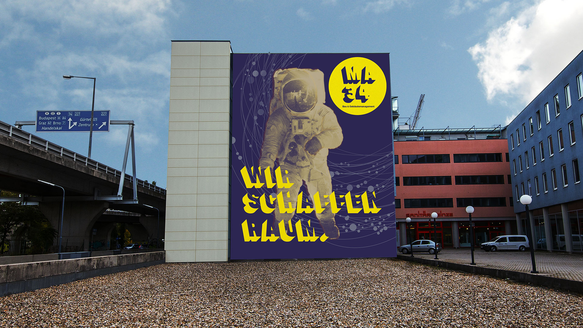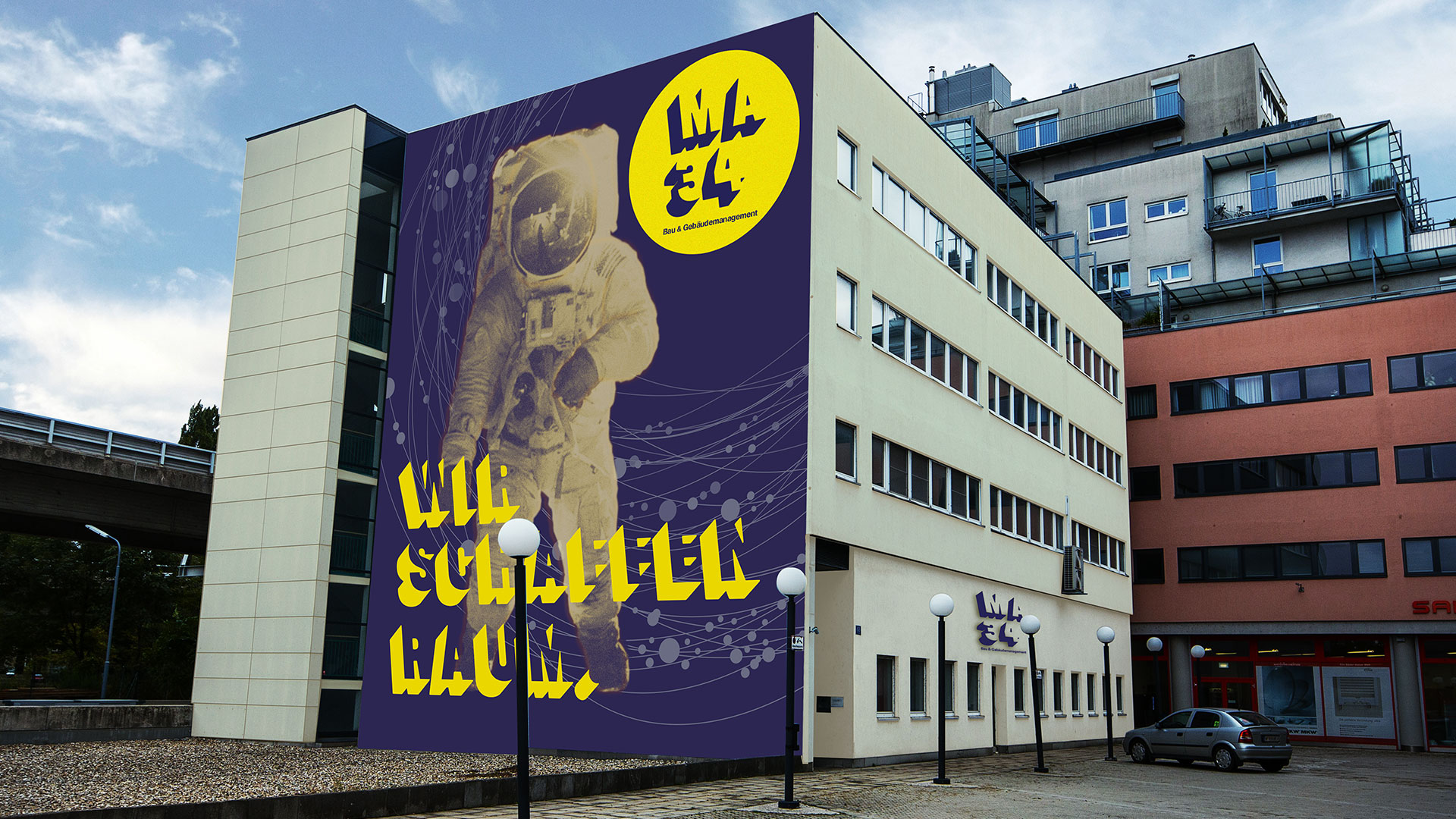 Fassadengestaltung für die Zentrale der MA 34, Magistrat für Bau- und Gebäudemanagement Wien. Der Slogan „Wir schaffen Raum“ wurde auf humorvolle Art und Weise in eine Geschichte um die Raumstation MA 34 eingebettet, die von ihrer Zentrale aus zahlreiche Gebäude der Stadt Wien – die „Satelliten“ – baut, betreut und instand hält. 2. Platz beim SchülerInnenwettbewerb.