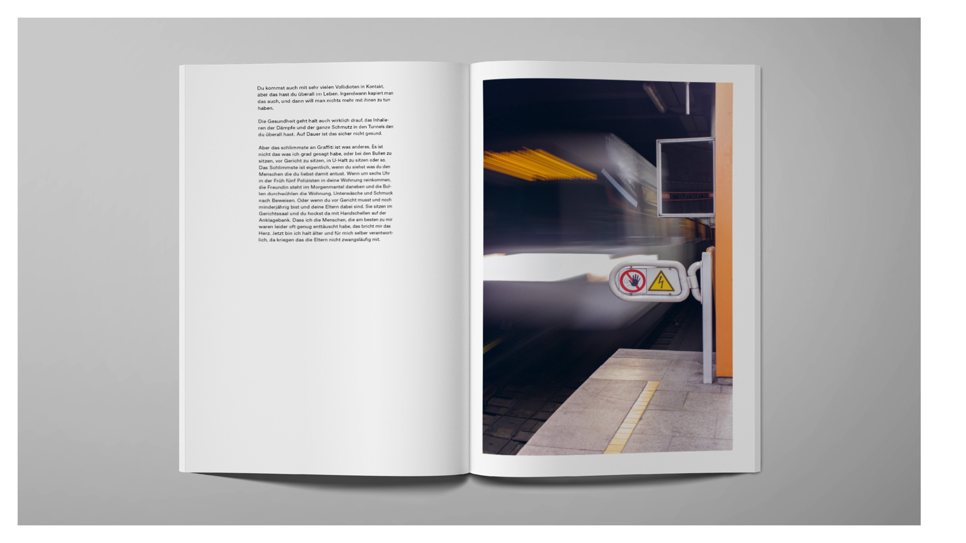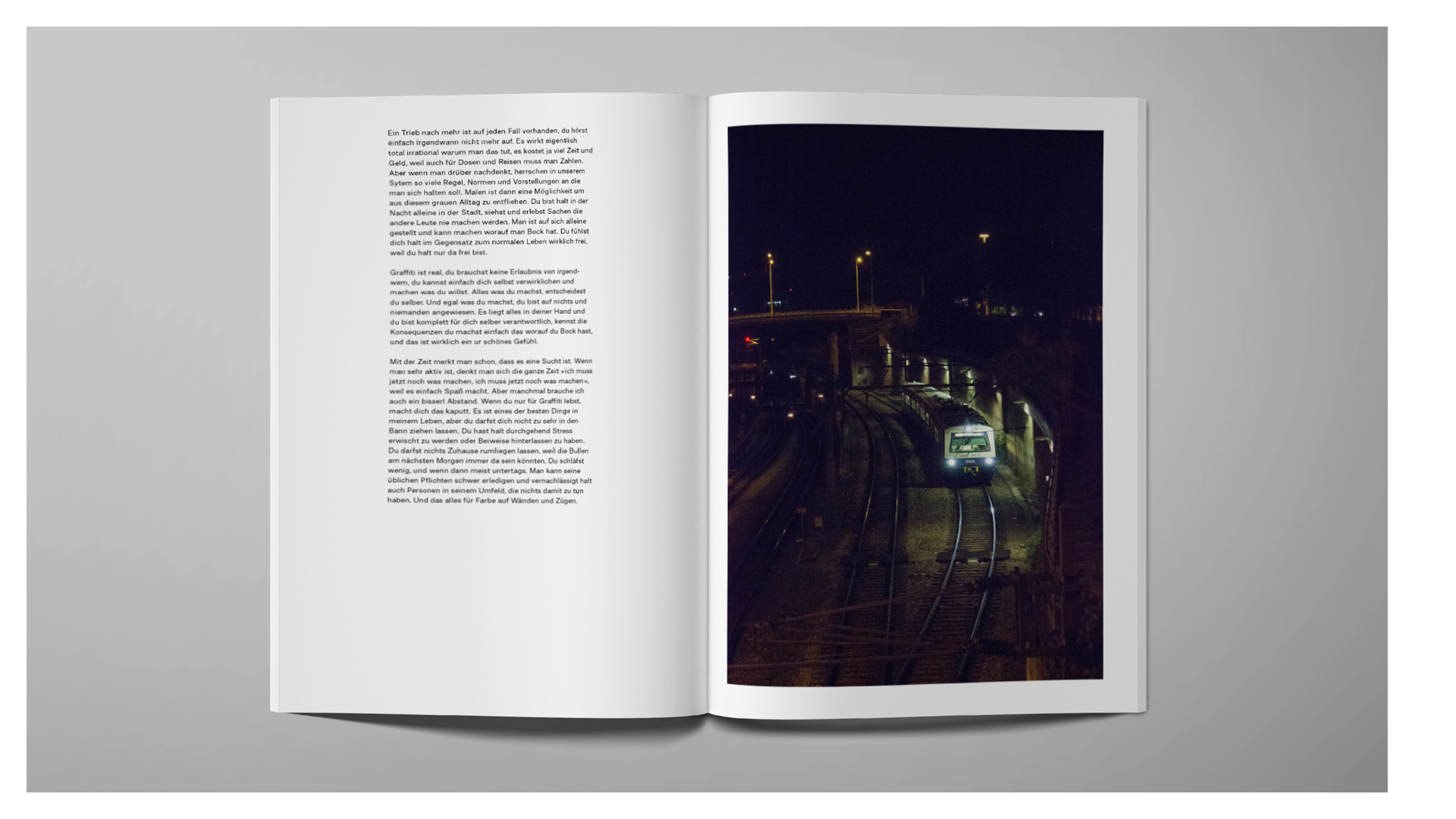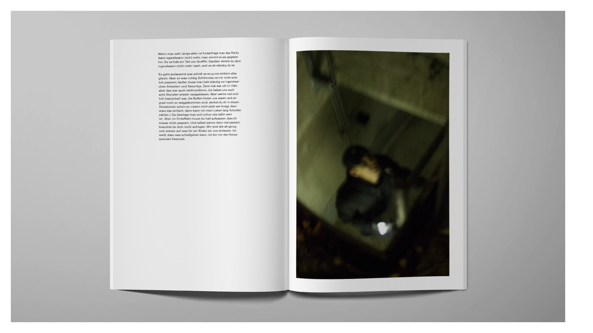 Dieses Projekt gibt einen Einblick in die Gedanken und das Leben von Personen die illegale Graffitis sprühen. Der Fokus liegt dabei auf den Emotionen und Erlebnissen der Personen. Sie wurden begleitet, fotografiert und interviewt. All dies ist in dem Magazin Perspektiven zu sehen.