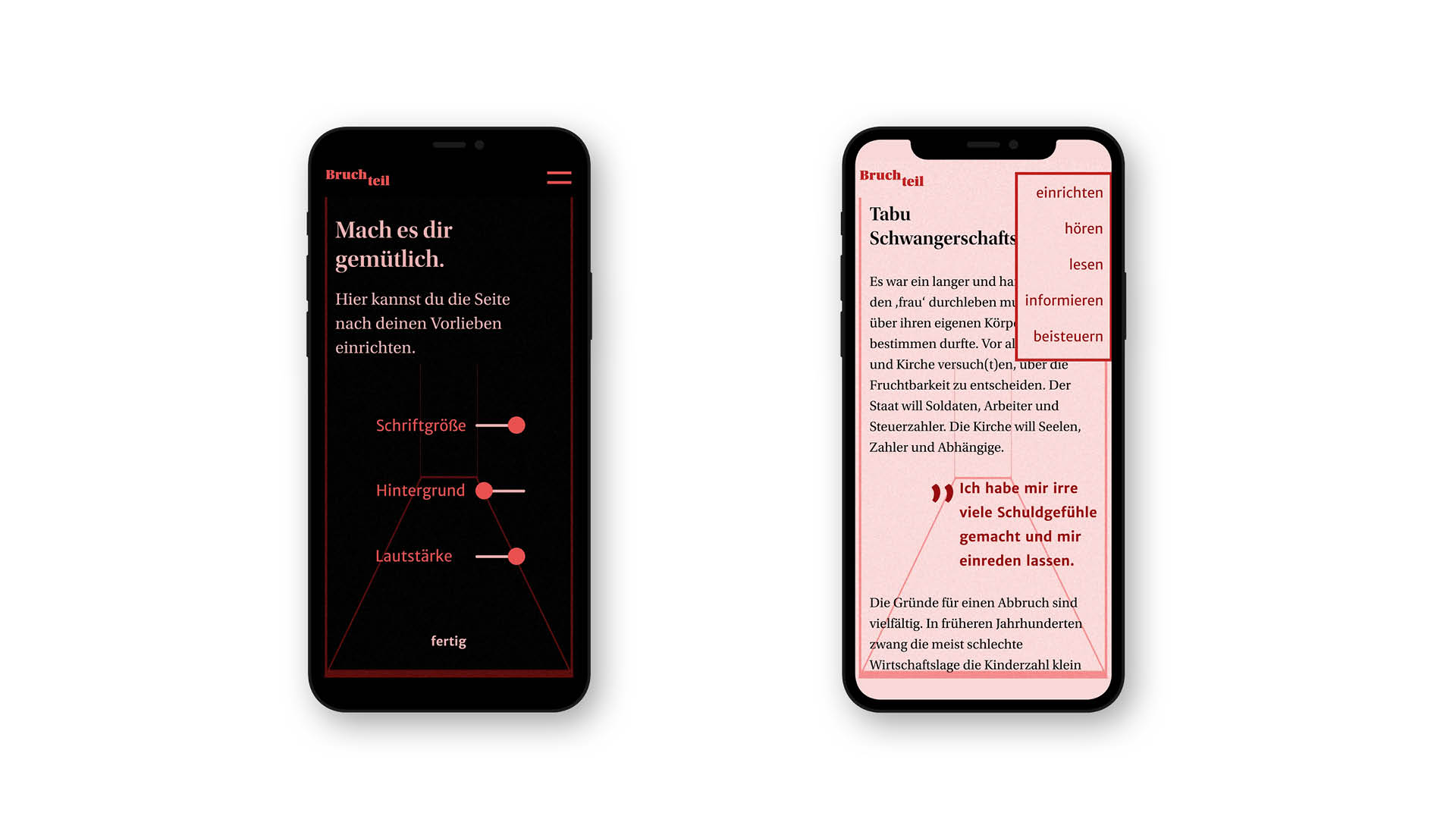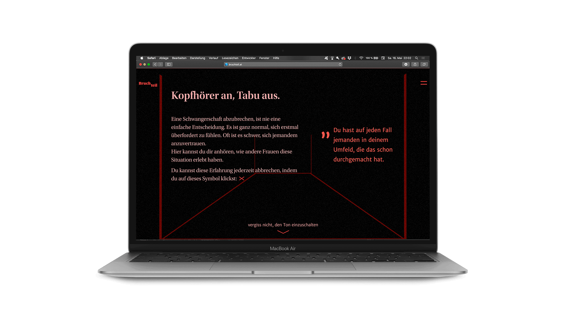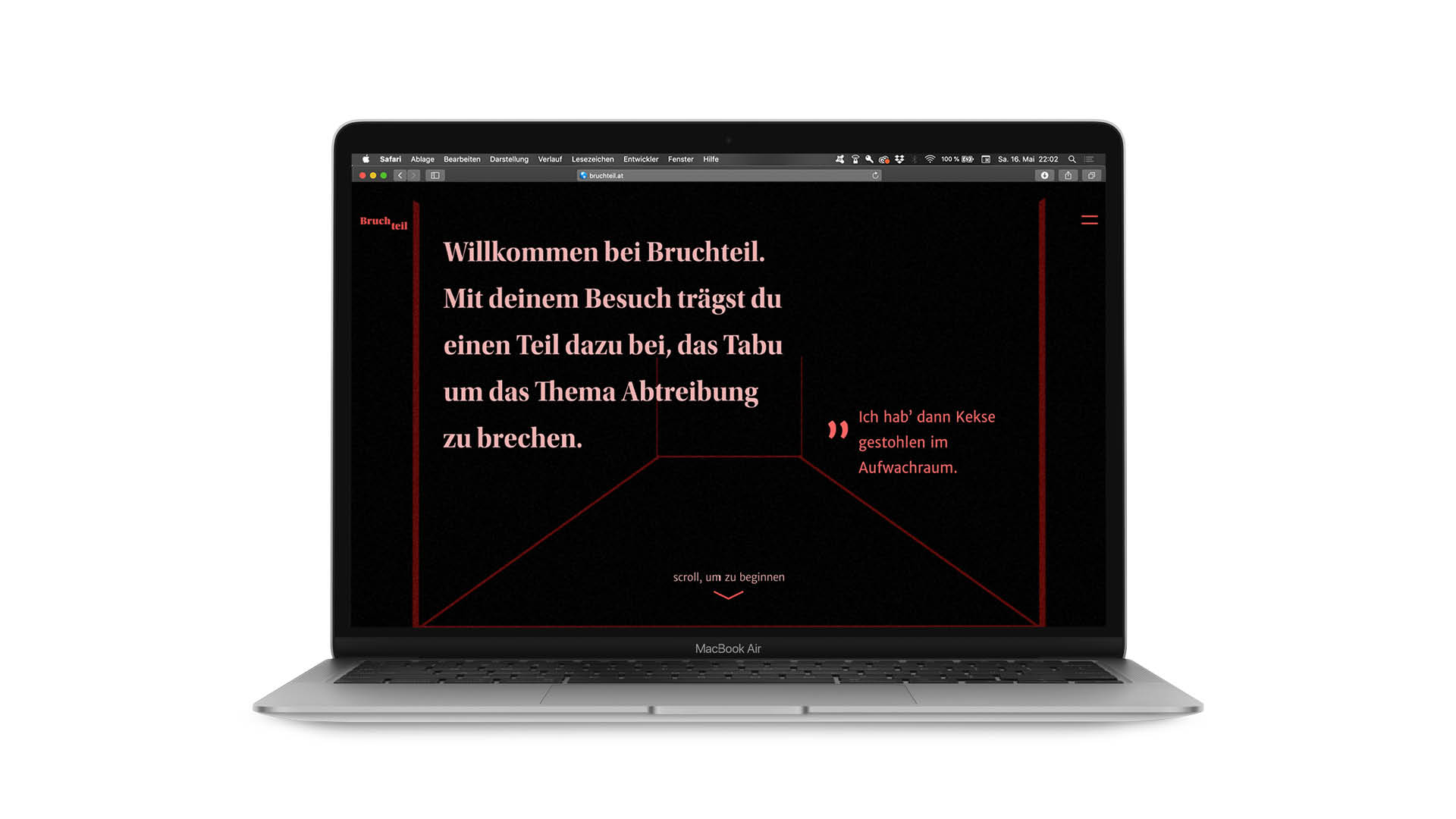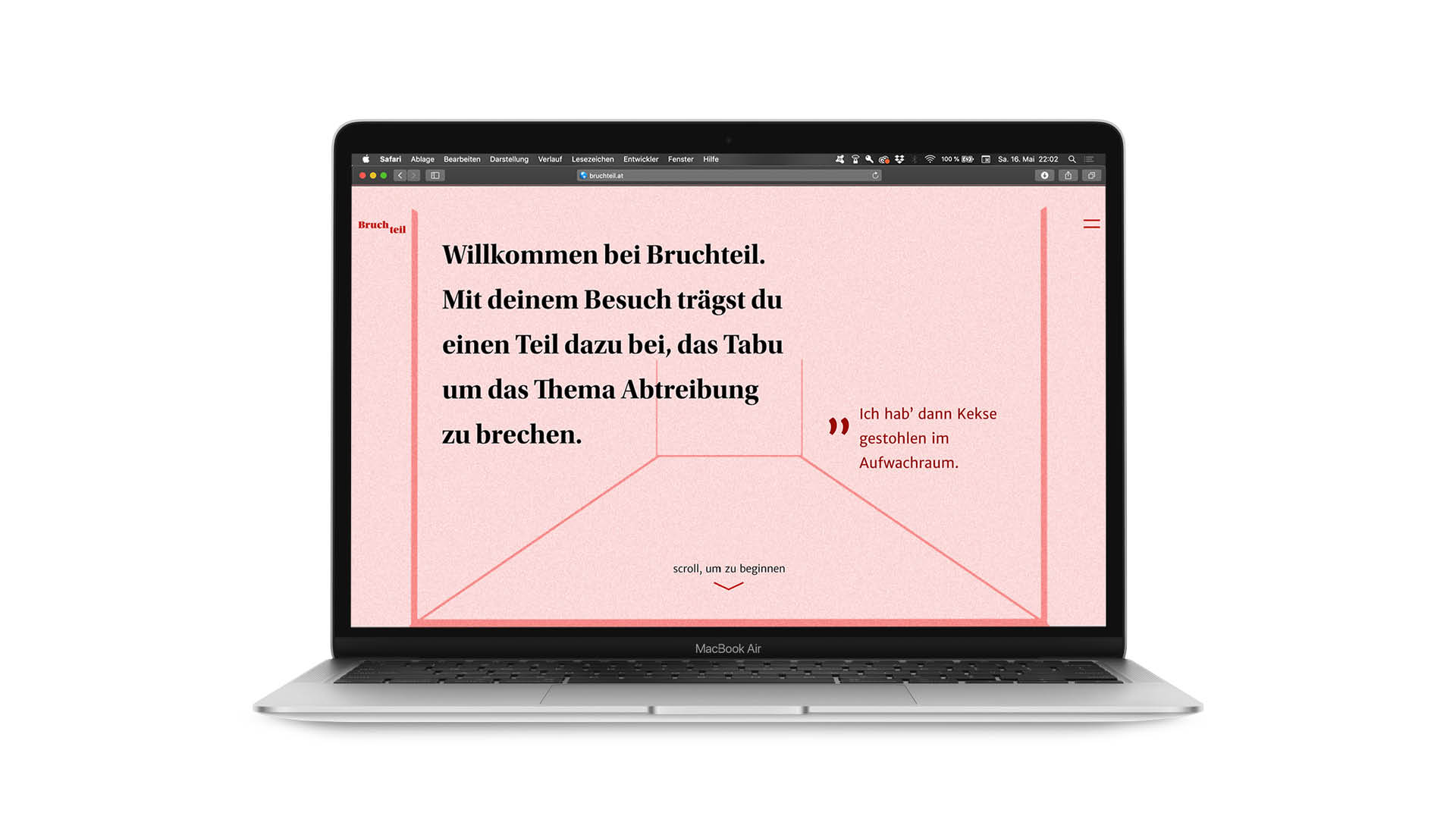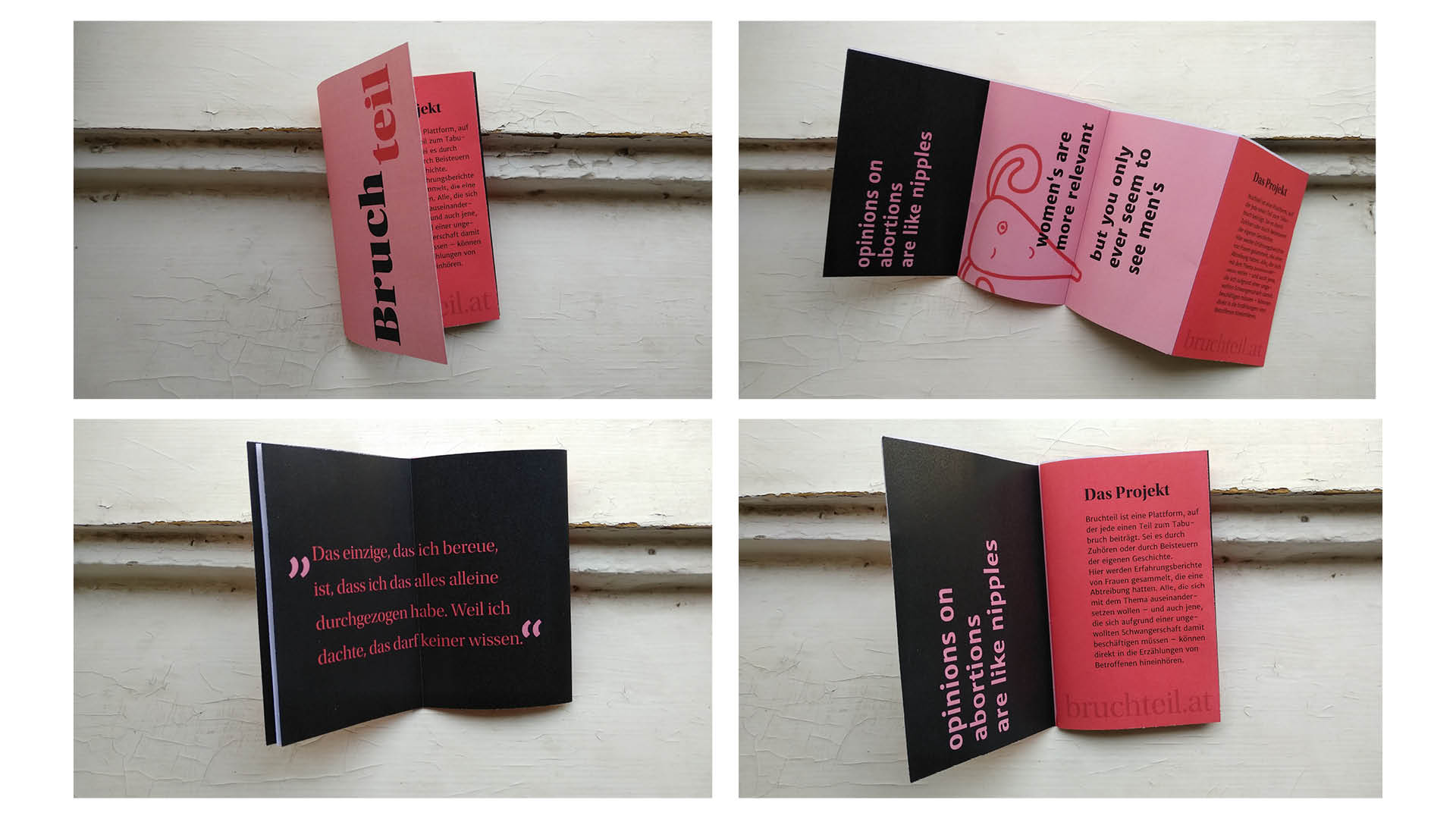 Durch das gesellschaftliche Tabu in Bezug auf das Thema Abtreibung fehlen Frauen im Falle einer ungewollten Schwangerschaft oft dringend notwendige Informationen. Mit dem Projekt ›Abbruch‹ soll ein Angebot entstehen, das diesem Bedürfnis nach Information nachkommt und gleichtzeitig dazu beiträgt dem Tabu rund um dieses etwas entgegenzusetzen. Eine Möglichkeit über Schwangerschaftsabbruch zu reden, zu lesen, sich zu informieren und möglicherweise selbst in Zukunft offener darüber reden zu können. Um dieses Ziel zu erreichen, entstand eine Webseite, die eine Austauschmöglichkeit für betroffene Frauen bietet. bruchteil.at ist eine Plattform, auf der Frauen ihre Erfahrung mit Schwangerschaftsabbrüchen in Form von Sprachaufnahmen teilen.