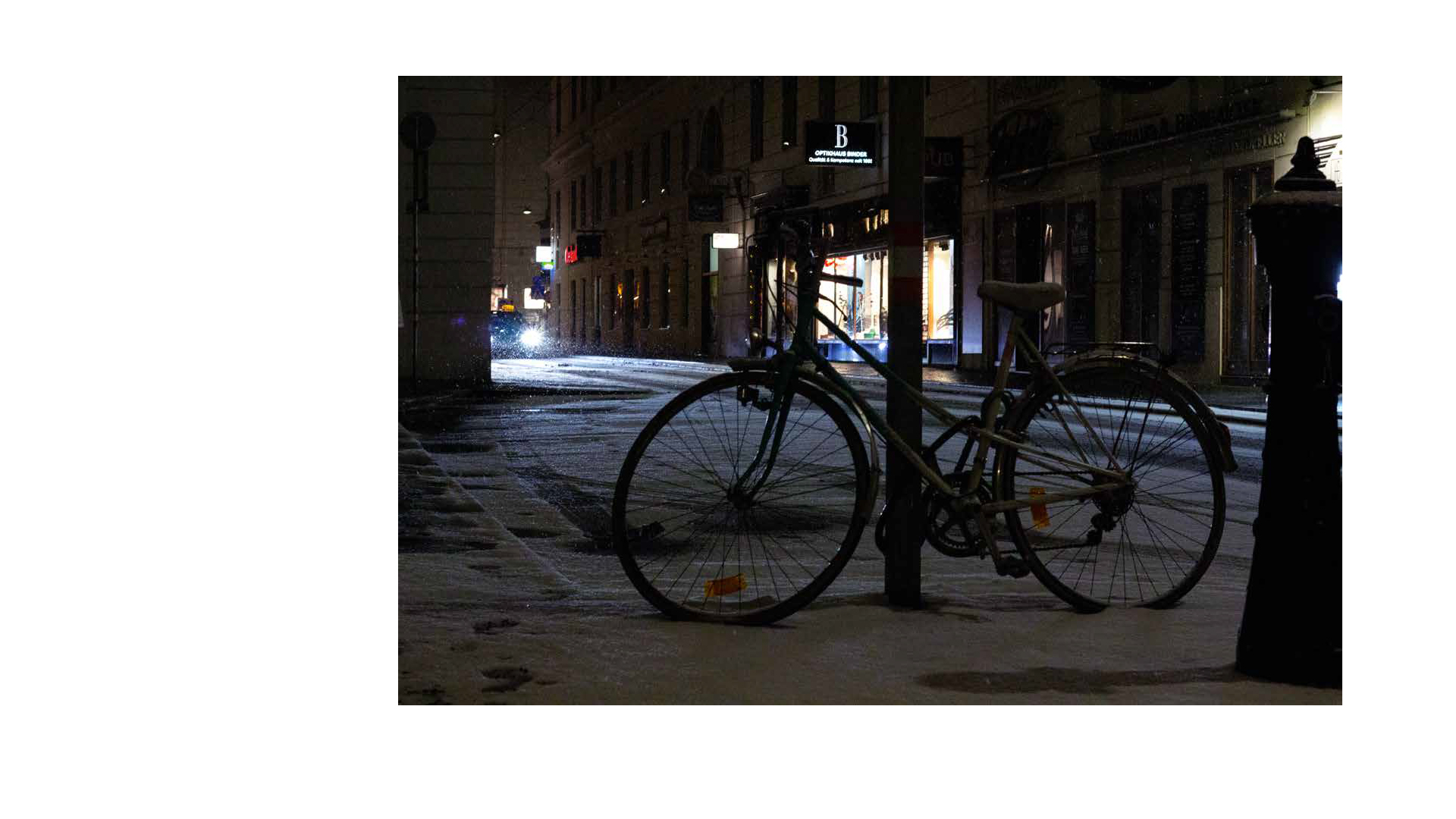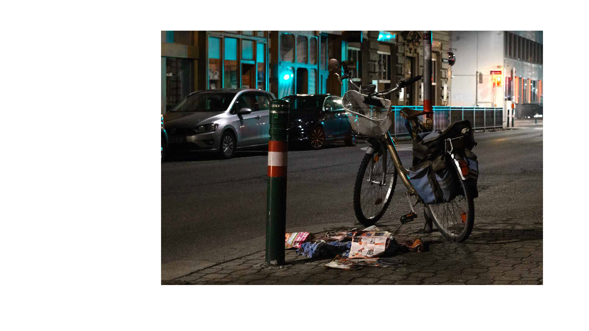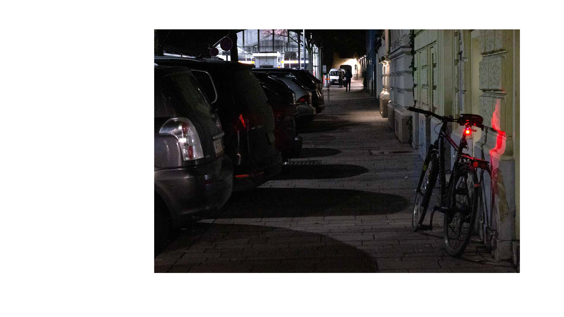 Im Jahre 2020/21 ist der ganzen Welt das Schicksal einer Pandemie widerfahren. Auch die einst pulsierende Hauptstadt stand still. Sportanlagen wurden geschlossen und öffentliche Verkehrsmittel gemieden, um körperliche Kontakte einzuschränken. Diese Maßnahmen ließen die Menschen wieder zunehmend auf das Fahrrad steigen. Diese Fotoserie dokumentiert die nachts auf den Straßen stehenden Fahrräder. Der Grundgedanke dieses Projekts ist es, die verlassenen Räder selbst ihre Geschichte erzählen zu lassen.