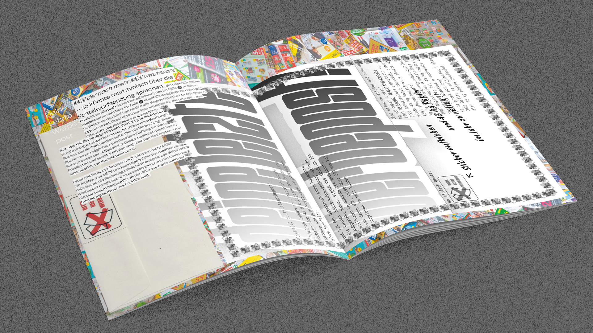Unadressierte Werbung verursacht Unmengen an unnötigen Müll. Mit einer (hoffentlich) letzten Werbepost soll der Sache entgegengesteuert werden: Diese informiert über die Problematik und liefert das ›Bitte-keine-Werbung‹-Sticker mit sich, das der Empfänger gleich am Postkasten aufgekleben kann.