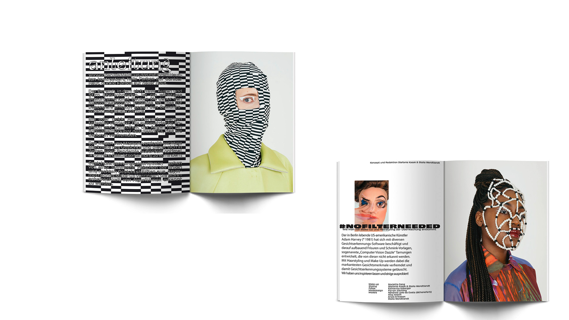 Wie man mit Make-Up und Hairstyling der Überwachung entkommt. Der in Berlin lebende US-amerikanische Künstler Adam Harvey (* 1981) hat sich mit diversen Gesichtserkennungs-Software beschäftigt und darauf aufbauend Frisuren und Schmink-Vorlagen, sogenannte „Computer Vision Dazzle“ Tarnungen entwickelt, die von dieser nicht erkannt werden. Mit Haarstyling und Make-Up werden dabei die markantesten Gesichtsmerkmale verfremdet und damit Gesichtserkennungssysteme getäuscht. Dieser Artikel erscheint ebenfalls im C/O Vienna Magazin ›The Consumer Issue‹ – mit Stella Wendtlandt