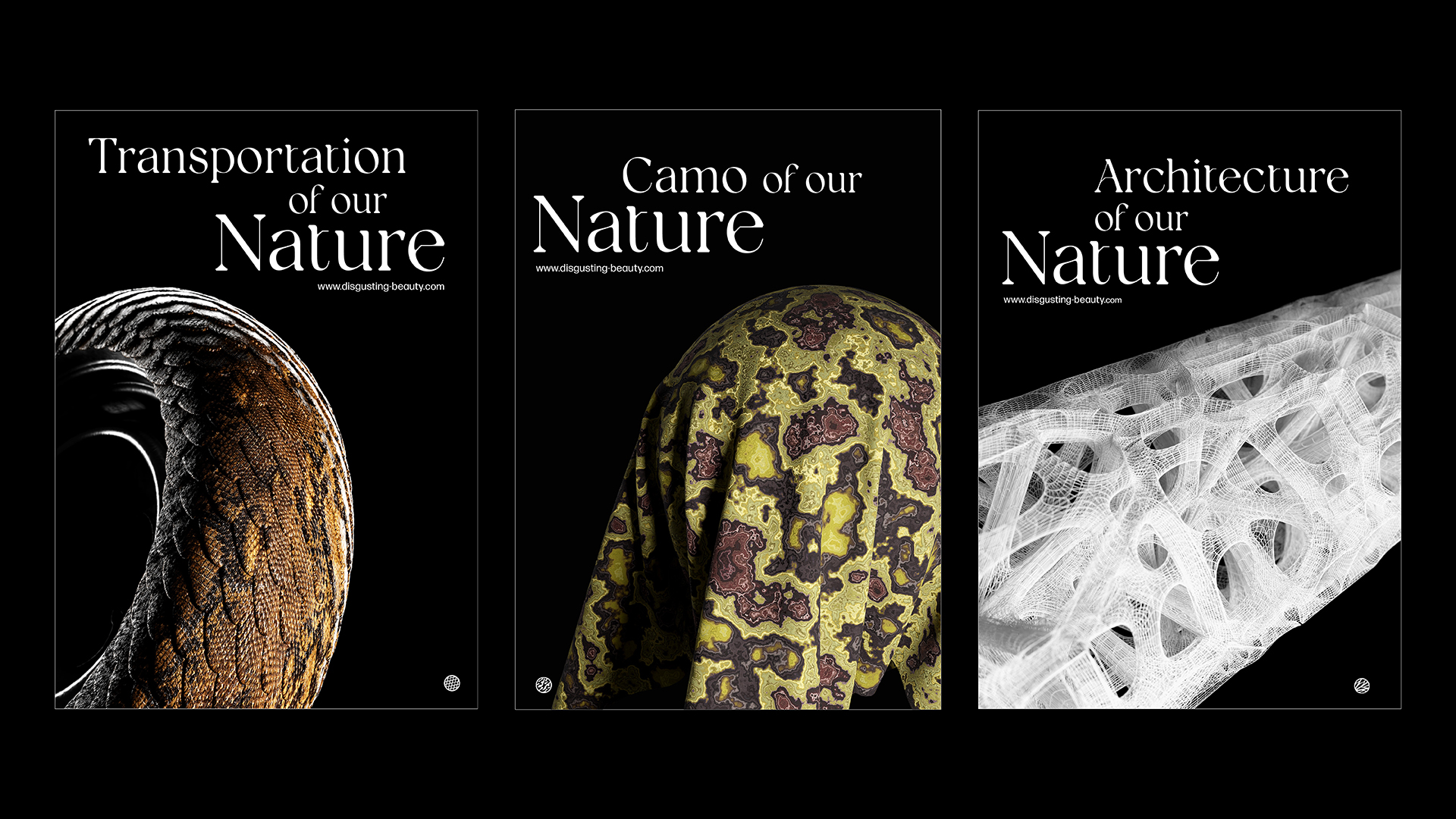 ›Concepts of our Nature‹ Bei herkömmlichen Tierschutzkampagnen werden meistens nur „niedliche“ Tiere behandelt. Speziell Spinnen, Schlangen oder Frösche werden hier meistens übersehen, obwohl sie für unser Ökosystem unerlässlich sind. Da die Tiere in den Augen der Betrachter*innen meistens mit Ängsten oder Verachtung verknüpft sind, werden bei der Abschlussarbeit ihre einzigartigen Fähigkeiten in den Vordergrund gestellt. Durch innovative Konzepte wird gezeigt, warum die Tiere schützenswert sind und wieviel wir von ihnen lernen können. Website: Disgusting Beauty