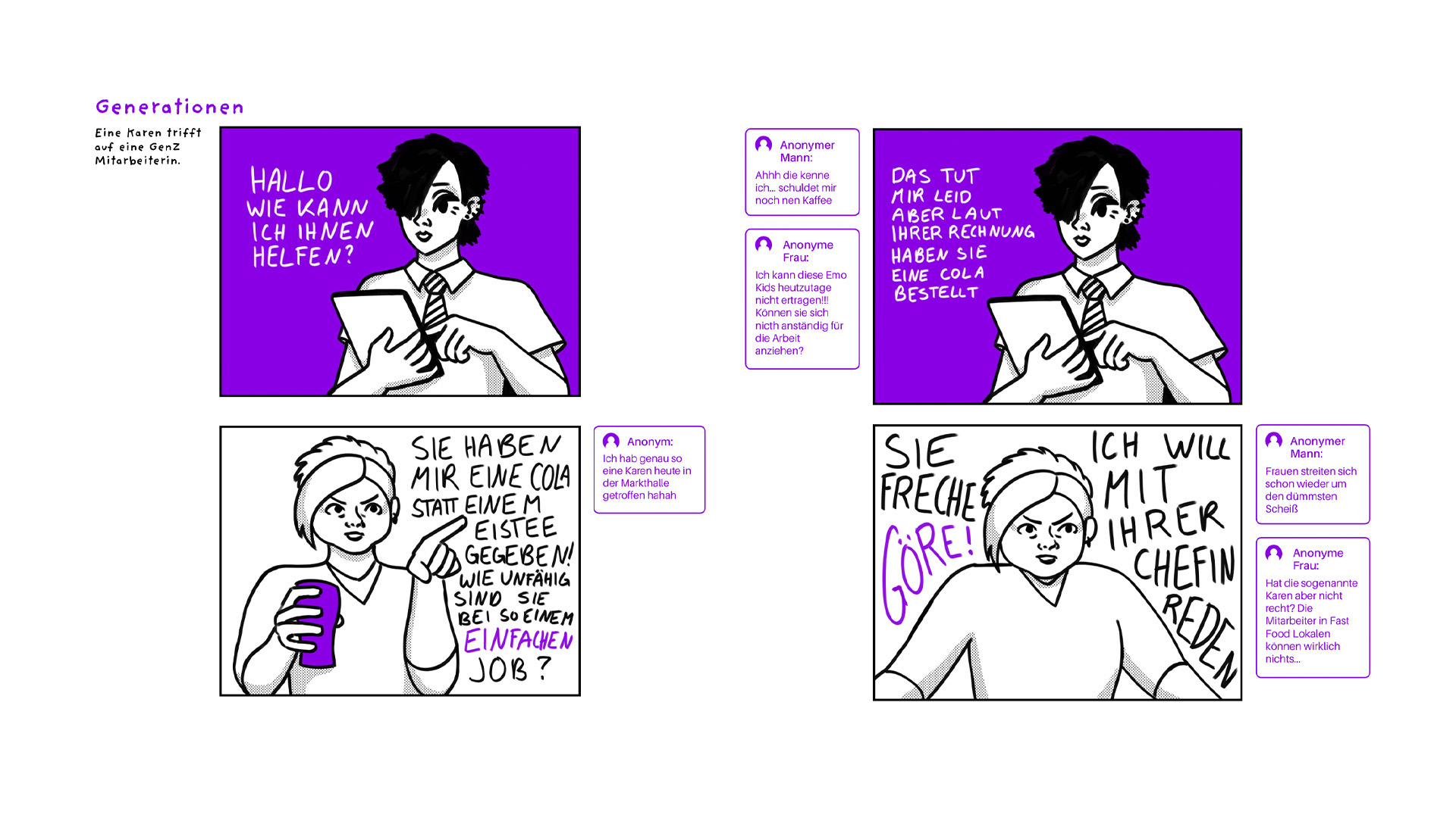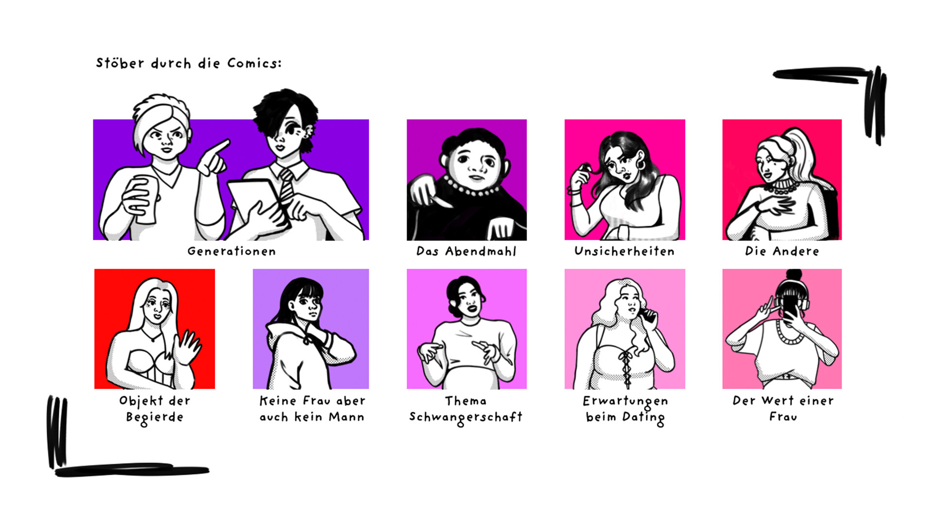 Feminine Frauen werden kritisiert. Maskuline Frauen werden kritisiert. Androgyne Frauen werden kritisiert. Alle Frauen werden kritisiert. Egal, welche Rolle sie einnehmen oder wie sie sich präsentieren – Frauen stehen stets im Fokus der Kritik und Bewertung. Diese universelle Erfahrung verbindet sie, unabhängig von ihrem individuellen Ausdruck. „Das Paradoxon der Weiblichkeit“ ist ein Digitorial, welches zur Diskussion anregen soll. In neun Comics werden alltägliche Erlebnisse von Frauen in unterschiedlichen Kontexten dargestellt. Jede Geschichte beleuchtet verschiedene Facetten der Weiblichkeit und die damit verbundenen Herausforderungen. Die Comics zeigen dabei keine einfachen Lösungen auf. Stattdessen zielt es darauf ab, den Dialog darüber zu fördern, wie Geschlechterrollen und gesellschaftliche Erwartungen das Leben von Frauen beeinflussen. Website – Paradoxon der Weiblichkeit