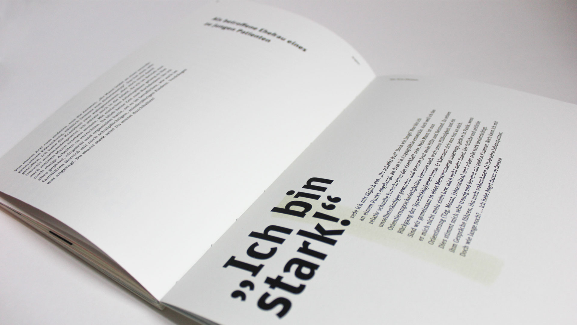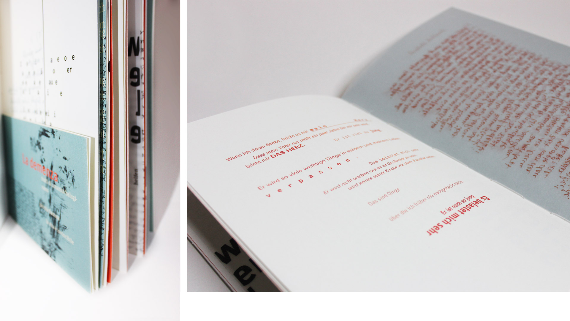 Das Projekt setzt sich mit dem Thema Demenz auseinander. Dabei liegt der Schwerpunkt der Arbeit im Thema Kommunikation. Kommunikation in der Familie, im Umfeld und mit den Spezialisten, wie Ärzte, Psychologen oder öffentliche Stellen. Das Buch sammelt Erfahrungen, Geschichten und Gedanken von PatientInnen und Angehörigen, sowie die Ansicht von ExpertInnen aus dem medizinischen und institutionellen Bereich.
