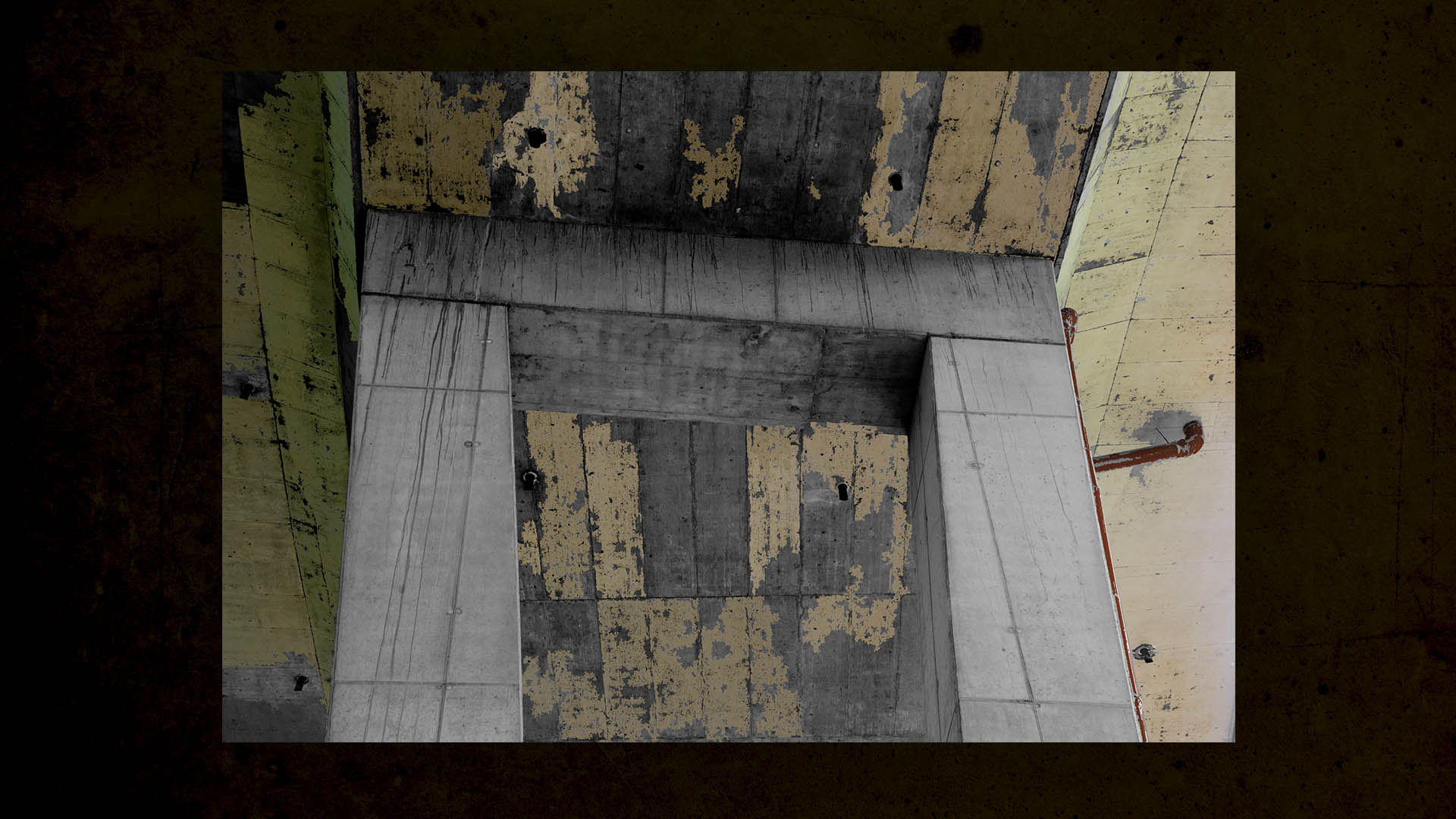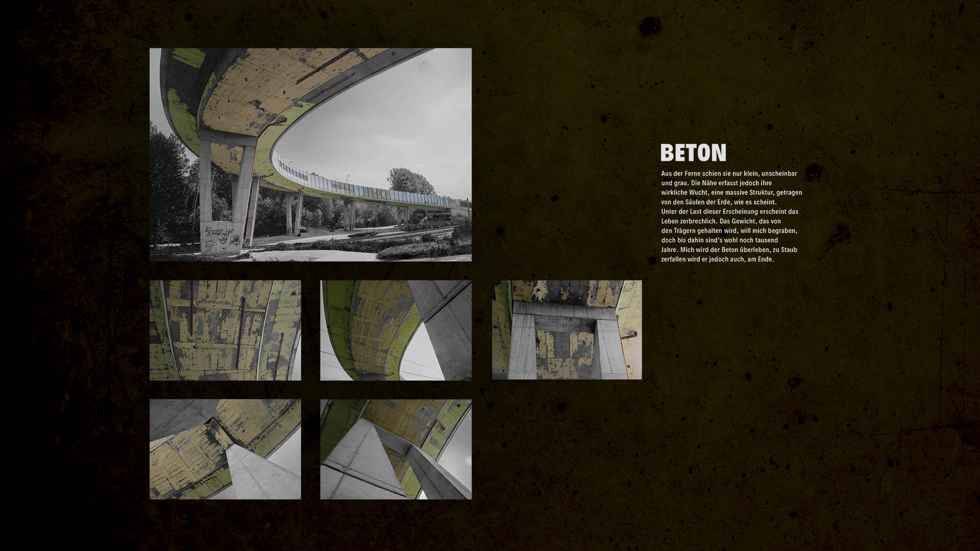 ›Aus der Ferne schien sie nur klein, unscheinbar und grau. Die Nähe erfasst jedoch ihre wirkliche Wucht, eine massive Struktur, getragen von den Säulen der Erde, wie es scheint. Unter der Last dieser Erscheinung erscheint das Leben zerbrechlich. Das Gewicht, das von den Trägern gehalten wird, will mich begraben, doch bis dahin sind’s wohl noch tausend Jahre. Mich wird der Beton überleben, zu Staub zerfallen wird er jedoch auch, am Ende.‹