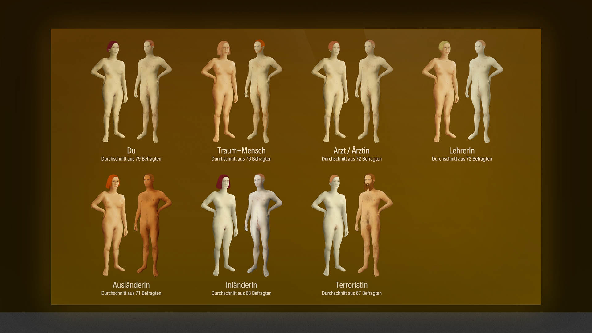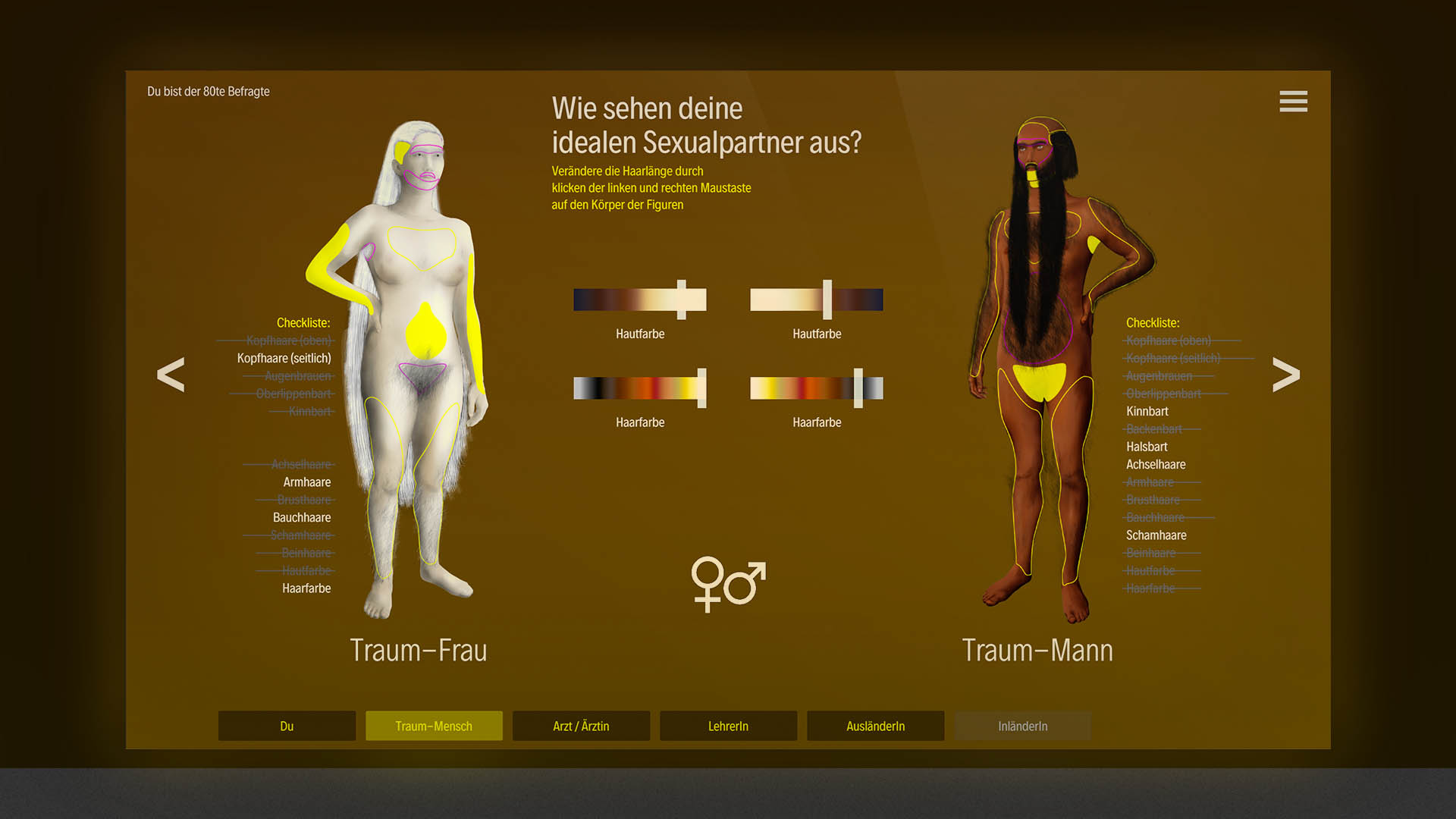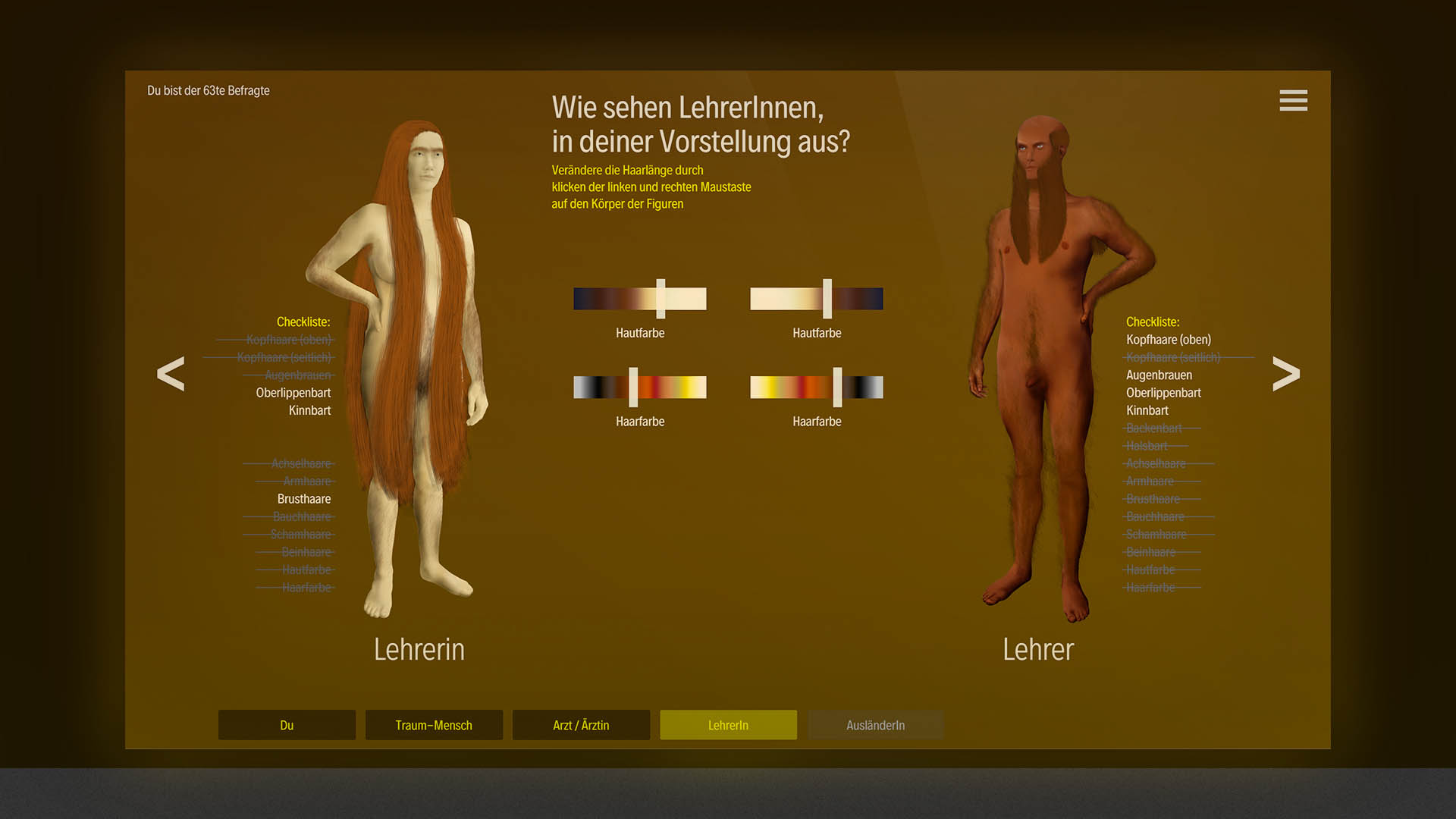 In unserer Gesellschaft existieren viele Vorurteile im Zusammenhang mit Haaren. Lange Haare werden oft als weiblich und kurze Haare als männlich angesehen. Frauen werden als ekelhaft betrachtet, wenn sie sich nicht ihre Beine und Achseln rasieren — dasselbe bei Männern, die ihren Bart nicht trimmen. Ein ungepflegtes oder gar faules Auftreten wird damit in Verbindung gebracht, wie weit die letzte Rasur zurückliegt. Um im Rahmen der Ausstellung eine kleine Statistik zu den Vorlieben, Vorstellungen und Vorurteilen der Besucher der Ausstellung zur menschlichen Körperbehaarung zu bekommen, wurde ein Charaktereditor programmiert und gestaltet, der durch das modifizieren der Körperbehaarung und Hautfarbe funktioniert. Den Rezipienten wurde hierbei eine kleine Auswahl an Personengruppen vorgelegt, für die es galt die Körperbehaarung zu definieren. Aus den Ergebnissen aller Befragten wurde ein Durchschnitt errechnet, den die Rezipienten mit ihren eigenen Angaben vergleichen konnten. Geschlechter außerhalb des Binären, sowie no-op trans Menschen wurden aufgrund des kleinen Umfangs der Ausstellung (und aus zeitmangel) nicht berücksichtigt. ›Non-Binary people are valid!‹ ›Trans people are valid!‹