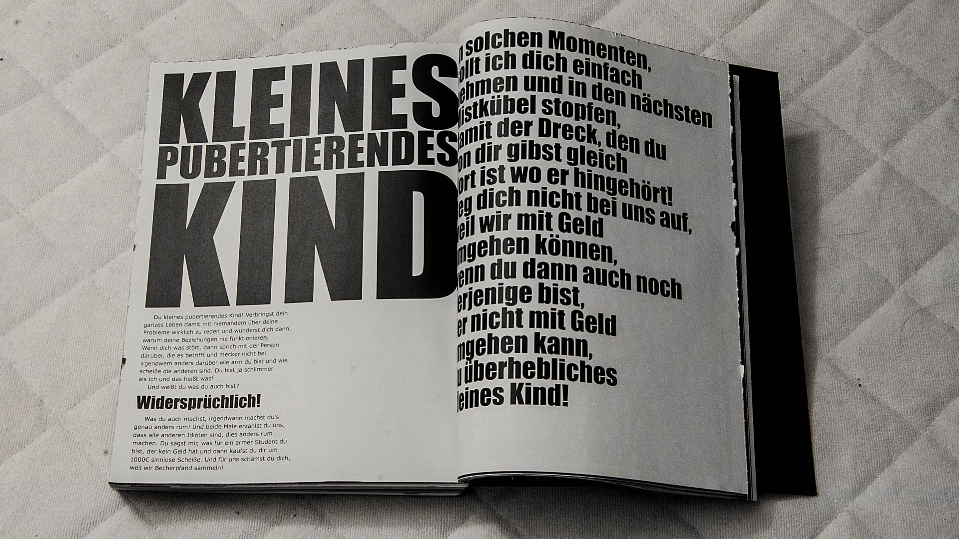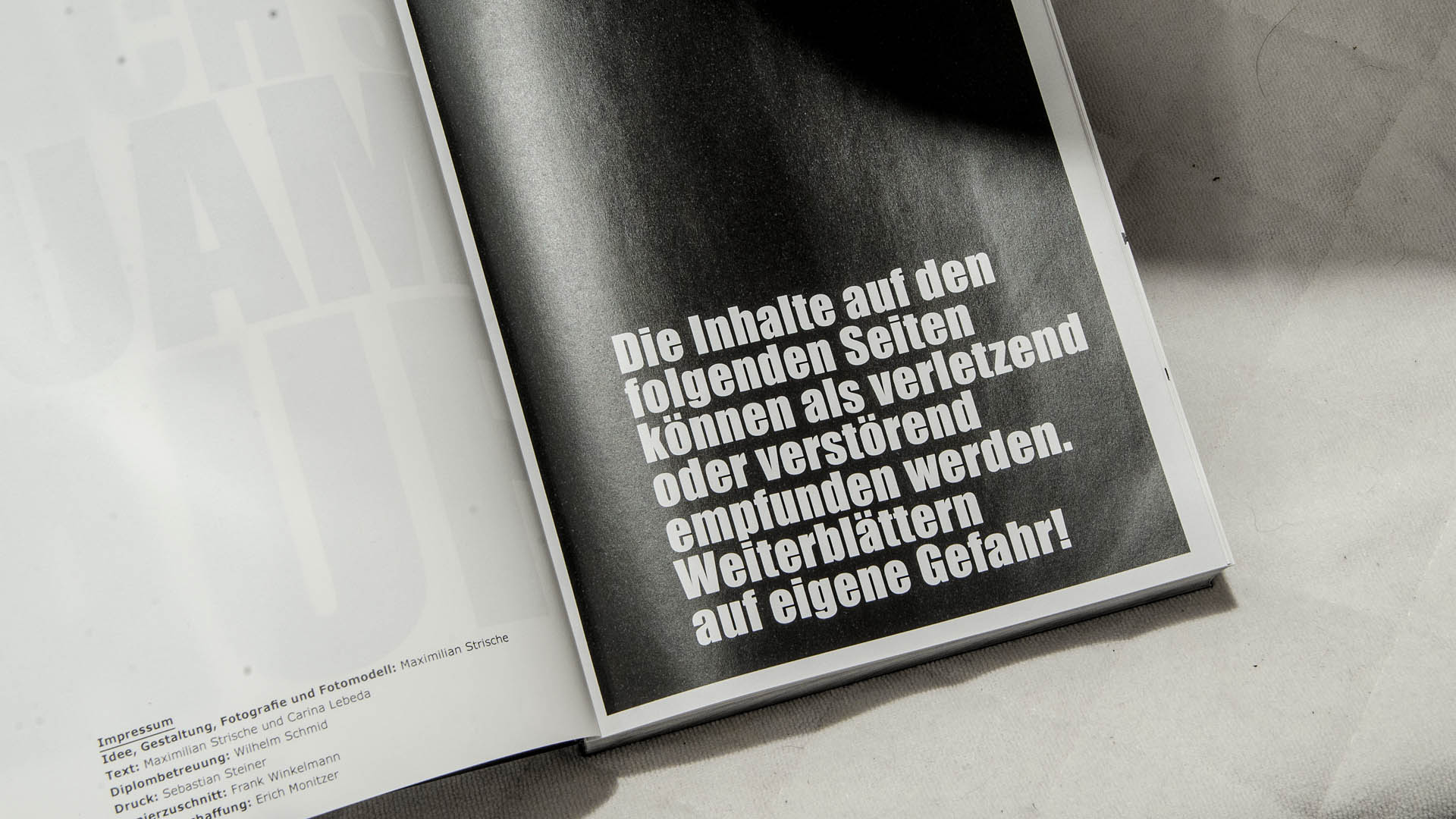 Das Gefühl der Wut ist mit einem gewissen Tabu behaftet und erscheint dem Individuum darüberhinaus oft als unangemessen und irrational. Wenn man sich gezwungen fühlt seine Aggressionen zu unterdrücken kommt es zu viel angestauter Wut, der ein entsprechendes Ventil fehlt. Sie wird so lange nicht gezeigt, bis sie explosionsartig und zerstörerisch herausbricht. Die Texte des entstandenen Buches beinhalten die unterdrückte Wut der Autorin und reflektieren darüber woher diese spezifischen Aggressionen kommen. Dadurch sollen die Leser dazu ermutigt werden über die Ursachen ihrer eigenen Wut nachzudenken und darüber hinaus sie zu äußern, bevor sie sich anstaut. Im Rahmen des Projekts wurde auch untersucht wie weit sich das Gefühl der Wut als Antrieb nutzen lässt. Dieser Untersuchung folgte eine Fotoserie, welche die Wut der Autorin, anhand ihres nackten Körpers behandelt. Diese Fotografien sind ein Teil des Buches, funktionieren aber auch eigenständig.