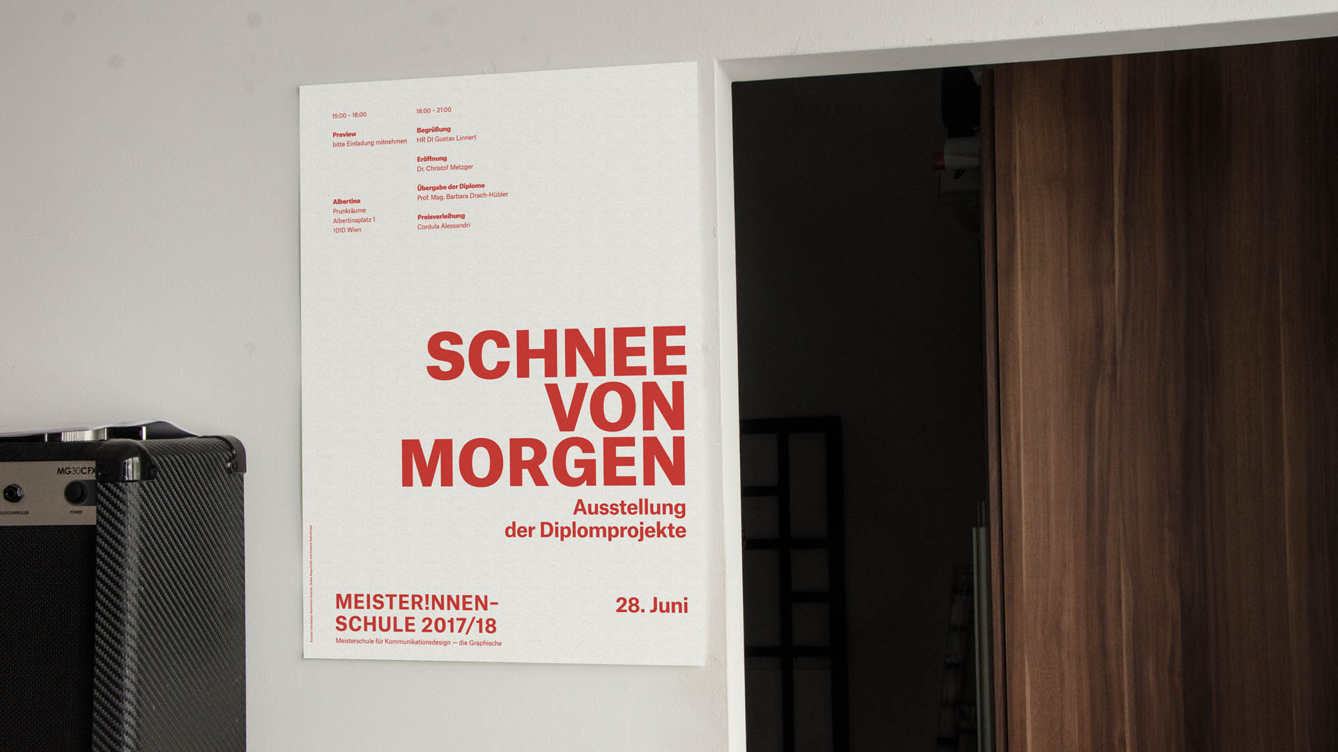 Für die jährliche Diplomausstellung der Meister!nnenschule in den Prunkräumen der Albertina, galt es einen visuellen Auftritt zu gestalten, der sich über die gesamte Ausstellung erstreckt. Werbemittel, wie Einladungen, Plakate oder Banner bei der Ausstellung, sowie verschiedene Templates für die Präsentation der Meisterarbeiten vor Ort. — mit Teresa Wagenhofer und Johanna Wakolbinger