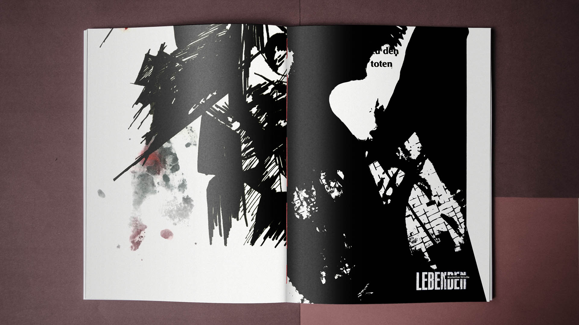 ›Das Blei der Leichen zieht die Lebenden zu den Toten.‹ Bei der visuellen Interpretation des Gedicht's wurden vor allem die Begriffe »Blei« und »Lebenden zu den Toten« als vorrangige Inspirationsquelle herangezogen. Die Arbeiten befassen sich dabei mit der Masse an Toten, die durch das Gewicht des Bleis in die Dunkelheit hinabgezogen wird, bis sie schließlich auch die Lebenden, die dazu verdammt sind unter dem Krieg zu leiden, mit in den Abgrund reißt. So zieht das Blei der Leichen die Lebenden zu den Toten.