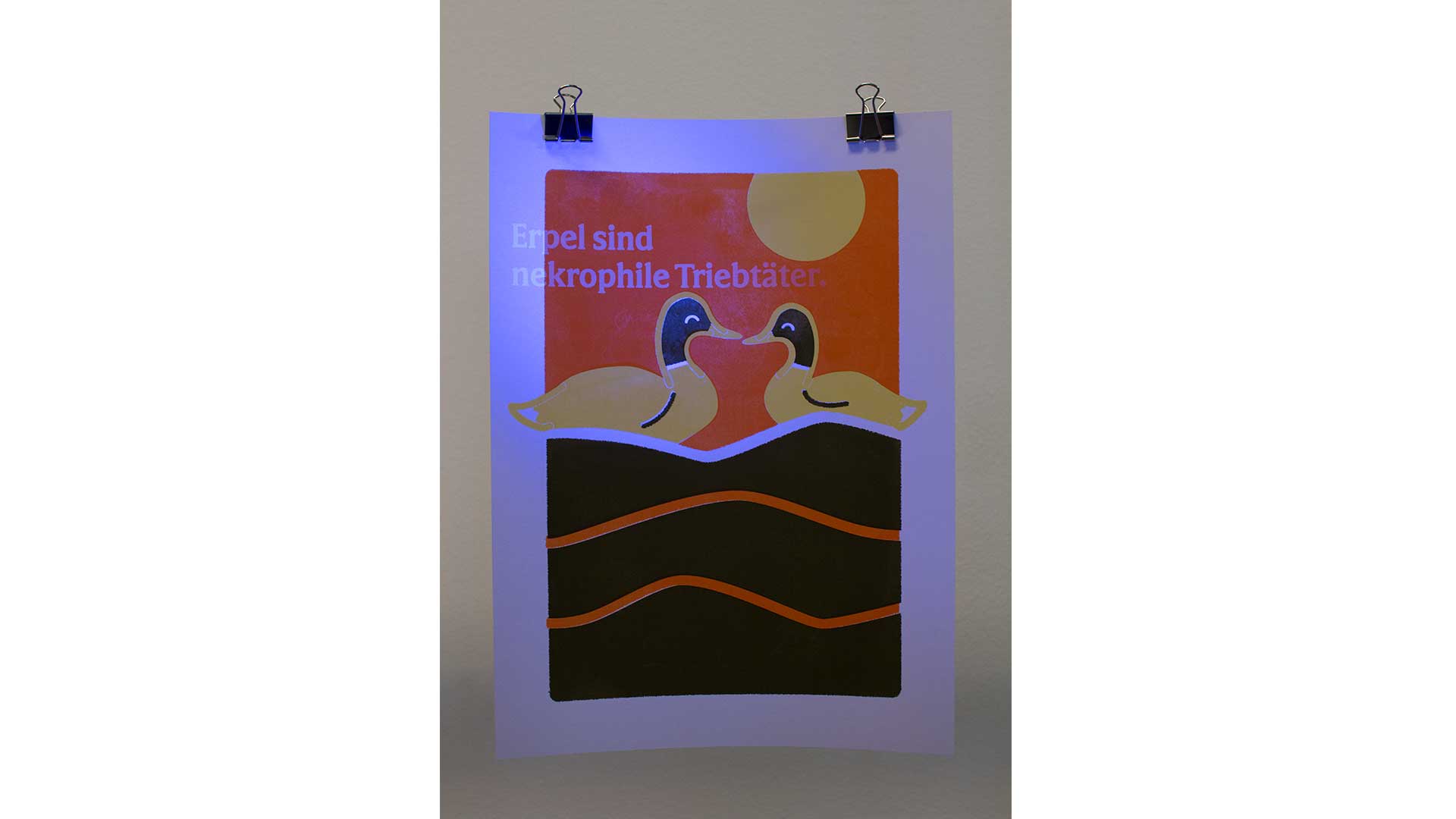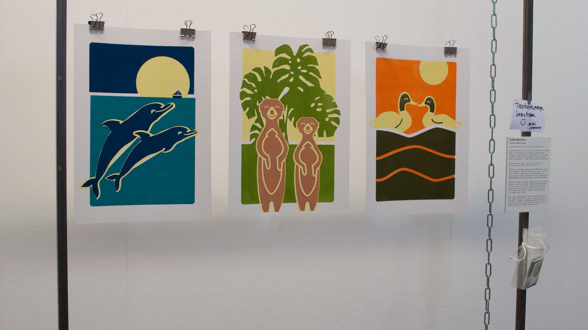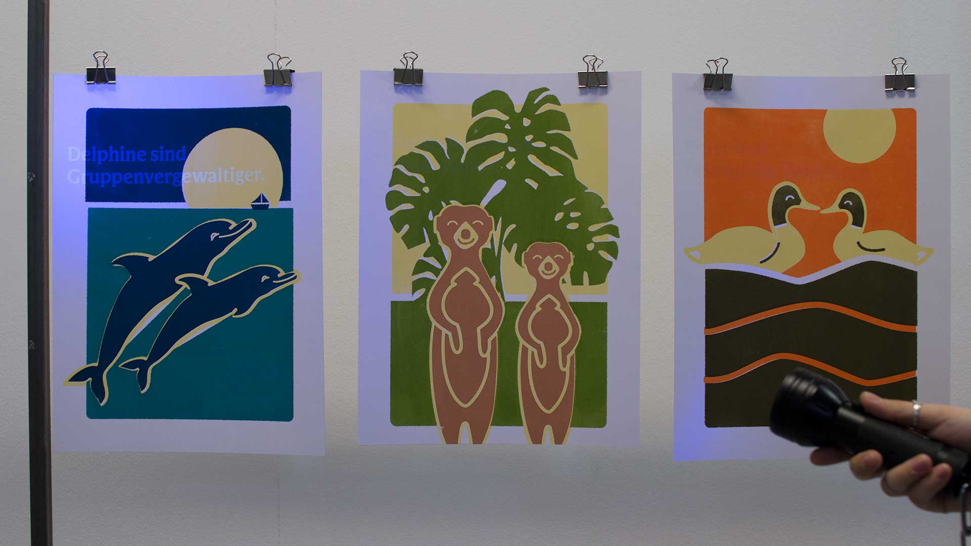 Über ein halbes Jahr hinweg haben sich die Absolventen der Meisterschule nun mit diesem Thema auseinander gesetzt und im Zuge dessen auch eine Ausstellung im Designforum organisiert. Während viele sich mit negativen Vorurteilen beschäftigt haben, setzt sich dieses Projekt damit auseinander, dass auch positive Vorurteile Missinformation enthalten. Vorurteil heißt nicht immer, dass man schlechter von etwas denkt, als es wirklich ist. Gerade im Tierreich wird verharmlost und verniedlicht beziehungsweise nicht genug informiert. Obwohl das kaum Einfluss auf den Alltag hat, gibt es Situationen, in denen dieses Wissen hilfreich wäre. Nicht alles, was glänzt, ist Gold und nicht alles, was kuschelig aussieht, sollte man kuscheln. Delphine als Triebtäter gehen bei ihrer Opfersuche - oft auch in Gruppen - ganz nach dem Motto „Loch ist Loch“ vor. Dabei machen sie keinen Halt vor anderen Spezien. Sie vergewaltigen, zu mehrt oder alleine, Surfer, Ablussrohre, Delphinweibchen und sogar Atemlöcher ihrer Delphinkumpels. Erdmännchen leben in Kolonien zusammen unter einer Königin. Treffen sie auf einen fremden Stamm, werden die erwachsenen Tiere versklavt und deren Jungtiere vor ihren Augen langsam und qualvoll getötet. Ähnlich verläuft es, wenn ein Weibchen, das nicht die Anführerin des Stammes ist, ein Junges zu Welt bringt. Enten leben normalerweise in Paaren zusammen. Findet ein Erpel jedoch kein Weibchen, geht er sexuell frustriert auf Opfersuche. Er dümpfelt und attackiert die Ente dann so lange, bis sie halbtot oder manchmal auch komplett leblos im Wasser treibt und vergeht sich dann an ihr.