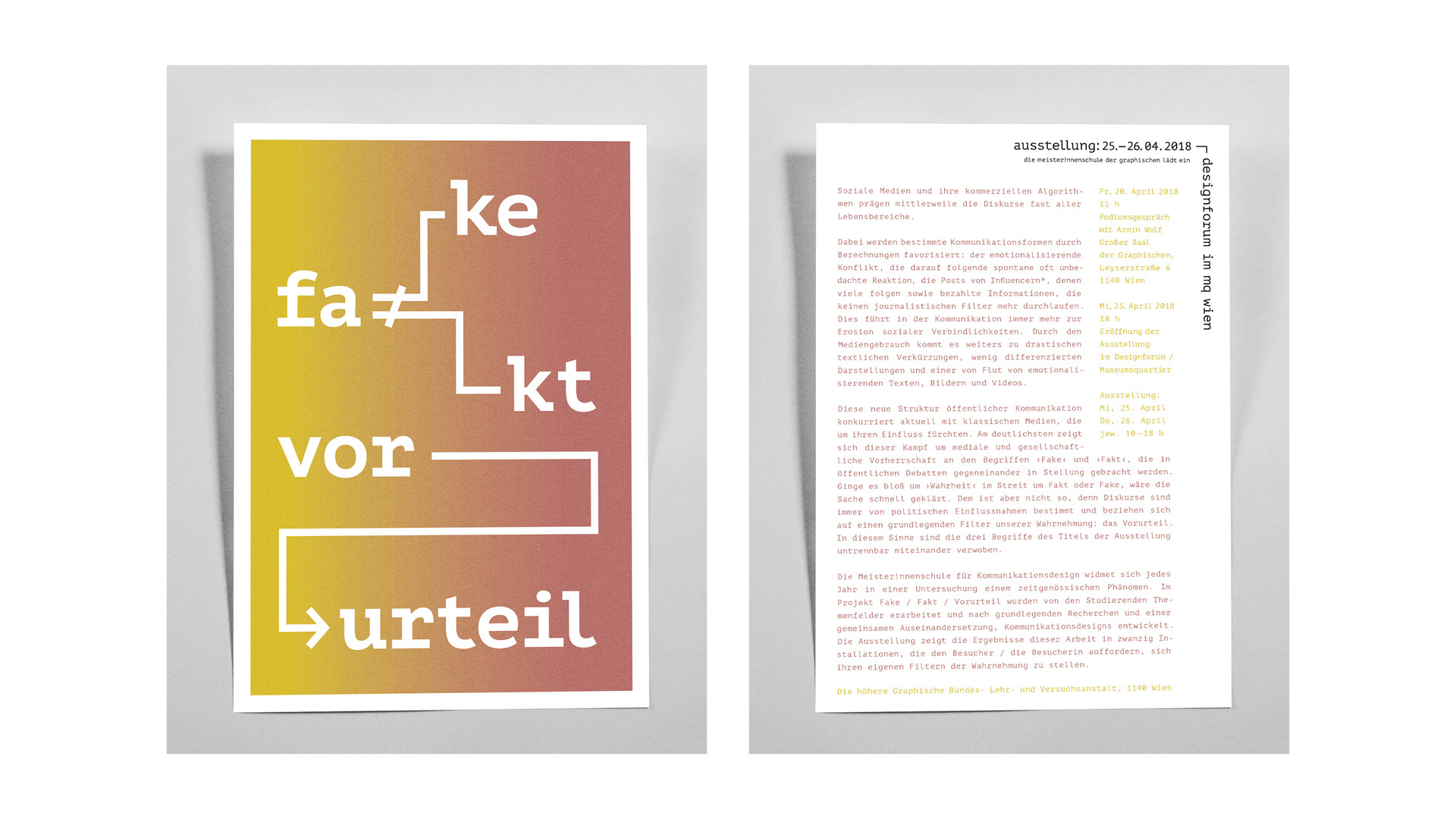 Wir leben in einer Zeit, in der man sich ständig zwischen Fake und Fakt entscheiden muss – und welche Rolle spielen hierbei Vorurteile? Das Thema der diesjährigen Semiotik-Projektausstellung schrie förmlich nach der Umsetzung einer typographischen Spielerei, das Key-Visual leitet den Betrachter visuell durch das Labyrinth des Factcheckings. Der Farbverlauf symbolisiert den unmerklichen Übergang von der Wahrheit zur Lüge. — typographische Konzeption / Beratung: Lea Hierzenberger, HaNam Tran
