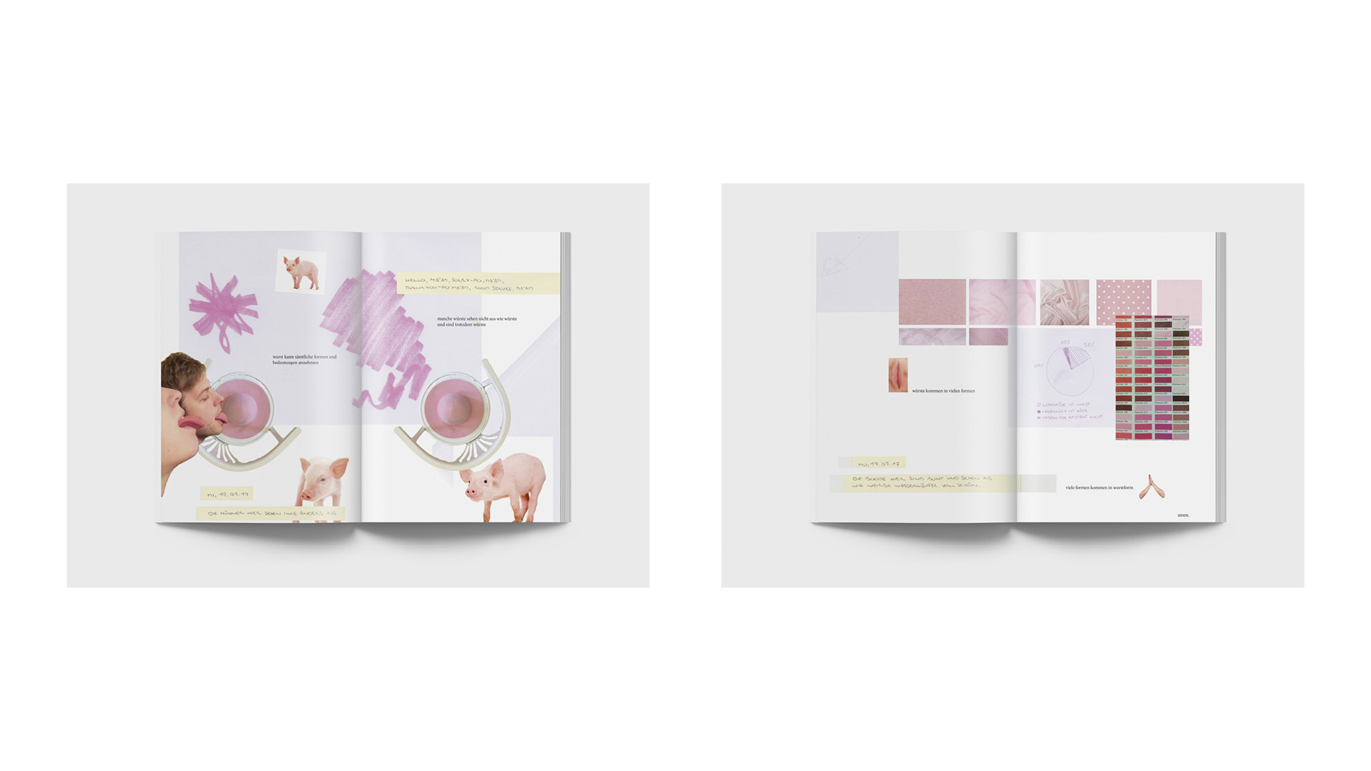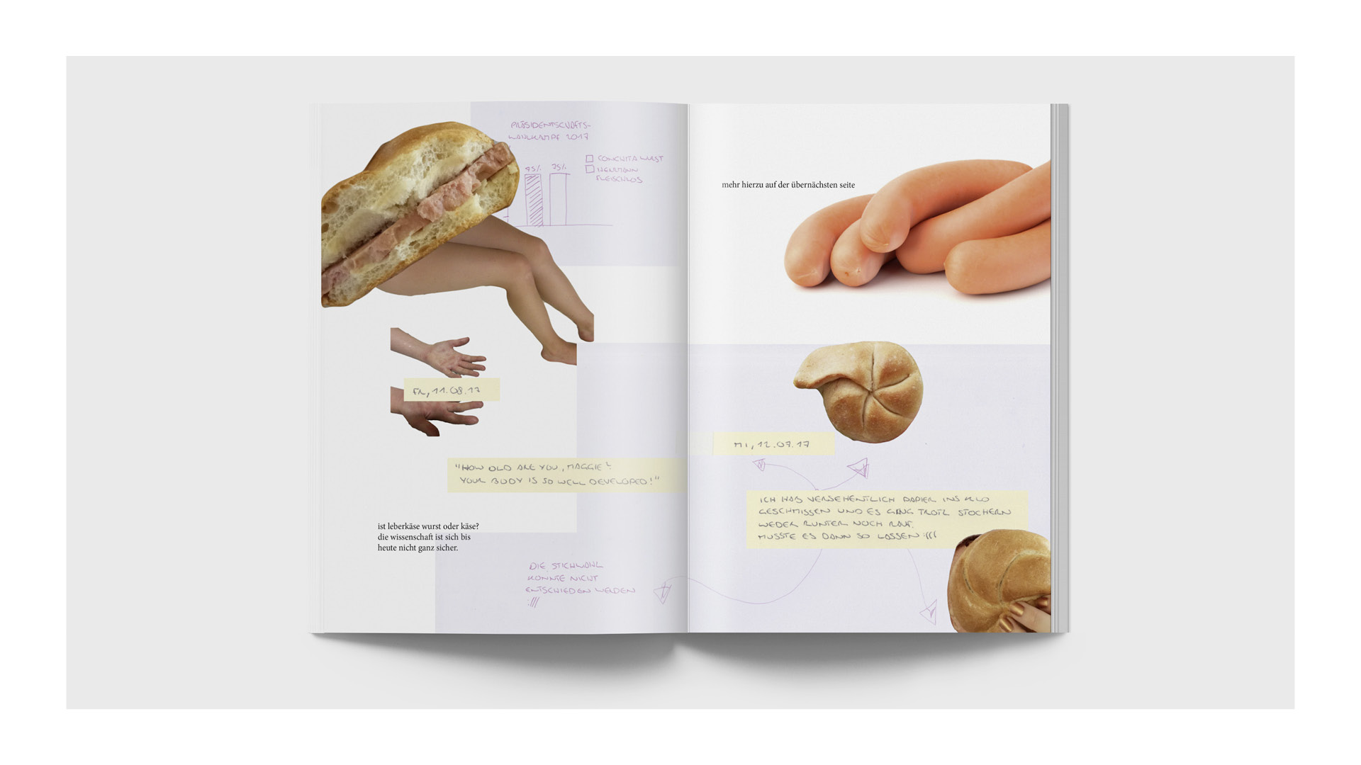 ›Your skin looks like fresh bacon, Ate Maggie‹ Mein Teil des Fanzines ist eine zufällige Kombination aus Auszügen meines Reisetagebuchs vom Sommer 2017, den ich in philippinischen Fischerdörfern verbrachte, und visualisierten Gedankenspielereien zum Thema Wurst. Was die beiden Themen verbindet? Die extreme Körperlichkeit der schwitzigen Zeit in den Tropen, wo ich vor allem durch meine helle, „rosa“ Haut herausstach: Ich wurde zum ersten Mal in meinem Leben mit dem Phänomen der Andersartigkeit durch Hautfarbe konfrontiert. Das Zine ist eine spielerisch-witzige Aufarbeitung dessen.