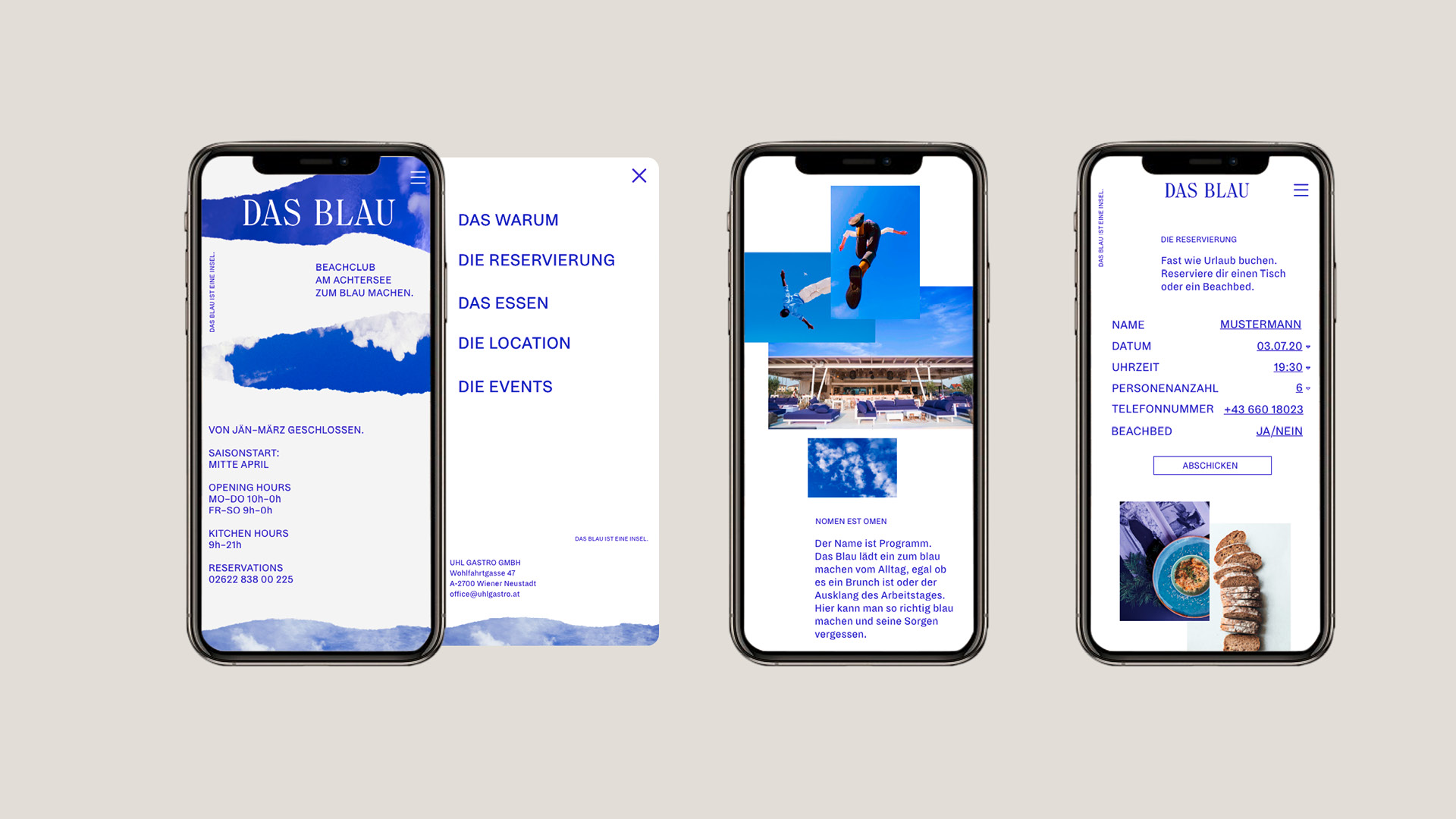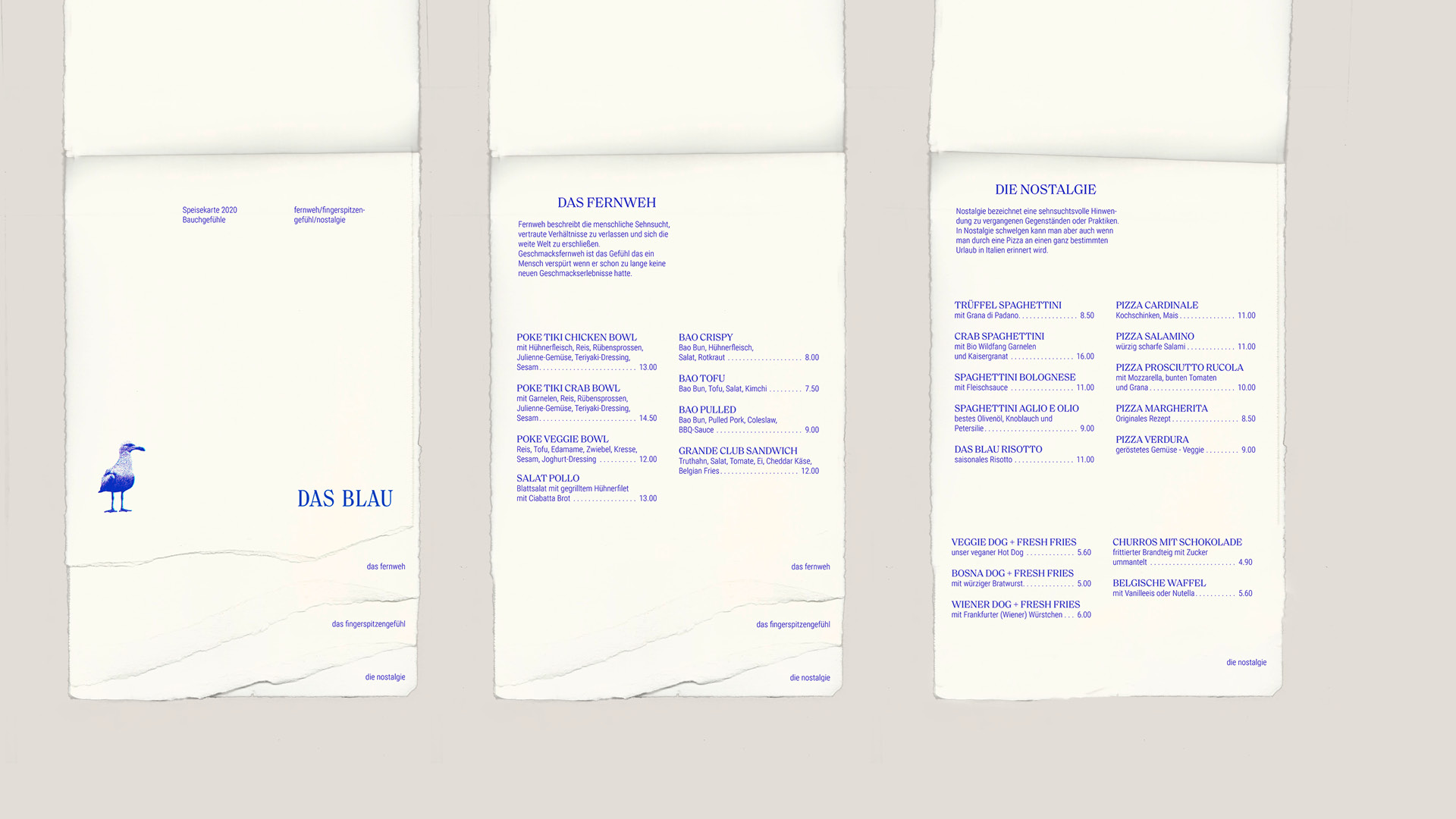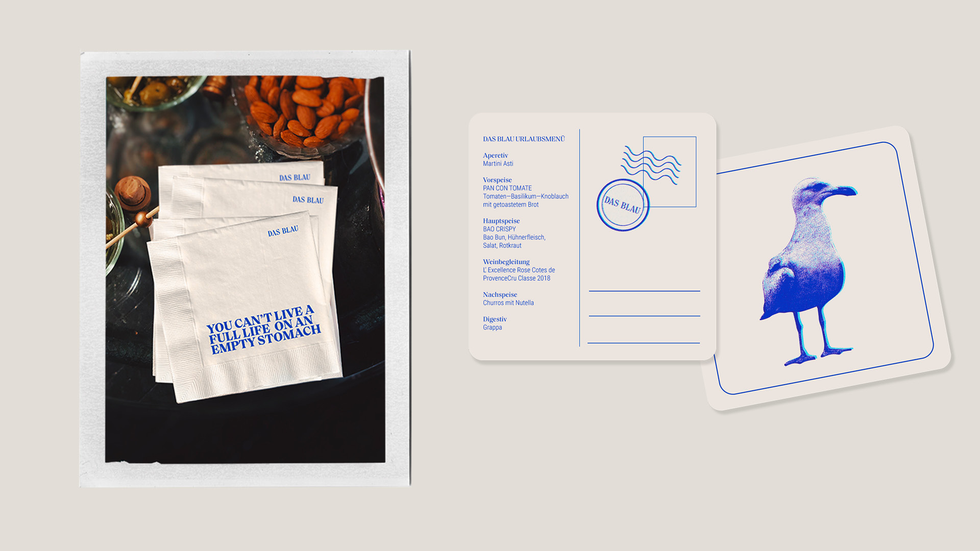 ›DAS BLAU ist eine Insel. DAS BLAU ist Urlaub für kurz‹ DAS BLAU ist ein Zufluchtsort, hier kann man blau machen vom Alltag. Der Beachclub Himmelblau wird zum DAS BLAU und gibt so eine neue Richtung vor, die weniger lieblich ist und dafür anspruchsvoller wirkt. Die Speise- und Getränkekarte wurde neu strukturiert um eine bessere Übersicht zu gewährleisten. Das Fernweh, das Fingerspitzengefühl und die Nostalgie sind Teilbereiche der Speisekarte. Die Nostalgie entführt durch italienische Gerichte in den lang vergangenen Italienurlaub, das Fernweh besticht mit asiatischen Gerichten die die Sehnsucht nach Weltenbummeln zumindest für einen kurzen Moment stillen. Die Bierdeckeln sind in Postkartenoptik, das Reservieren auf der Website fühlt sich an wie Urlaub buchen. Nomen est omen, mach blau.