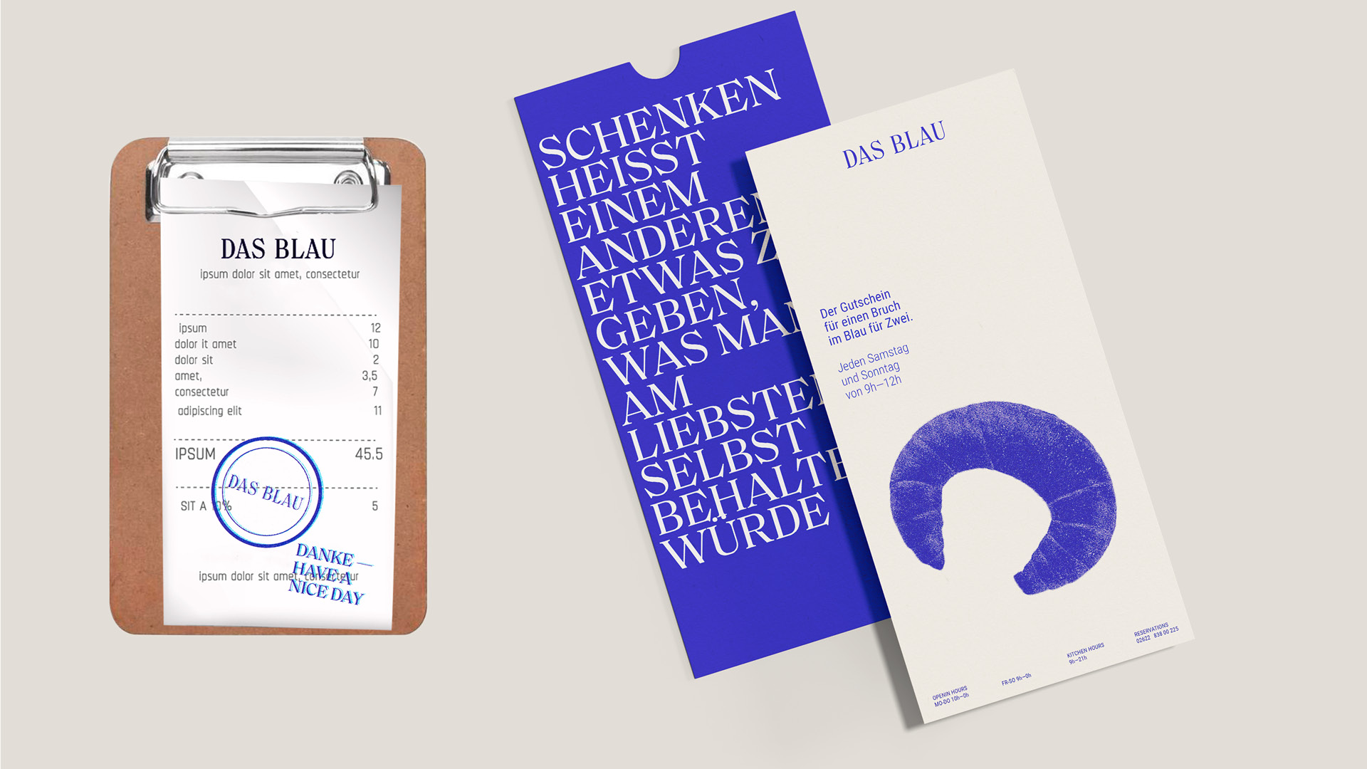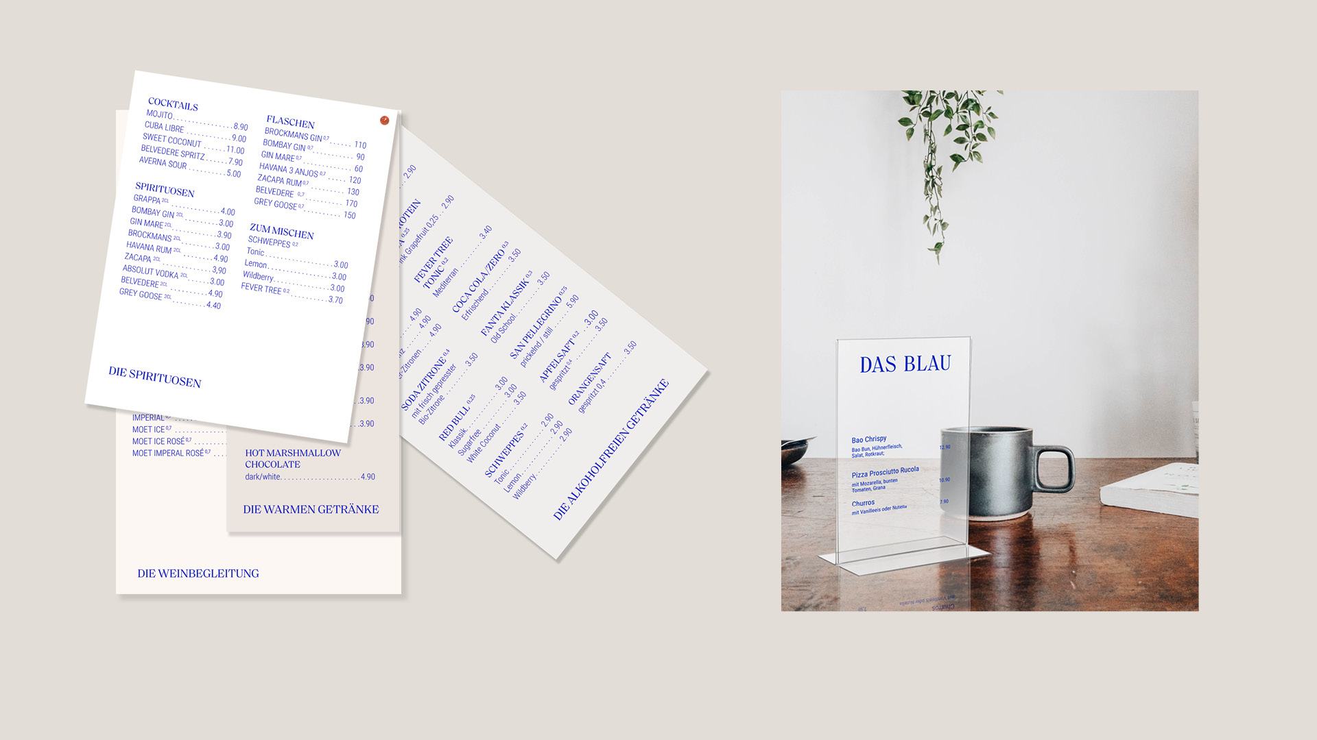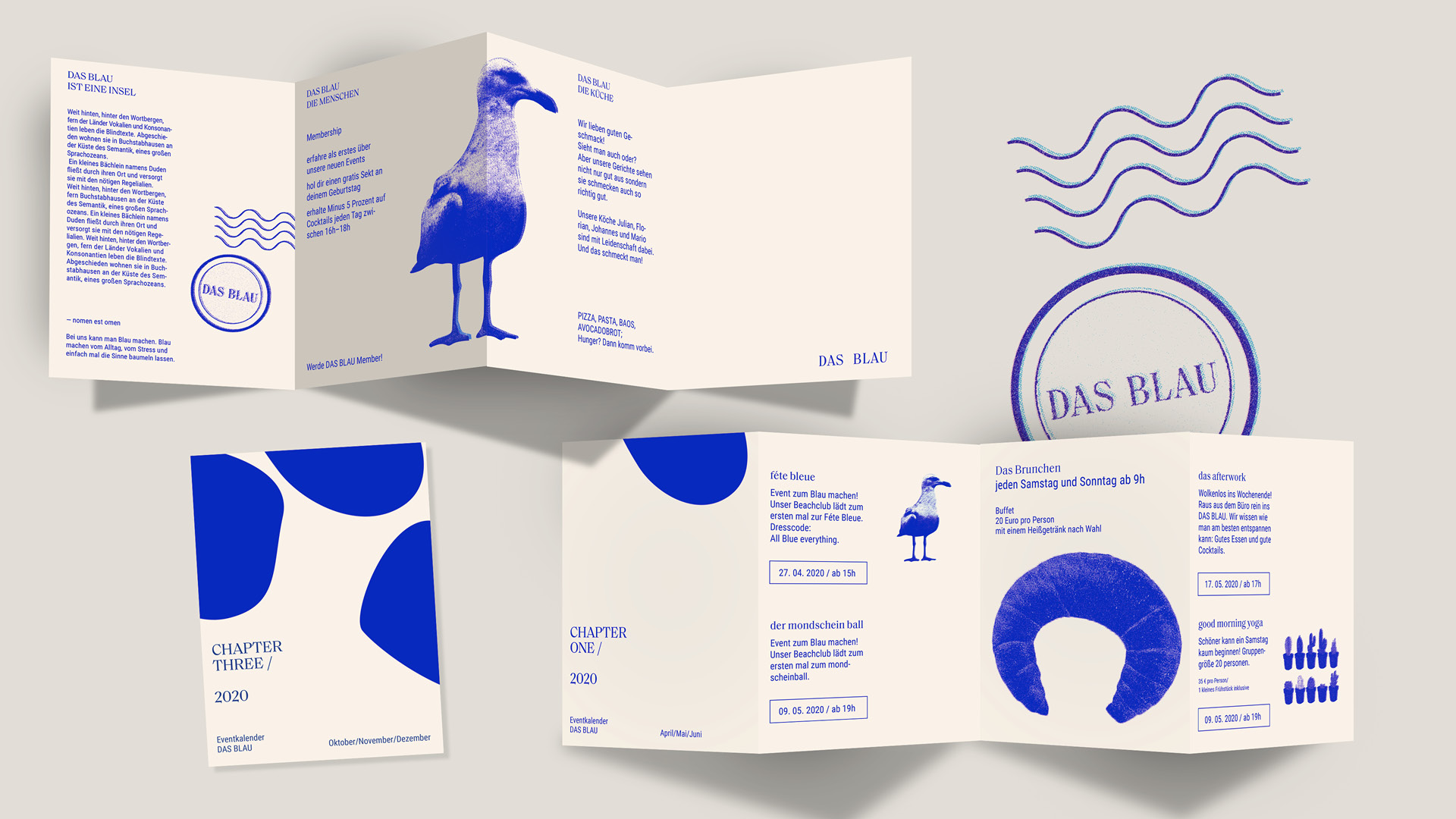 ›DAS BLAU ist eine Insel. DAS BLAU ist Urlaub für kurz‹ DAS BLAU ist ein Zufluchtsort, hier kann man blau machen vom Alltag. Der Beachclub Himmelblau wird zum DAS BLAU und gibt so eine neue Richtung vor, die weniger lieblich ist und dafür anspruchsvoller wirkt. Die Speise- und Getränkekarte wurde neu strukturiert um eine bessere Übersicht zu gewährleisten. Das Fernweh, das Fingerspitzengefühl und die Nostalgie sind Teilbereiche der Speisekarte. Die Nostalgie entführt durch italienische Gerichte in den lang vergangenen Italienurlaub, das Fernweh besticht mit asiatischen Gerichten die die Sehnsucht nach Weltenbummeln zumindest für einen kurzen Moment stillen. Die Bierdeckeln sind in Postkartenoptik, das Reservieren auf der Website fühlt sich an wie Urlaub buchen. Nomen est omen, mach blau.