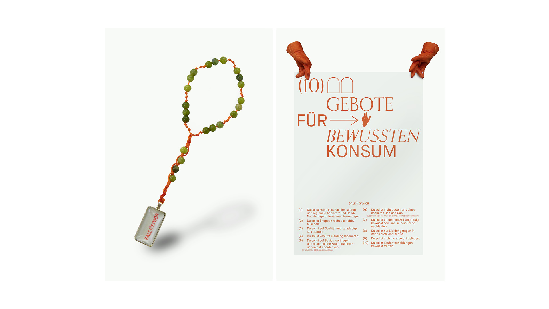 ›Leben erst alle in Reichtum und Komfort, dann, so nahm man an, werde jedermann schrankenlos glücklich sein.‹ — Erich Fromm, 1976 Die Gleichsetzung von Shopping als eine Quasireligion und das Spiel mit den Paradigmen der Religion wird zum Zentrum des Diplomprojekts, dessen Ziel es ist Personen zu bewussterem Konsum zu animieren. Die Awarnesskampagne löst sich von einem geradlinigen Kommunikationsstil und gibt so den Rezipienten die Chance alle Erkenntnisse, die weitergegeben werden sollen, selbst zu erarbeiten. Marken sind im Sinne der Quasireligion die Götter unserer Zeit, in diesem Sinne wird auch eine neue Marke geschaffen: SALE&SAVIOR. Der vermutliche Onlineshop SALE&SAVIOR präsentiert sich auf den ersten Blick wie eine neumoderne Luxusmarke, die mit ihrem ästhetischen Auftreten interesse wecken soll. Die Website birgt, neben Produkten für bewussten Konsum, allerdings auch sehr viele Referenzen zur Religion. Neben dem paradoxen Angebot von Produkten die helfen sollen weniger zu konsumieren wirken auch die Religionsreferenzen kurios. Die Userjourney führt allerdings über jeden Weg hin zur Shopping Bibel, einer Broschüre die einen 14-tägigen Guide beinhaltet der helfen soll Achtsamkeit zu kultivieren und dadurch auch zu bewussteren Konsum führen soll. Das Endprodukt ist eine konsumkritische Awarnesskampagne die mit religiösen Referenzen spielt um einen Wertewandel bei den Rezipienten zu unterstützen.