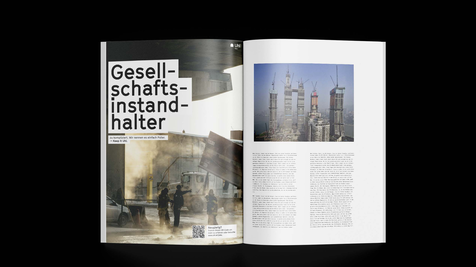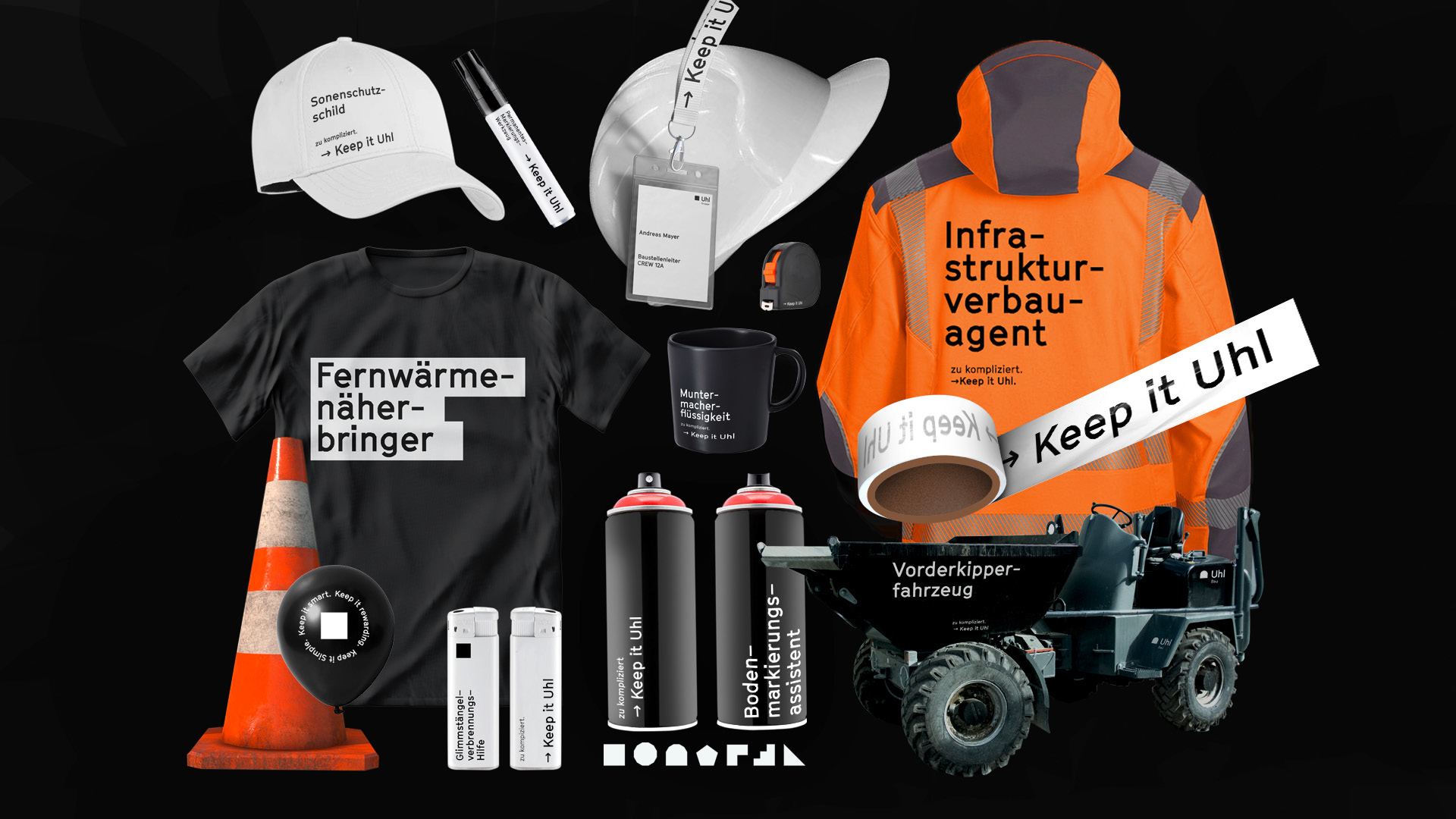 ›Keep it Uhl.‹ Fernwärmenäherbringer, Gesellschaftsinstandhalter, Infrastruktur-verbauagent. Zu kompliziert? ›Keep it Uhl‹ Das Jobselling nimmt die Berufe der Mitarbeiter von Uhl Bau wortwörtlich, sie sind nicht einfach nur Polier, sondern Gsellschaftsinstandhalter. Ein Rohrverleger wird zum Infrastrukturverbauagenten, genau so kann man das ansehen der Berufe in der Uhl Gruppe steigern und qualifiziertere Fachkräfte anwerben. Weitere Anwendungen wie auf dem Feuerzeug, oder auch Glimmstängelverbrennungshilfe genannt bringen den Humor ins Spiel, den die Marke Uhl sympathisch macht. — mit Waldemar Grunt