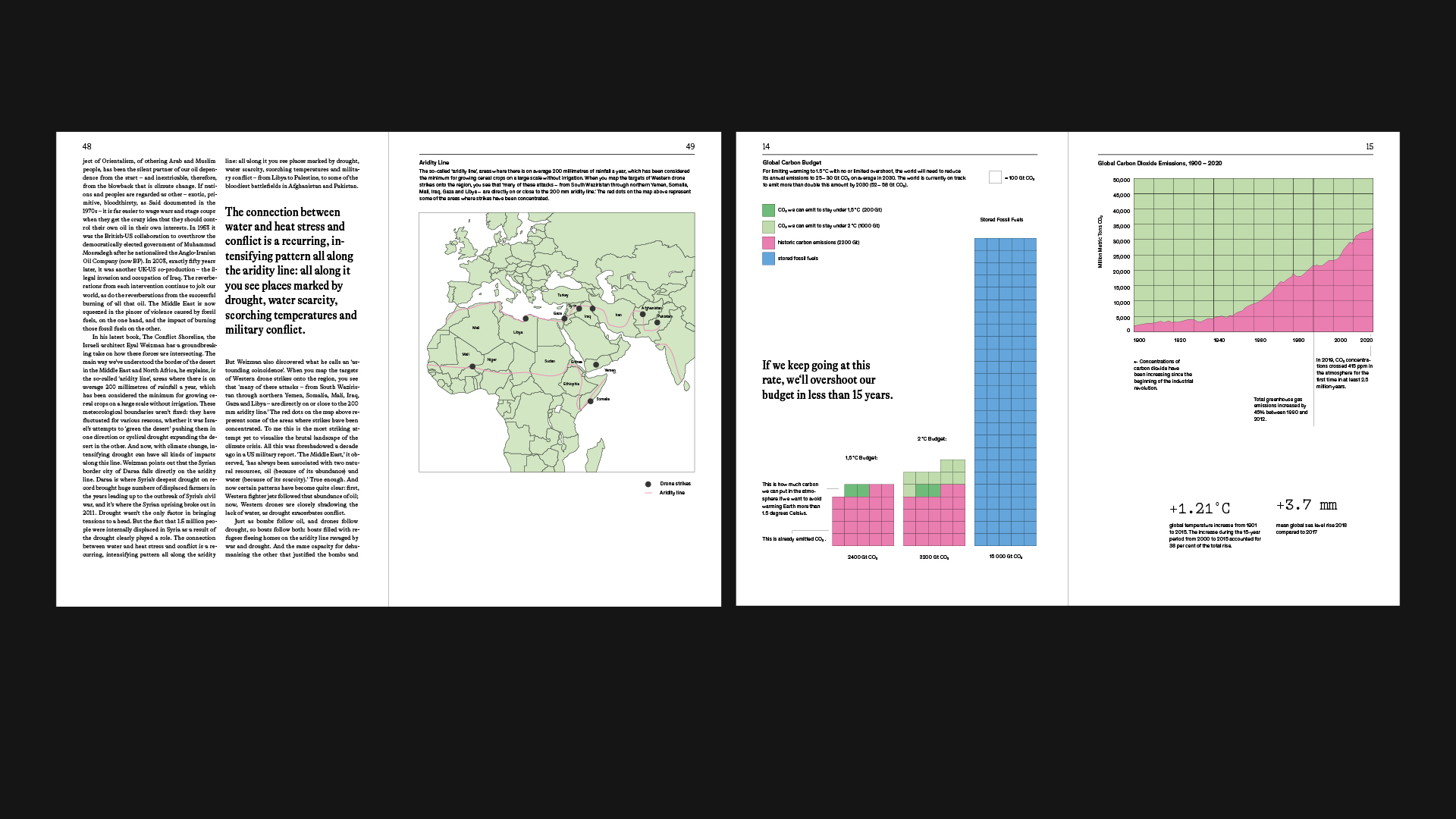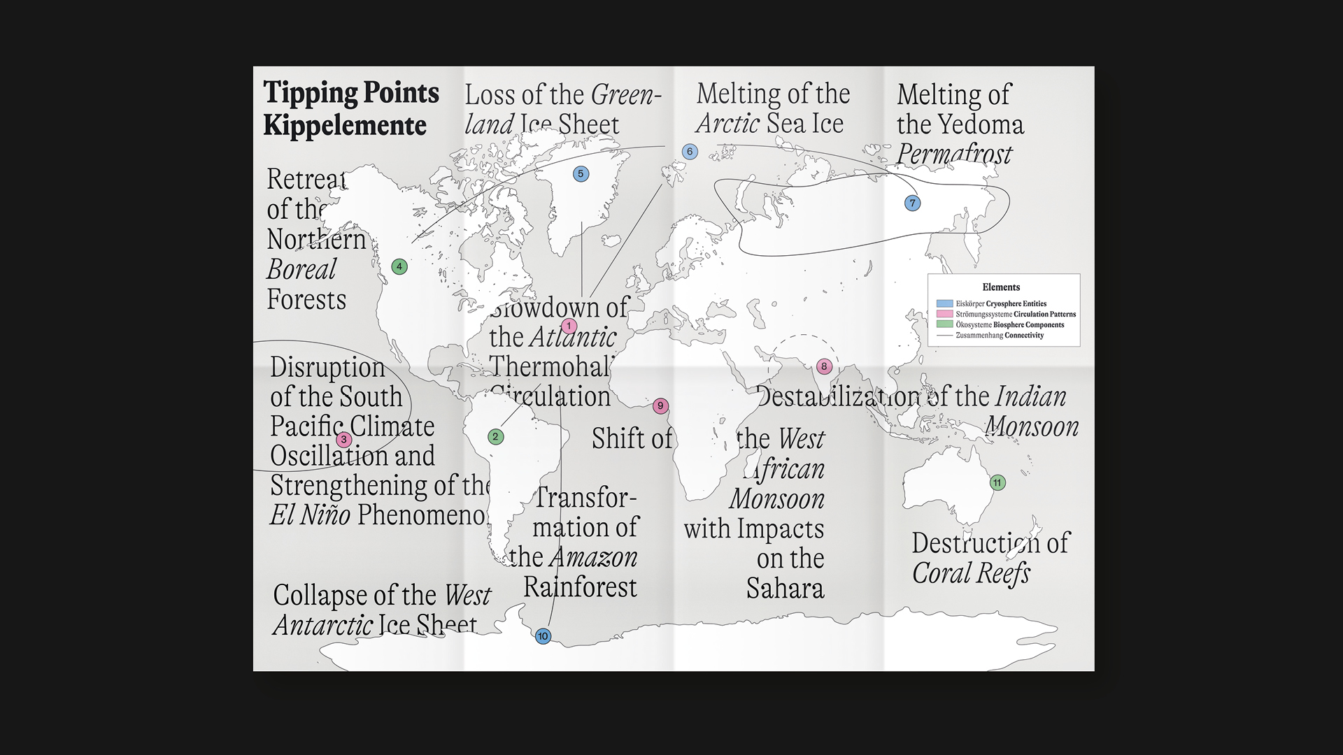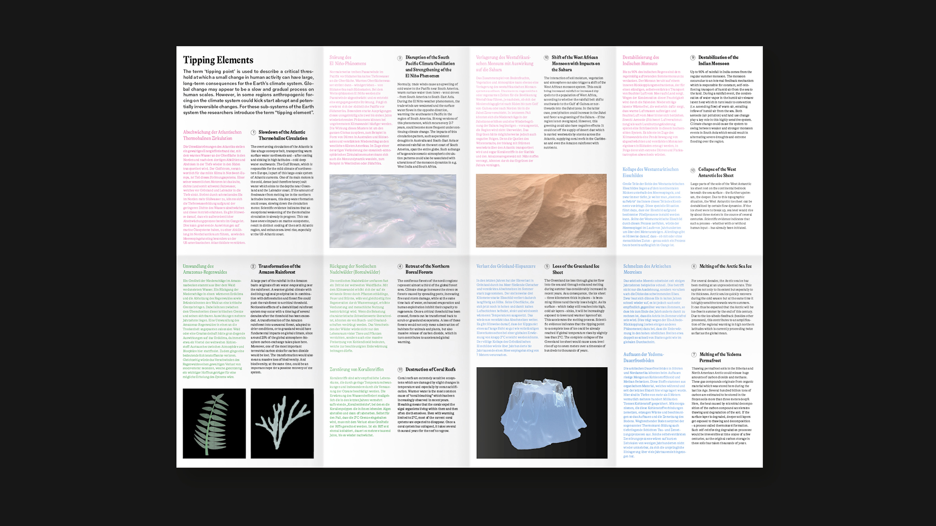 EINE GESTALTERISCHE AUSEINANDERSETZUNG MIT DER KLIMAKRISE Das Projekt 1,5 Grad behandelt die Klimakrise, die damit verbundenen Folgen und macht darauf aufmerksam, wie wenig Zeit noch bleibt, um das Schlimmste zu verhindern.Das Ergebnis ist eine faltbare Weltkarte, welche die Kipppunkte (Teile des Klimasystems, die bei erhöhten Temperaturen sehr schnell ›kippen‹ können und dadurch weitere Klimaveränderungen mit sich bringen) veranschaulicht. Dazu ist ein dünner Info-Atlas entstanden, welcher längere Texte und Infografiken beinhaltet.
