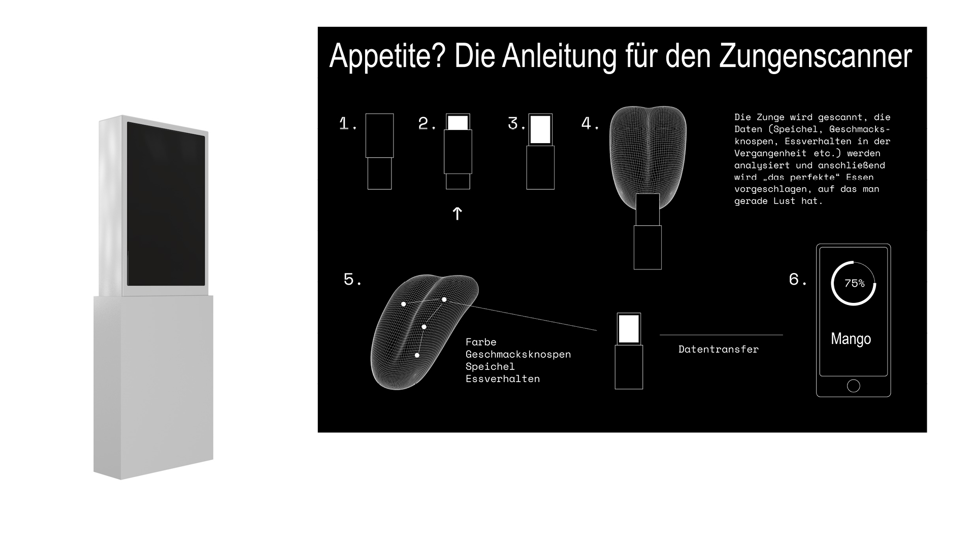 Biometrische Daten werden schon sehr häufig gesammelt und ausgewertet, von der Health App am Handy bis hin zu komplizierten Mustererkennungsalgorithmen in der Medizinforschung. Deswegen ist eine KI, die anhand Daten von Zungen das gewünschte Essen bestimmen kann, gar nicht so weit hergeholt. Anleitung: Die Zunge wird gescannt, die Daten (Speichel, Geschmacksknospen, Essverhalten in der Vergangenheit  etc.) werden analysiert und anschließend wird ›das perfekte‹ Essen vorgeschlagen, auf das man gerade Lust hat.