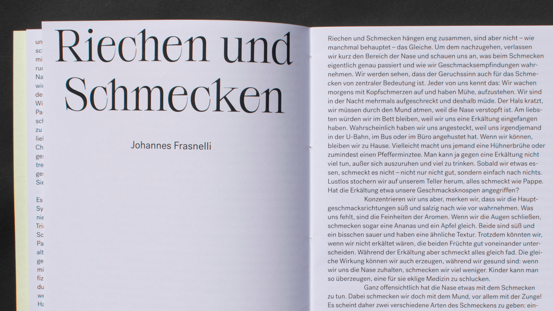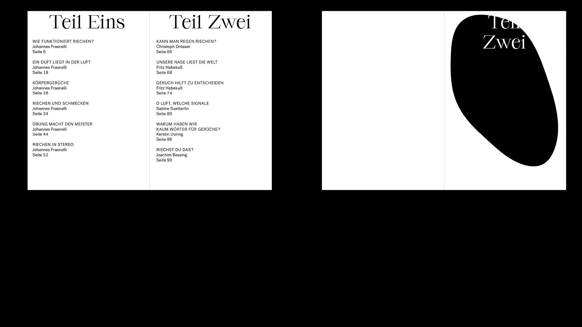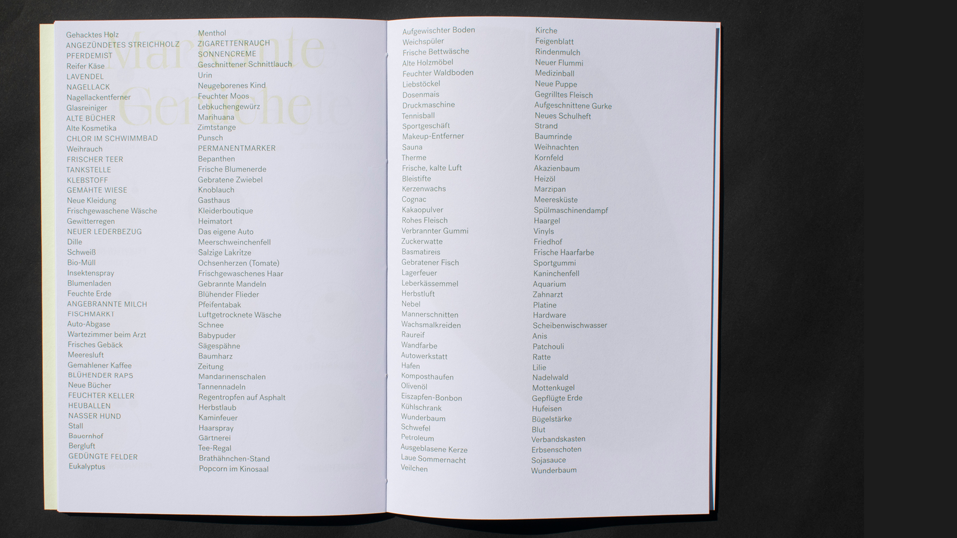 ›Raumduft ist Small Talk. Aufgeführt wird ein Gespräch, das einem nichts sagt.‹ Das Ziel der Arbeit war das gestalterische Aufarbeiten eines komplexen, wissenschaftlichen Themas, nämlich des menschlichen Geruchssinnes. In der entstandenen Arbeit wurden zwei Textquellen verwendet, die in dem Buch in zwei Teilen sichtbar werden. Im ersten Teil wurden einige Kapitel aus dem Buch "Wir riechen besser als wir denken" von Johannes Frasnelli, im zweiten Teil sechs Artikel aus der Wochenzeitung "Die Zeit" verwendet. In der Mitte des Werkes befindet sich ein kurzes Insert, das eine Umfrage zum Thema "Gerüche, die man mag – oder eben nicht mag" illustriert. Zusätzlich werden auf einer Doppelseite zahlreiche Gerüche gelistet. Die abstrakte Form zweier Nasenlöcher findet sich als konstantes, sekundäres Stilelement in der Publikation wieder.