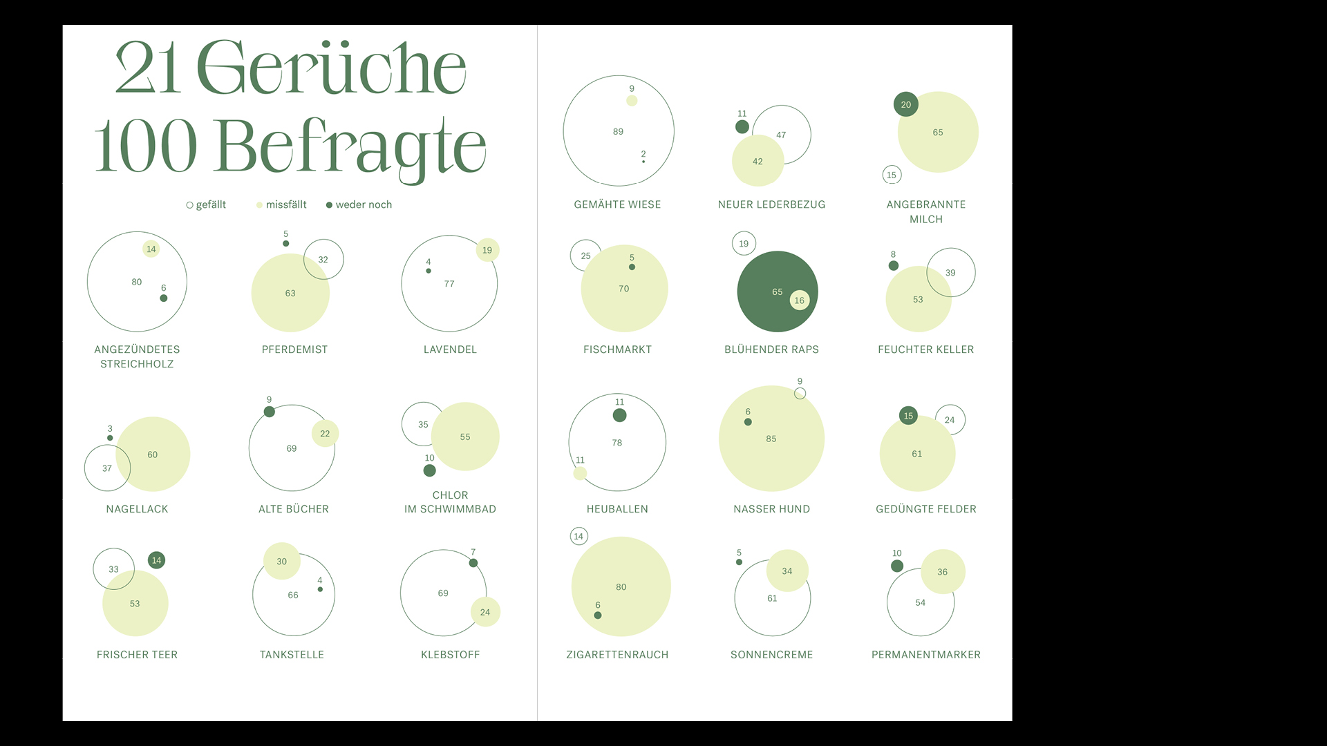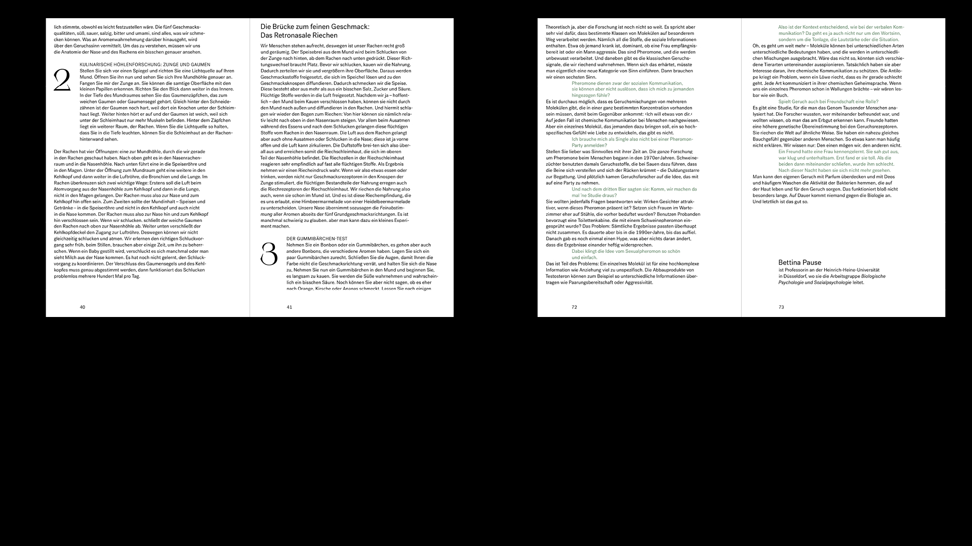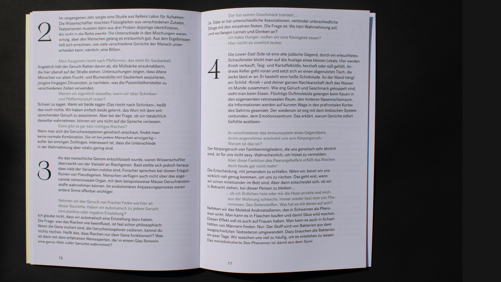 ›Raumduft ist Small Talk. Aufgeführt wird ein Gespräch, das einem nichts sagt.‹ Das Ziel der Arbeit war das gestalterische Aufarbeiten eines komplexen, wissenschaftlichen Themas, nämlich des menschlichen Geruchssinnes. In der entstandenen Arbeit wurden zwei Textquellen verwendet, die in dem Buch in zwei Teilen sichtbar werden. Im ersten Teil wurden einige Kapitel aus dem Buch "Wir riechen besser als wir denken" von Johannes Frasnelli, im zweiten Teil sechs Artikel aus der Wochenzeitung "Die Zeit" verwendet. In der Mitte des Werkes befindet sich ein kurzes Insert, das eine Umfrage zum Thema "Gerüche, die man mag – oder eben nicht mag" illustriert. Zusätzlich werden auf einer Doppelseite zahlreiche Gerüche gelistet. Die abstrakte Form zweier Nasenlöcher findet sich als konstantes, sekundäres Stilelement in der Publikation wieder.