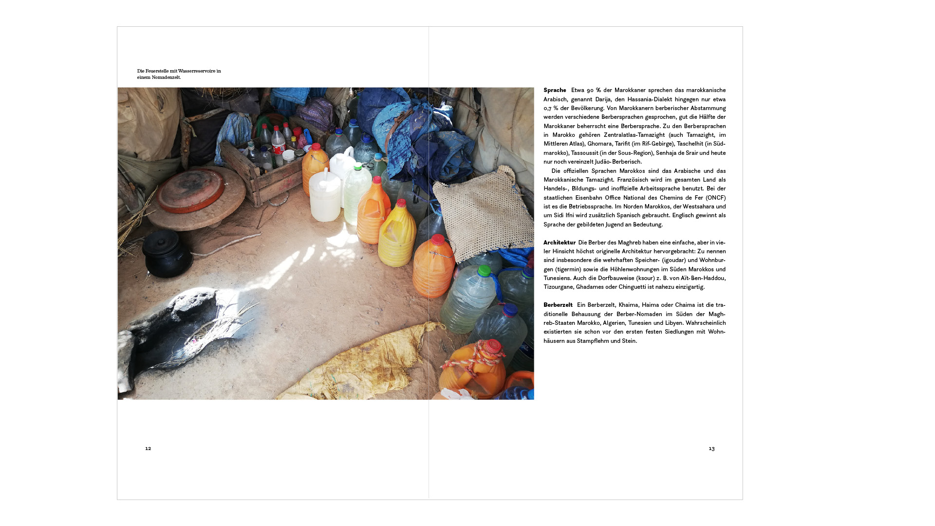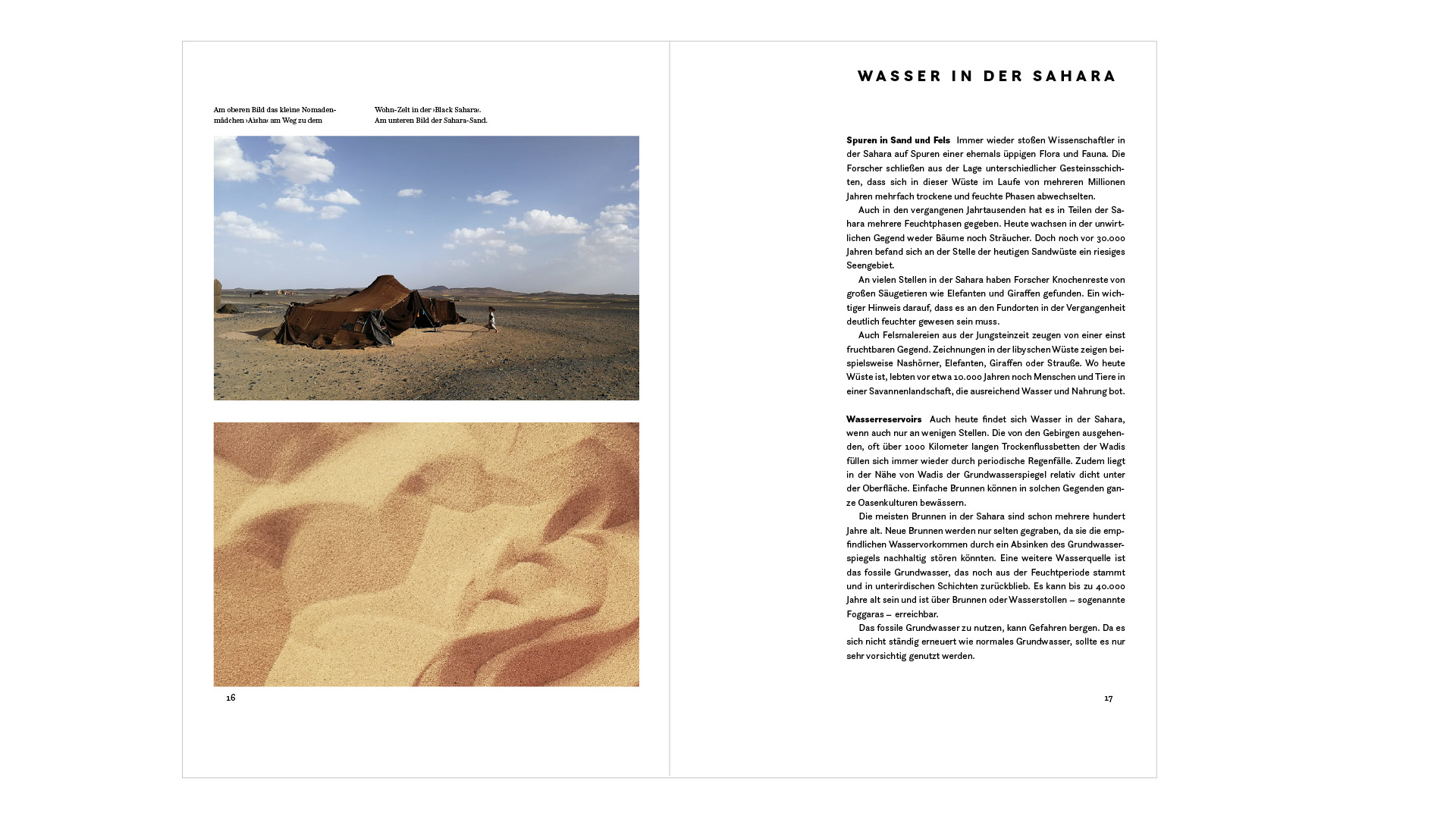 Das Sachbuch ›Hammada, Serie und Erg‹, auf Deutsch ›Stein-, Geröll- und Sandwüste‹ ist bei dem Workshop von Jost Hochuli entstanden. Es behandelt die Wüstenlandschaft Marokkos in all ihren Facetten, wobei das zurückgehaltene Design, die auf einer Reise entstandenen Bilder, noch mehr hervorheben sollen. Das Buch beinhaltet die Kapitel: Land der Sonne, Nomaden und Berber, Die Wüste wächst, Fauna und Flora, sowie Wasser in der Sahara.