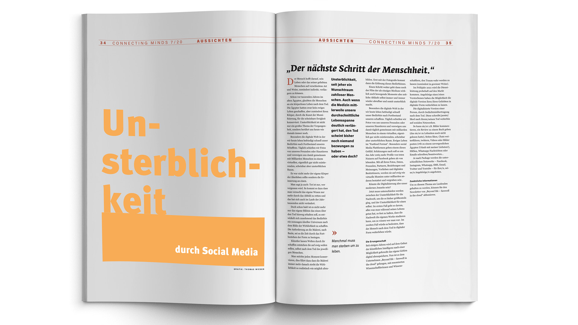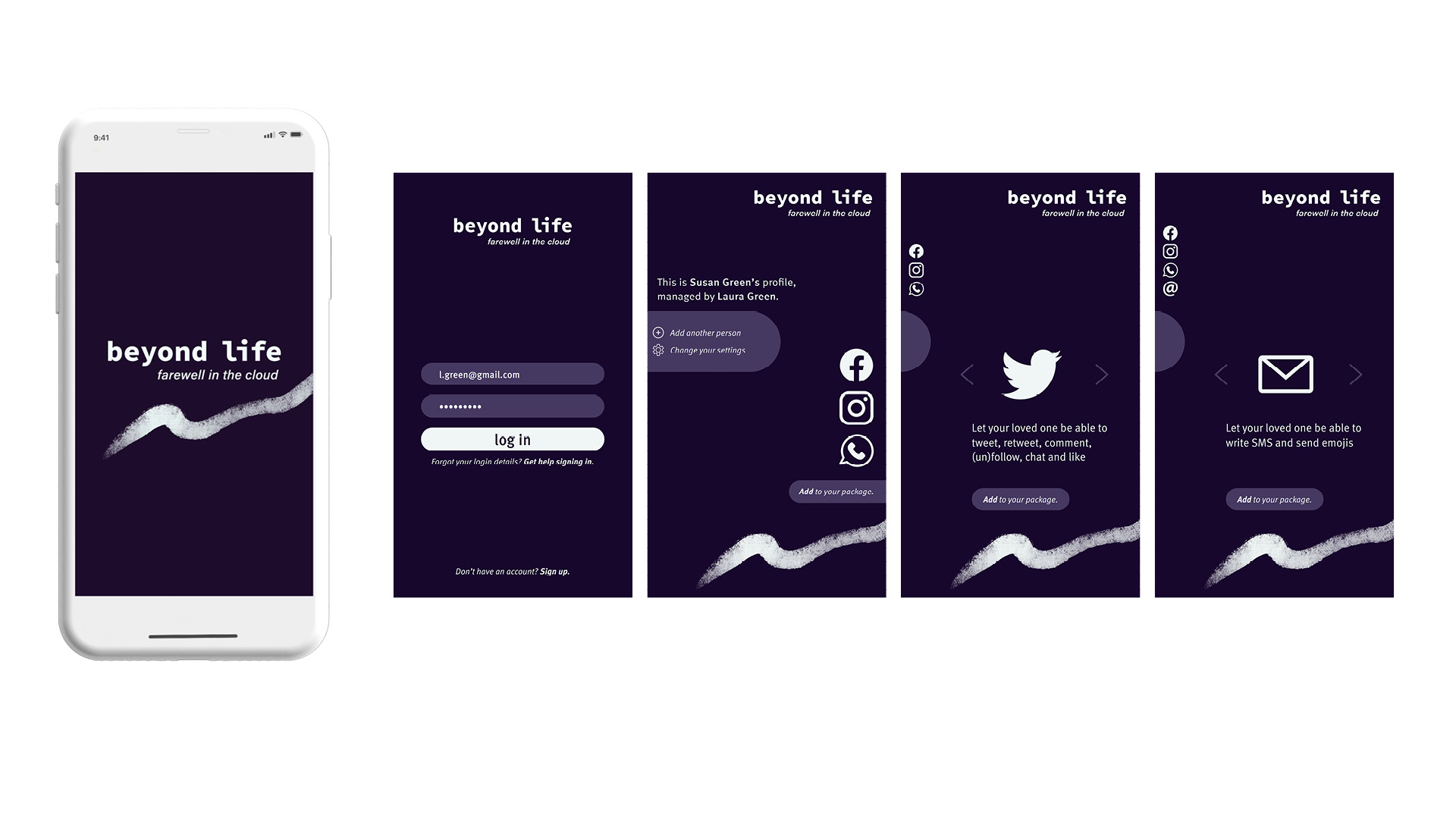 ›Der nächste Schritt der Menschheit.‹ Die US-Amerikanische APP ›beyond life – farewell in the cloud‹ ist für Personen, die einen geliebten Menschen verloren haben. Durch soziale Netzwerke können sie Angehörige digital weiterleben lassen, um ihren Verlust besser verarbeiten zu können.