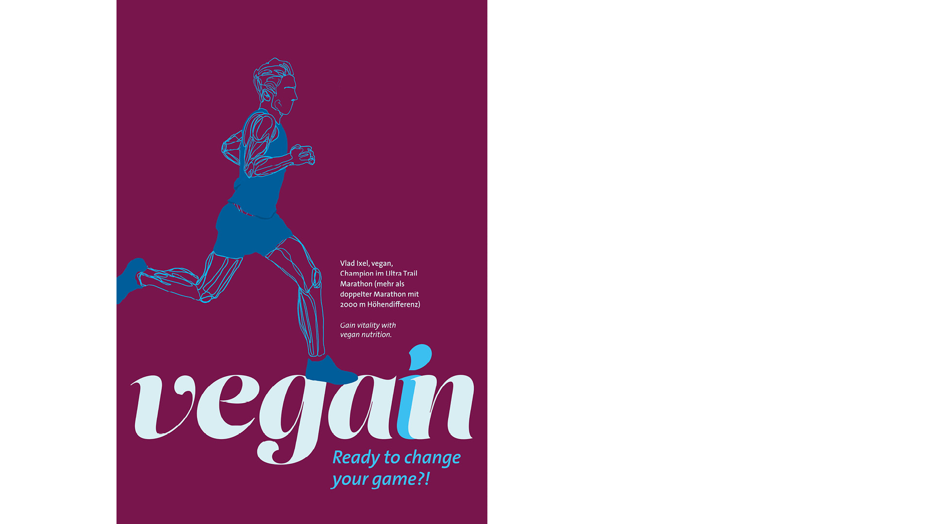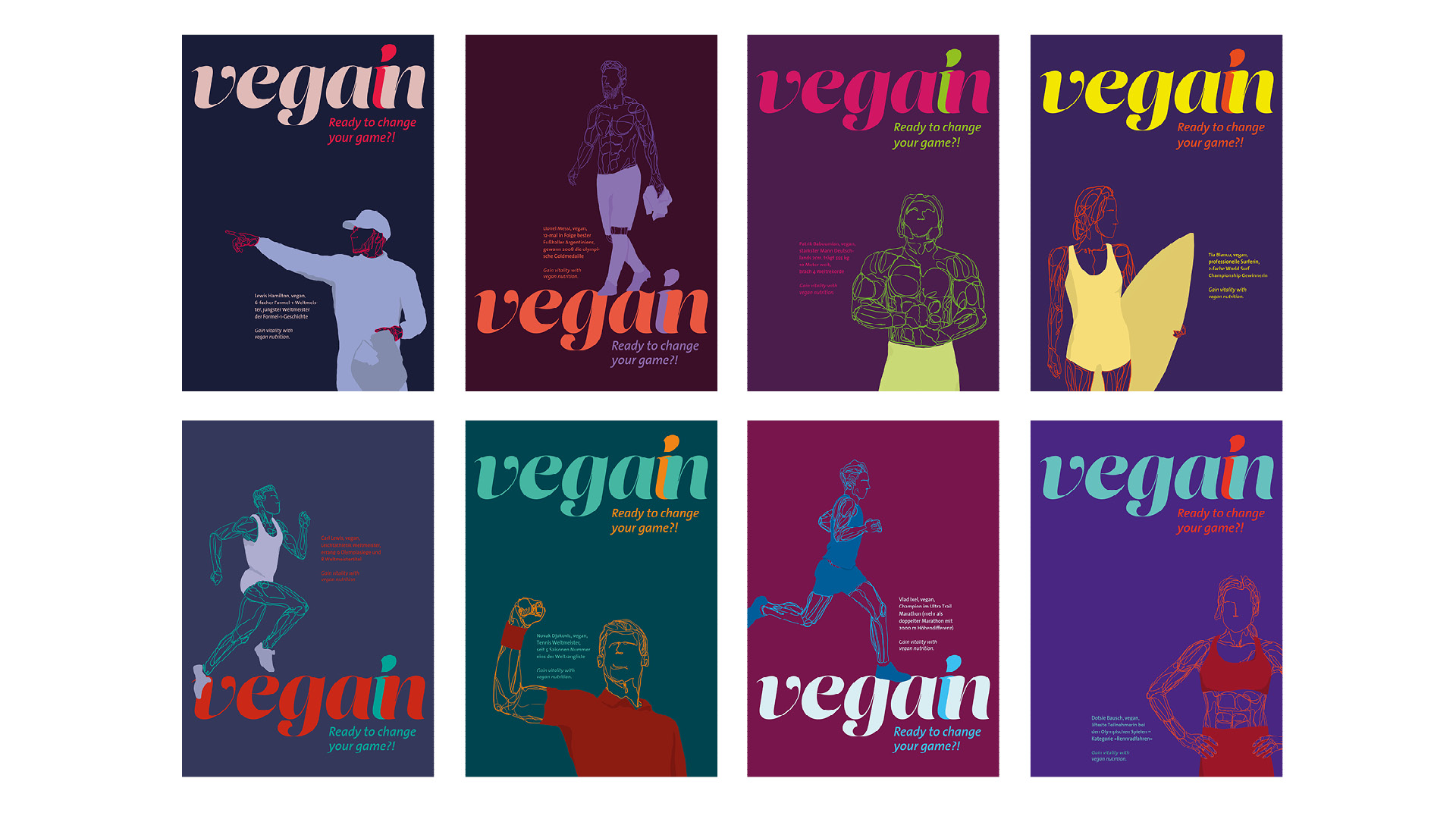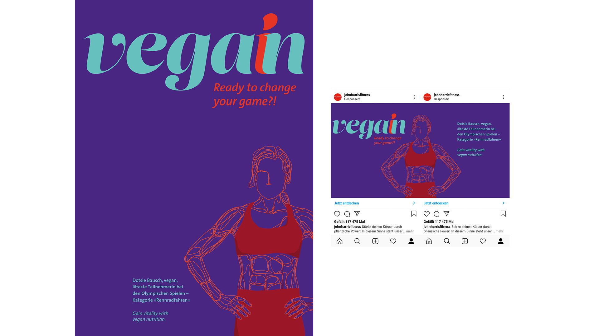 Durch das gestalten einer Kampagne soll ein Imagewandel entstehen bzw. das Thema vegane Ernährung einer bestimmten Zielgruppe nähergebracht werden. Es wurde eine Plakatreihe entwickelt, die in unterschiedlichen Fitnessstudios aufgehängt wird. Diese Plakate sollen sowohl als Print-Sujets in Fitness-Magazinen, als auch in Form von Instagram-Beiträgen auf der Seite des Unternehmens veröffentlicht werden. Zusätzlich wurden diverse GIFs/Videos animiert, die ebenfalls im Instagram Account gepostet werden können. Die sportlichen Höchstleistungen sorgfältig ausgewählter, veganer Athletinnen und Athleten werden kurz und prägnant in einem Text erfasst. Die harmonischen, jedoch kontrastreichen Farben bilden gemeinsam mit den technoiden Illustrationen und der auffälligen Typografie ein interessantes Gesamtwerk.