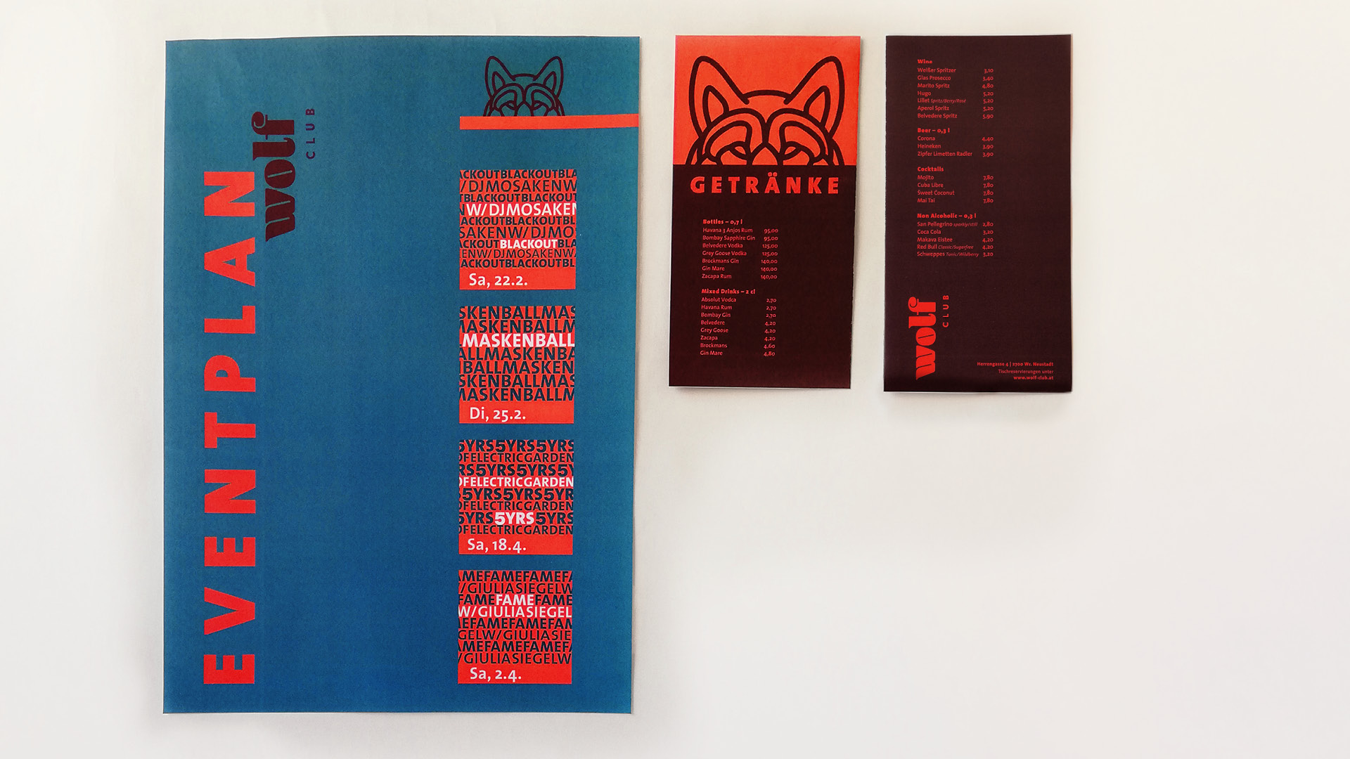 Für den Nachtclub ›Wolf Club‹ ist ein Logo, Plakat, Icon und eine Getränkekarte entstanden.