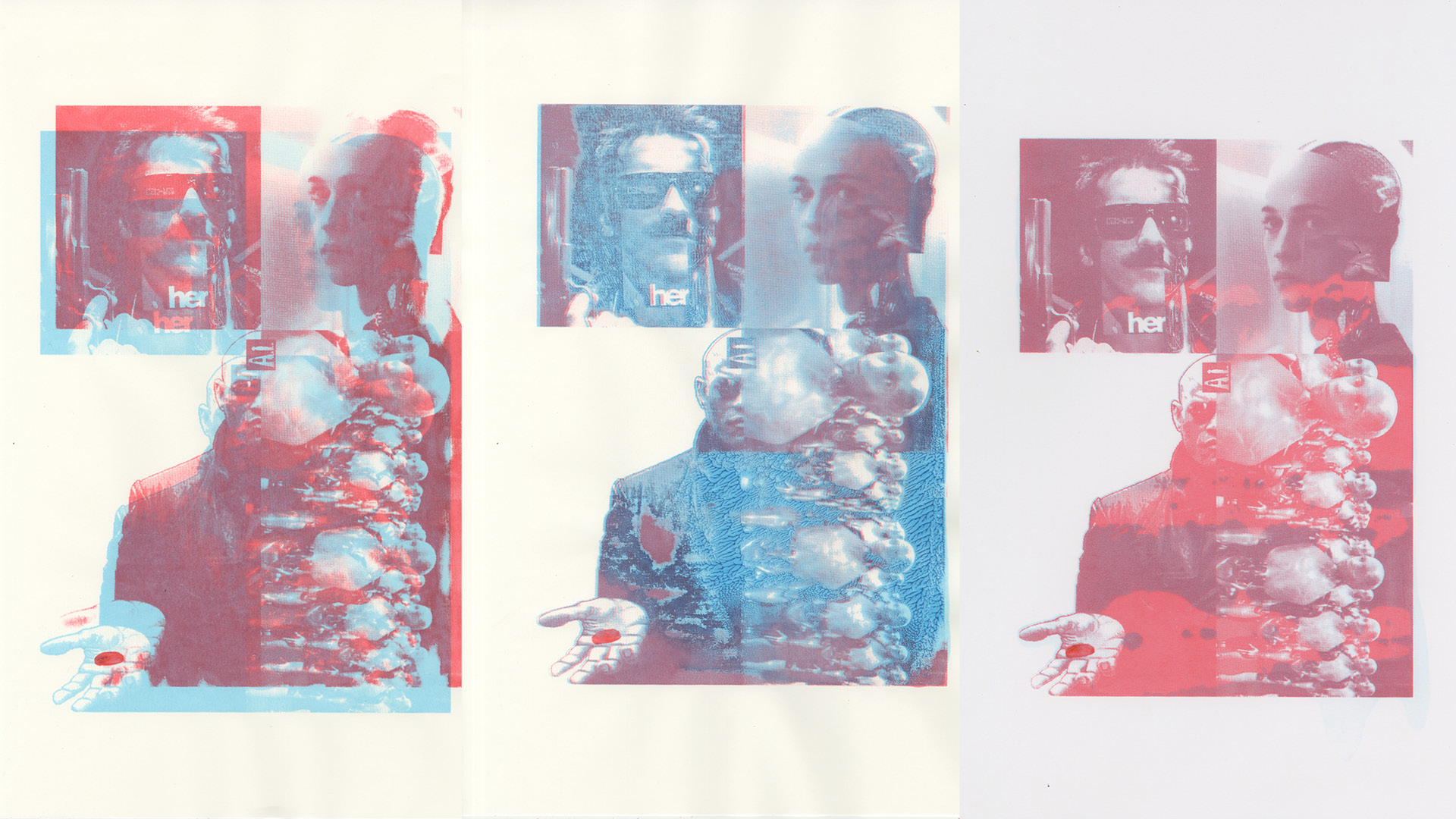 Das erste Projekt behandelt ebenfalls die Wüste. Wie auch die Schichten beim Sand, wurde hier in mehreren Lagen gedruckt. Die vier verschiedenen Filme behandeln auf unterschiedliche Weise das Thema künstliche Intelligenz.