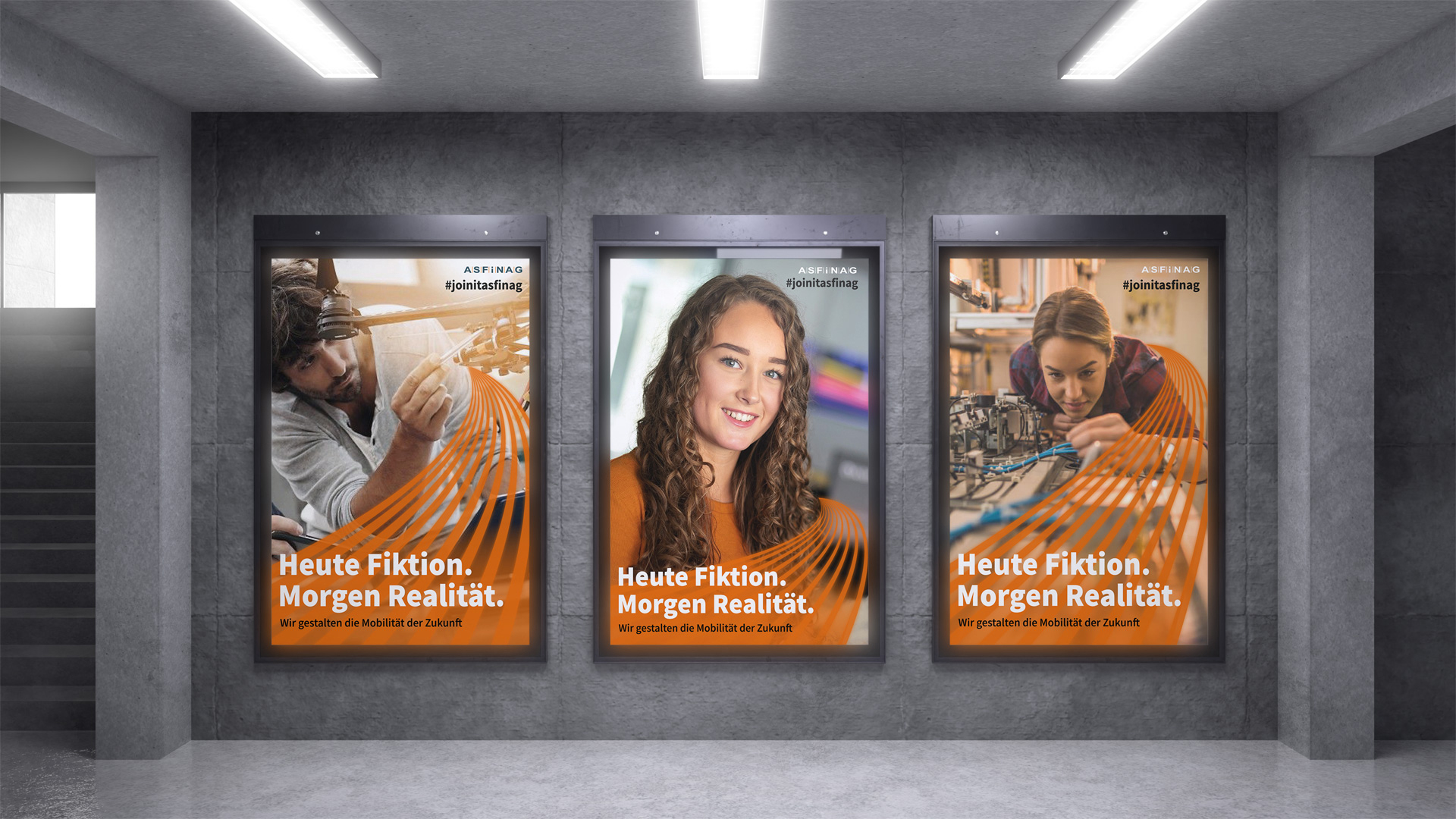 ›Heute Fiktion. Morgen Realität.‹ Mit dem Ziel die digitalen Leistungen der IT an den Autobahnen sichtbar zu machen, sollte das Image vom reinen Straßenaspekt zu „mehr als nur Autobahn“ verändert werden. Die futuristische Anmutung der Gestaltung zeigt die spannende und abwechslungsreiche Arbeit in der IT und bereitet ihren Mitarbeitern den Weg in die Zukunft der Mobilität. Dabei vereinen die Realbilder und das Leitmotiv Fiktion und Realität. Die Landingpage leitet den Interessenten von der Einleitung zu ASFINAG bis hin zur Vorstellung der IT-Abteilung und bietet anschließend die Möglichkeit zur Bewerbung. Für den gesamten online Auftritt wurden die Social-Media Plattformen angepasst, sowie die Arbeitgeberplattform Kununu aufbereitet. Als Printmedien sind Werbeplakate mit dem Keyvisual und den IT-Mitarbeitern gestaltet und Give Aways konzipiert. — mit Karin Weinhandl