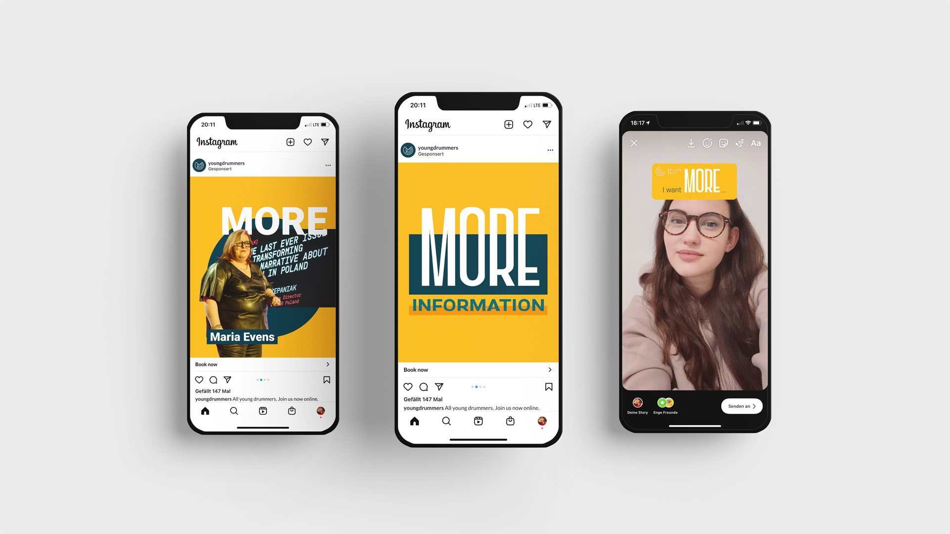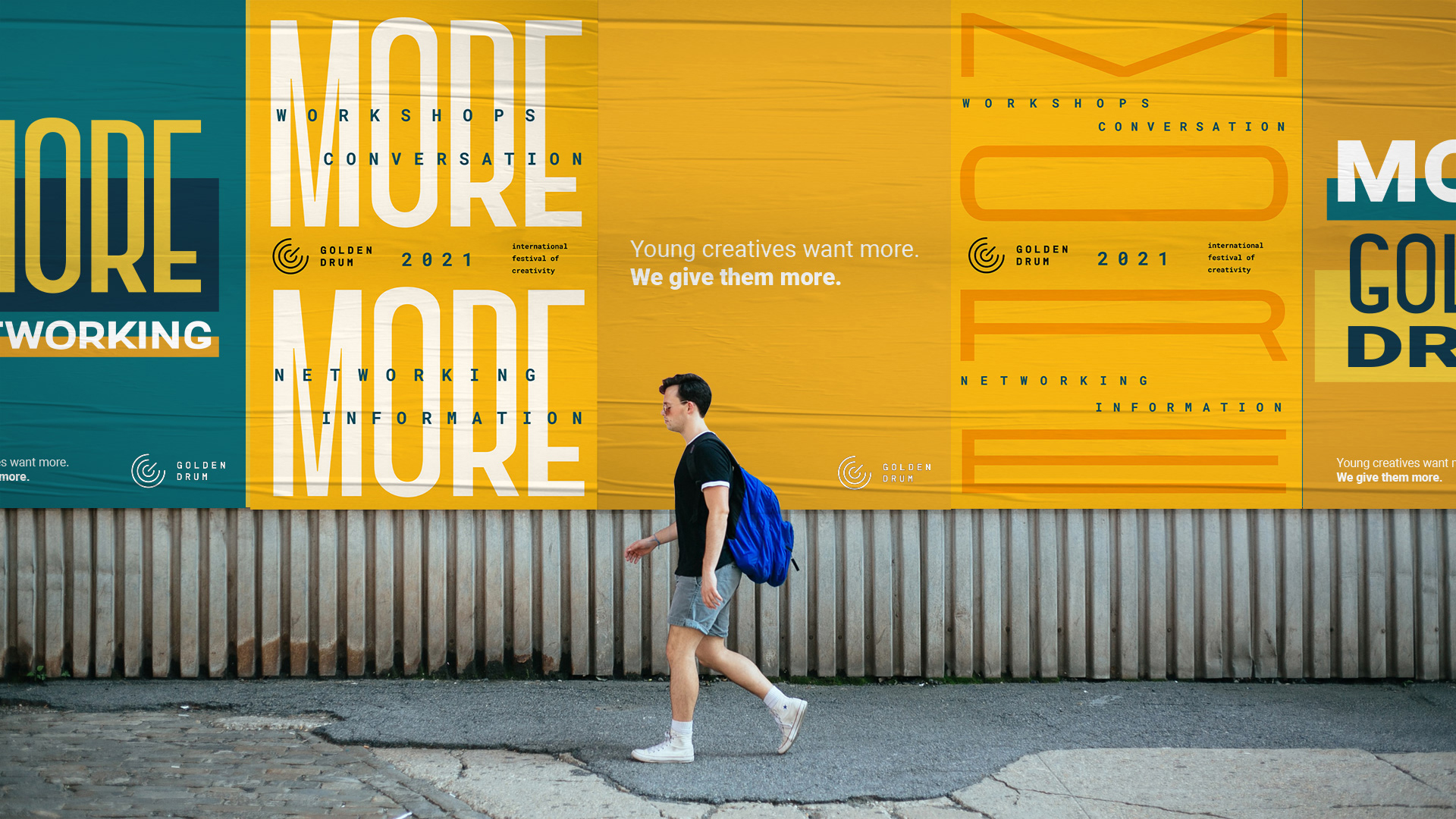 ›we want MORE‹ Golden Drum ist seit über zwei Jahrzehnten einer der renommiertesten Kommunikation- und Kreativfestivals in Europa. Nun wollen sie sich auch als kreative Plattform für Young Creatives positionieren. Kennenlernen und Networking soll eine noch viel stärkere Rolle für junge Kreative bekommen. Die Insights der Zielgruppe zeigen: die young creatives wollen MEHR. Mehr Kommunikation, mehr Möglichkeiten, mehr Networking, mehr Ausstellungen, mehr Workshops. Alles dreht sich um ›we want more – more golden drum‹. Für die Bewerbung des Festivals ist eine interaktive Kampagne konzipiert worden, die um die Metropolen Europas reist. Desweiteren wird das neue Design in Plakaten und auf Social Media beworben. Eine App bringt schließlich die Teilnehmer auf dem Event zusammen und schafft einen Austausch innerhalb der kreativen Community. — mit Teresa Baumgartner