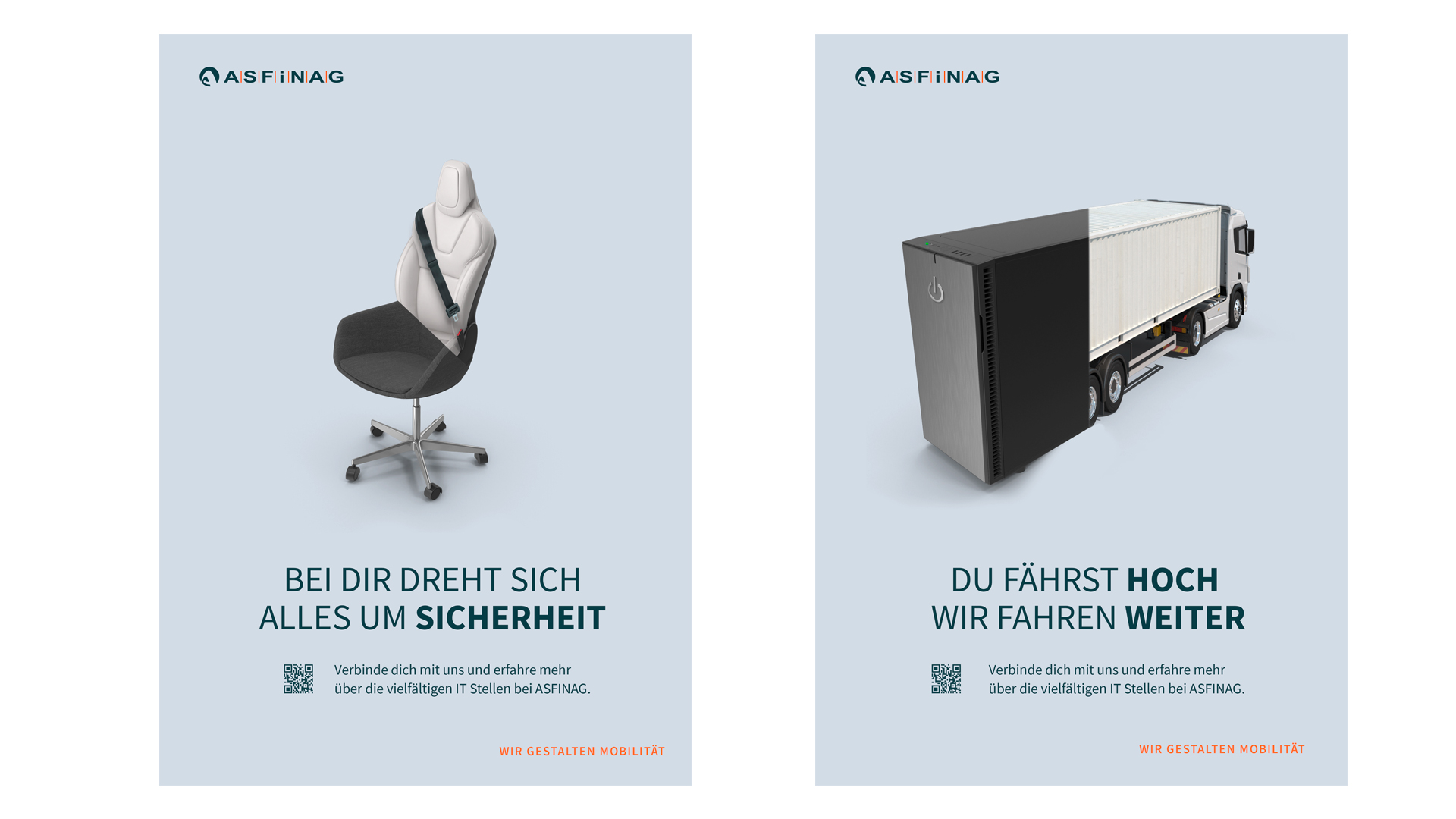 ›Verbindungen zwischen der ASFINAG und der IT‹ Zwischen den beiden Welten der IT und der ASFINAG gibt es viele Parallelen und das sowohl visuell als auch sprachlich. In beiden Welten sind Begriffe wie Vernetzung, Verbindung, Sicherheit und vieles mehr von großer Bedeutung. Diese Übereinstimmungen werden anhand der vorliegenden Jobselling Kampagne visuell bestätigt.