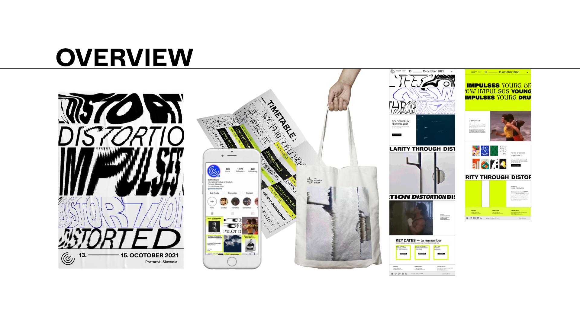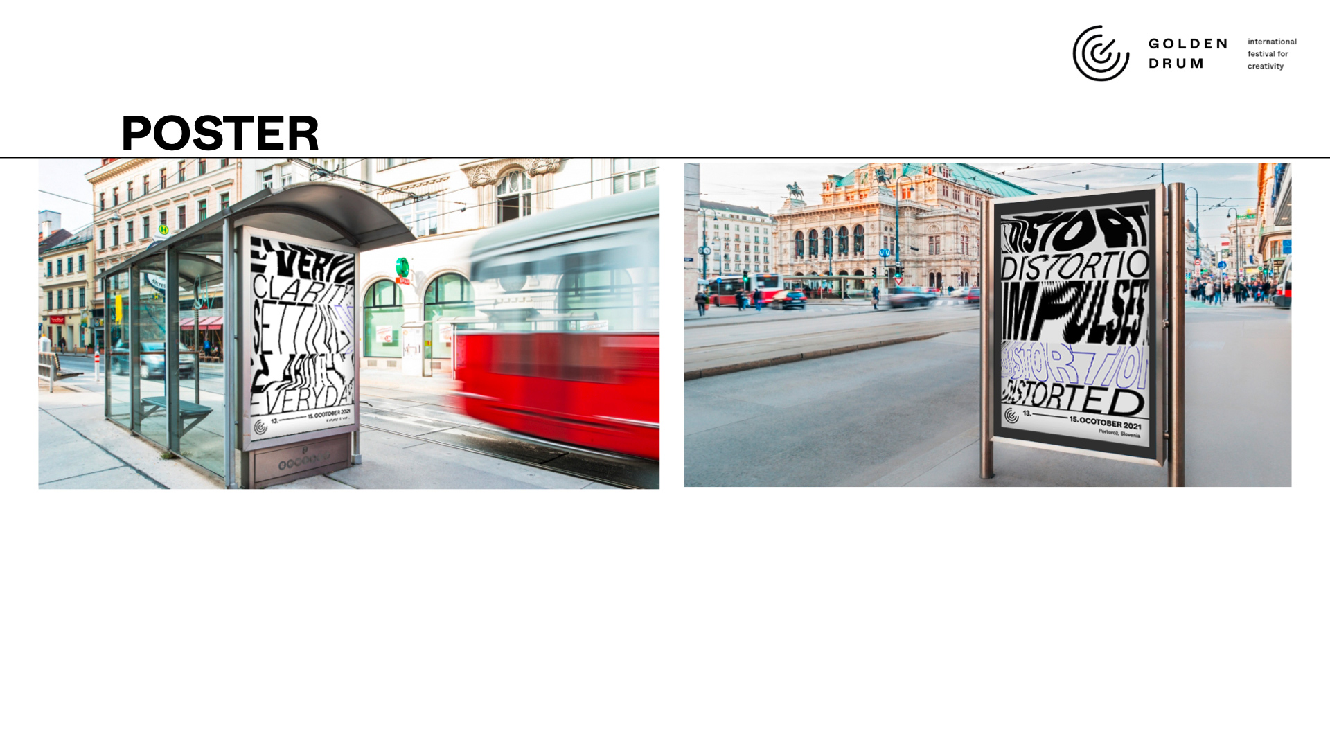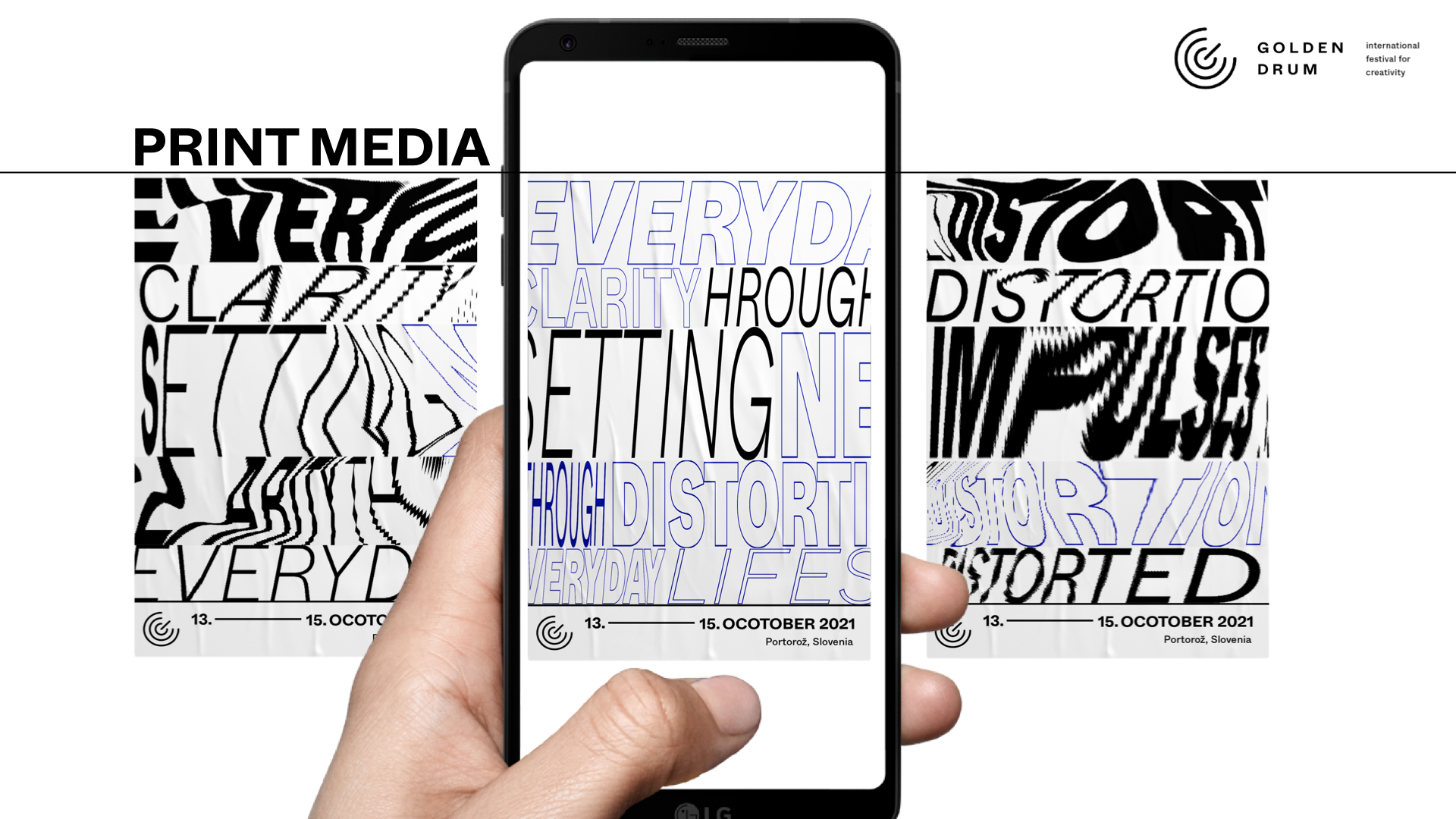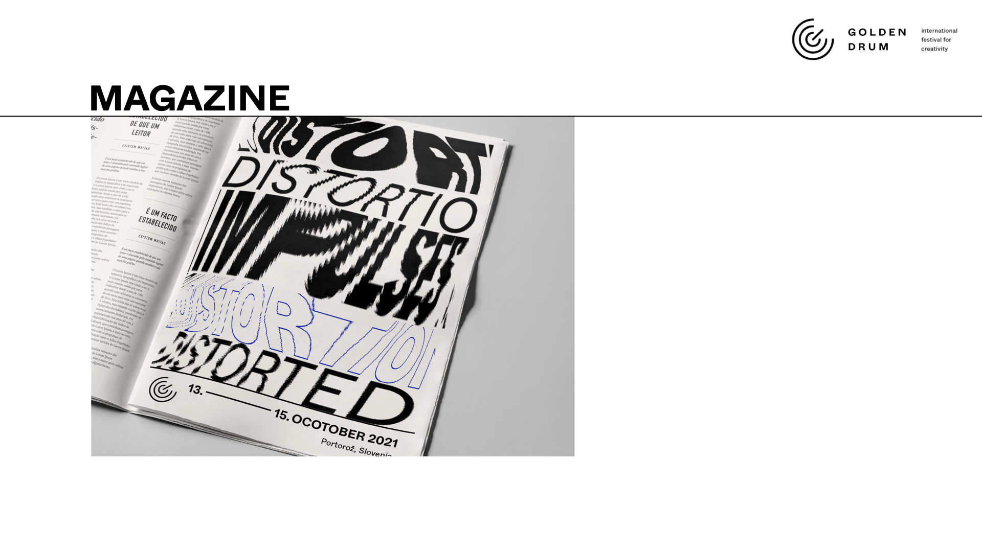 ›Eine visuelle Kommunikationsstrategie‹ Der Alltag ist aus dem Takt geraten, unsere Wahrnehmungen sind verzerrt. Das Golden Drum Festival 2021 will versuchen neue Impulse zu geben und entsprechende Werte für unser kreatives Verhalten zu definieren. Das vorhergesehene Programm soll Menschen inspirieren, verbinden und durch Wettbewerb herausfordern. Das visuelle Konzept soll auf das Ungleichgewicht in das allgemeine Werteverständnis aufmerksam machen und mit seinem Inhalt wieder Klarheit und Verständnis für die relevanten Aspekte des kreativen Handelns schaffen. — mit Nikolaus Prinz und Stella Wendtlandt