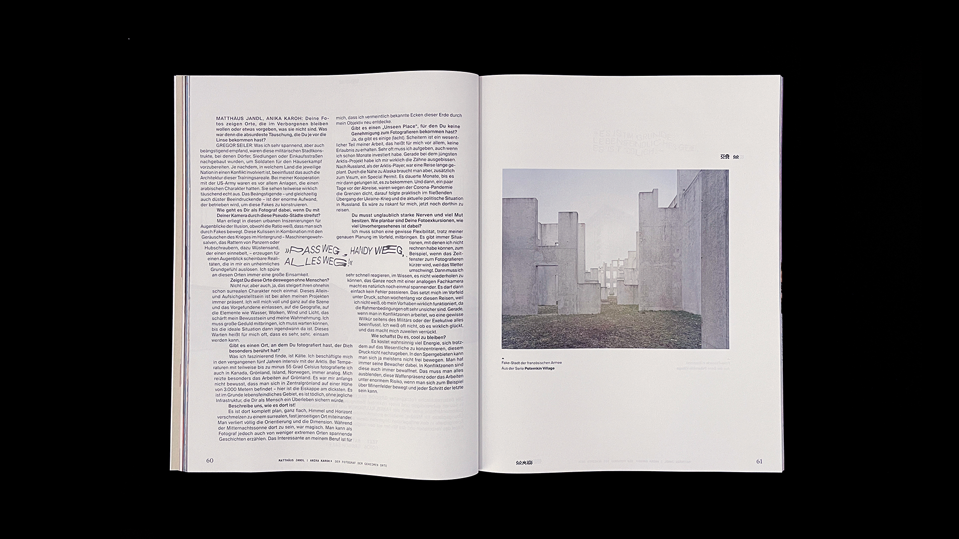 ›Es ist im Grunde lebensfeindliches Gebiet, es ist tödlich.‹ Der österreichische Fotokünstler GREGOR SAILER (*1980) widmet sich in seinen aufwendigen und unter riskanten Bedingungen entstandenen Dokumentarfotos einer Welt der FAKES, ILLUSIONEN und TÄUSCHUNGEN: Übungsplätze für Militärs, moderne potemkinsche Dörfer in Russland oder Sperrgebiete in den entlegensten Gegenden dieser Welt. Ein Gespräch über den Kitzel des Verbotenen und das Warten auf den magischen Moment. — mit Matthäus Jandl Zum Nachlesen — Das Interview
