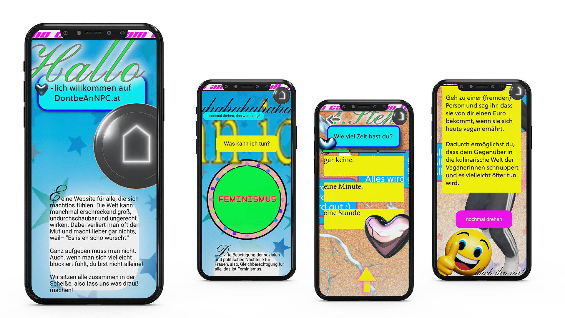 Viele Jugendliche verspüren durch anhaltende Dauerkrisen das Gefühl einer Ohnmacht. Die Website ›no-NPC.at‹ soll durch Interaktivität zeigen, dass auch kleine Taten für das Gesamtbild wichtig sind, individuelle Lösungen anbieten und somit den betroffenen aus ihrem Loch helfen. Durch 3 verschiedene Plakate, 6 verschiedene Sticker und 3 verschiedene Freecards, die in Wiens Studentenbars und Cafés hängen, wird die Website zusätzlich gepusht. Die Seite soll sich durch ihre trashige Optik hervorheben und dient weniger der Informationsvermittlung, als des Ermutigens der Zielgruppe. Das Projekt wurde in Readymag umgesetzt und besteht aus vielen Subsites, Animationen und anderen graphischen Verspieltheiten. NO-NPC.AT — Mobile Website