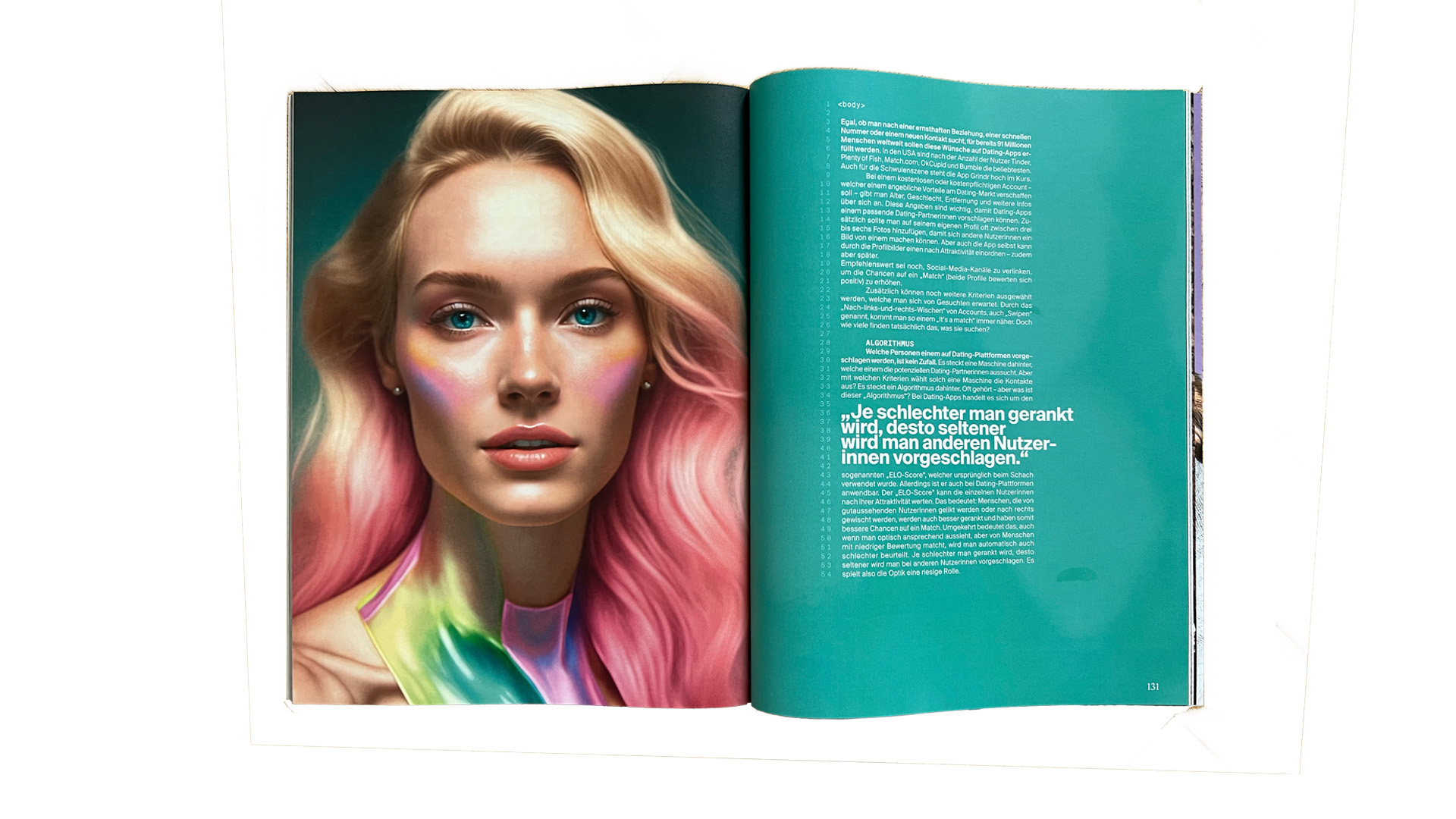 Schon einmal über Online-Dating nachgedacht und dich gefragt ob dir etwas vorenthalten bleibt? Das haben wir uns auch. Gemeinsam mit Chiara Buxbaum ist deshalb der Artikel „Die wahre Lüge finden“ entstanden. Nach reichlicher Recherche haben wir die dunklen Geheimnisse der Online-Liebe zusammengefasst und mit KI-Generierten Bildern veranschaulicht. – mit Chiara Buxbaum – Basislayout: Mariam Ali, Kilian Held, Jaimy Preiml
