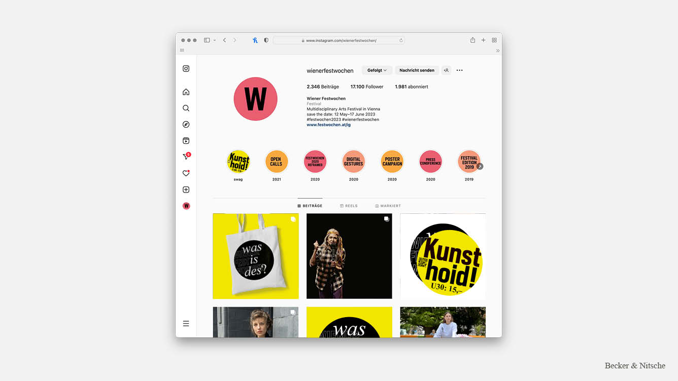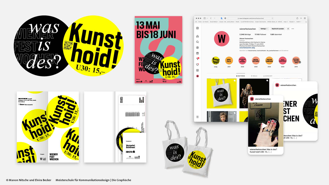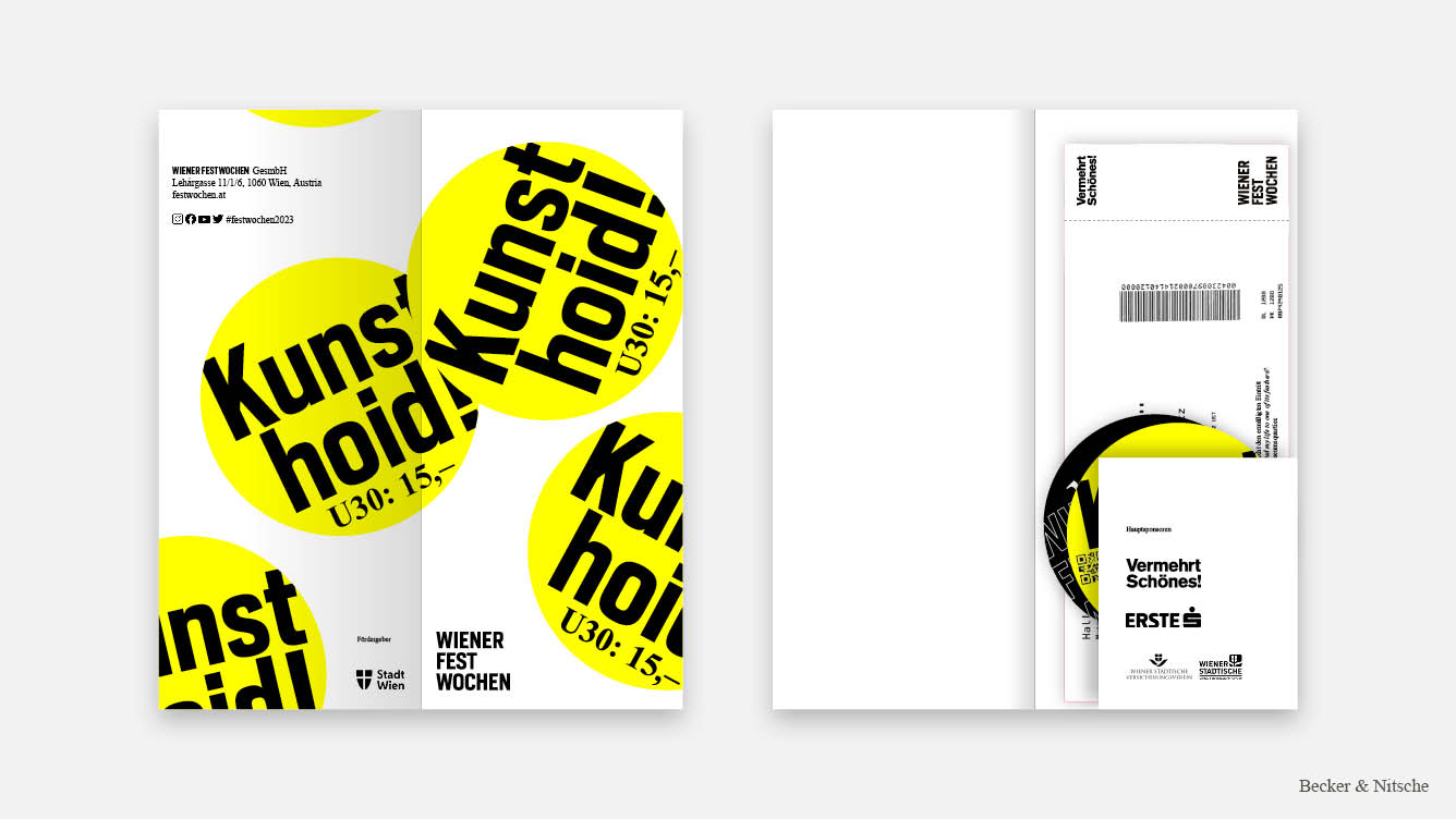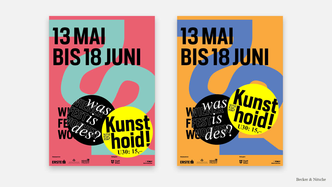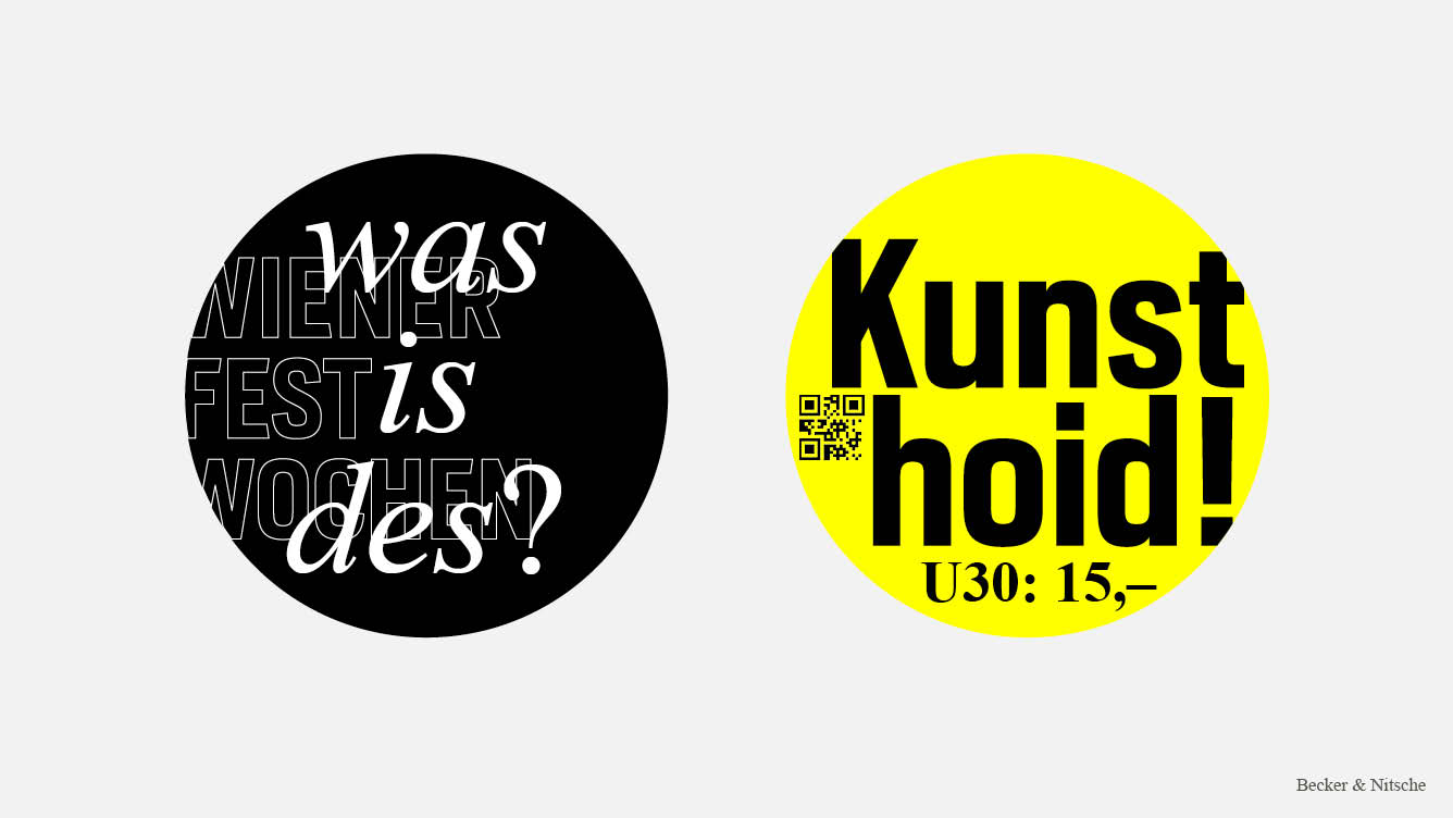 Für die Bewerbung des »Vermehrt-Schönes«-Tickets der Wiener Festwochen sind zwei Störer entstanden. Einer mit der Frage »Was is des?« und einer mit der Antwort »Kunst hoid! U30: 15€«. Mit dem Gedanken an eine Guerilla-Kampagne, war die Idee, die Störer, in Form von Stickern, in der ganzen Stadt zu verteilen und somit die Frage an die Jugend zu beantworten, was die Wiener Festwochen eigentlich sind. Beworben wird die Kampagne mit einem Instagram-Video, welches junge Erwachsene zeigt, die mit Vorfreude auf die Vorstellungen, am Weg dorthin, in der ganzen Stadt die Sticker verteilen. Es soll das Stigma brechen, dass das Theater und andere Kulturvorstellungen nur für Erwachsene und alte Leute sind, und zeigen, dass es Spaß machen kann, wie eine Party und mittlerweile, im Gegensatz zu früher, leistbar ist. Die Störer in Form von Stickern sind das Hauptstilmittel der Kampagne und werden, neben der offensichtlichen Verwendung, auch als Störer auf den Haupt-Plakaten und als Designelement auf dem Ticket-Sleeve verwendet. Auch wurde das Element auf verschiedensten Merchartikeln, wie Zündholzschachteln, Leiberl und Sackerl, abgebildet. – Mit Elvira Becker