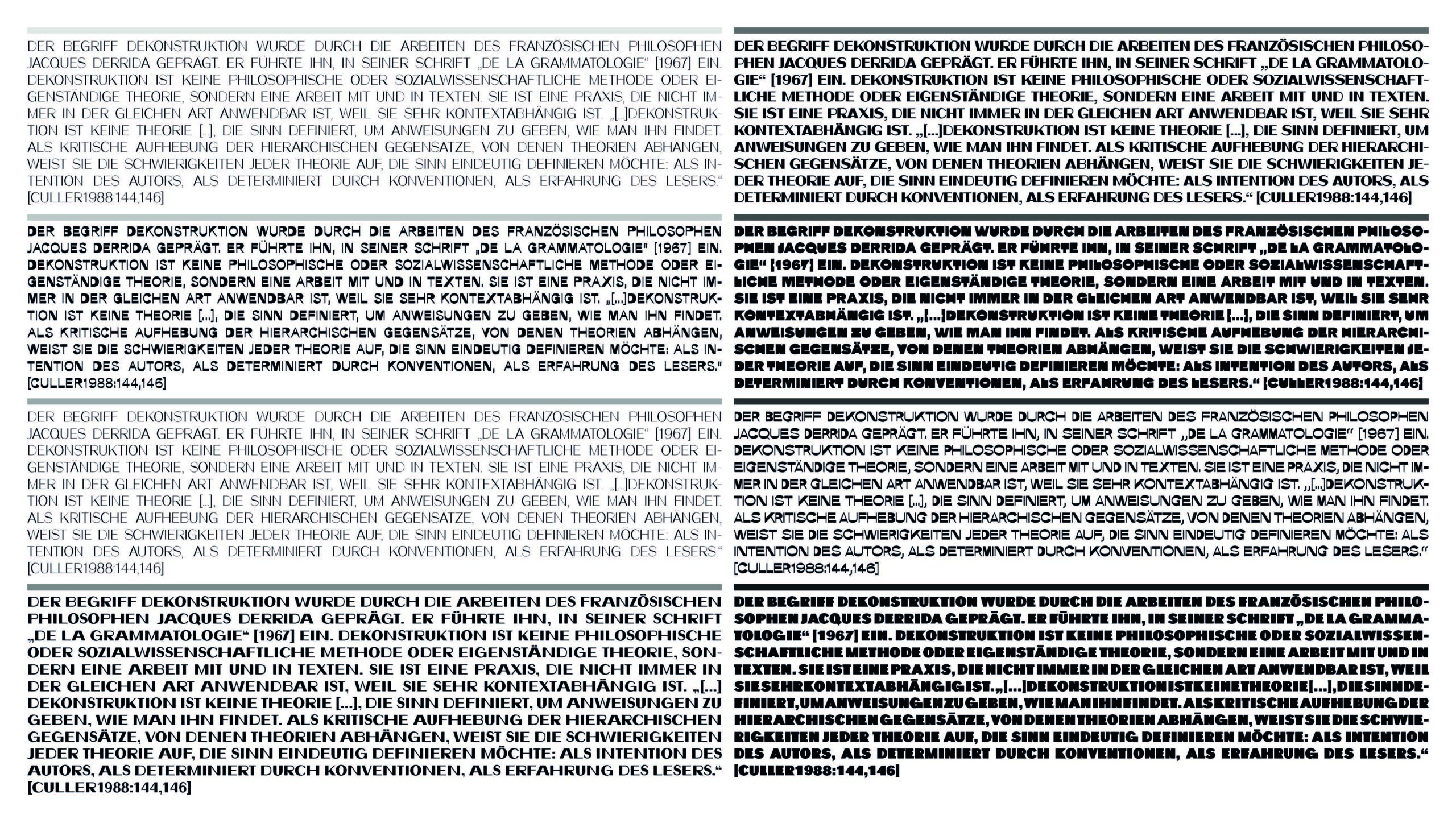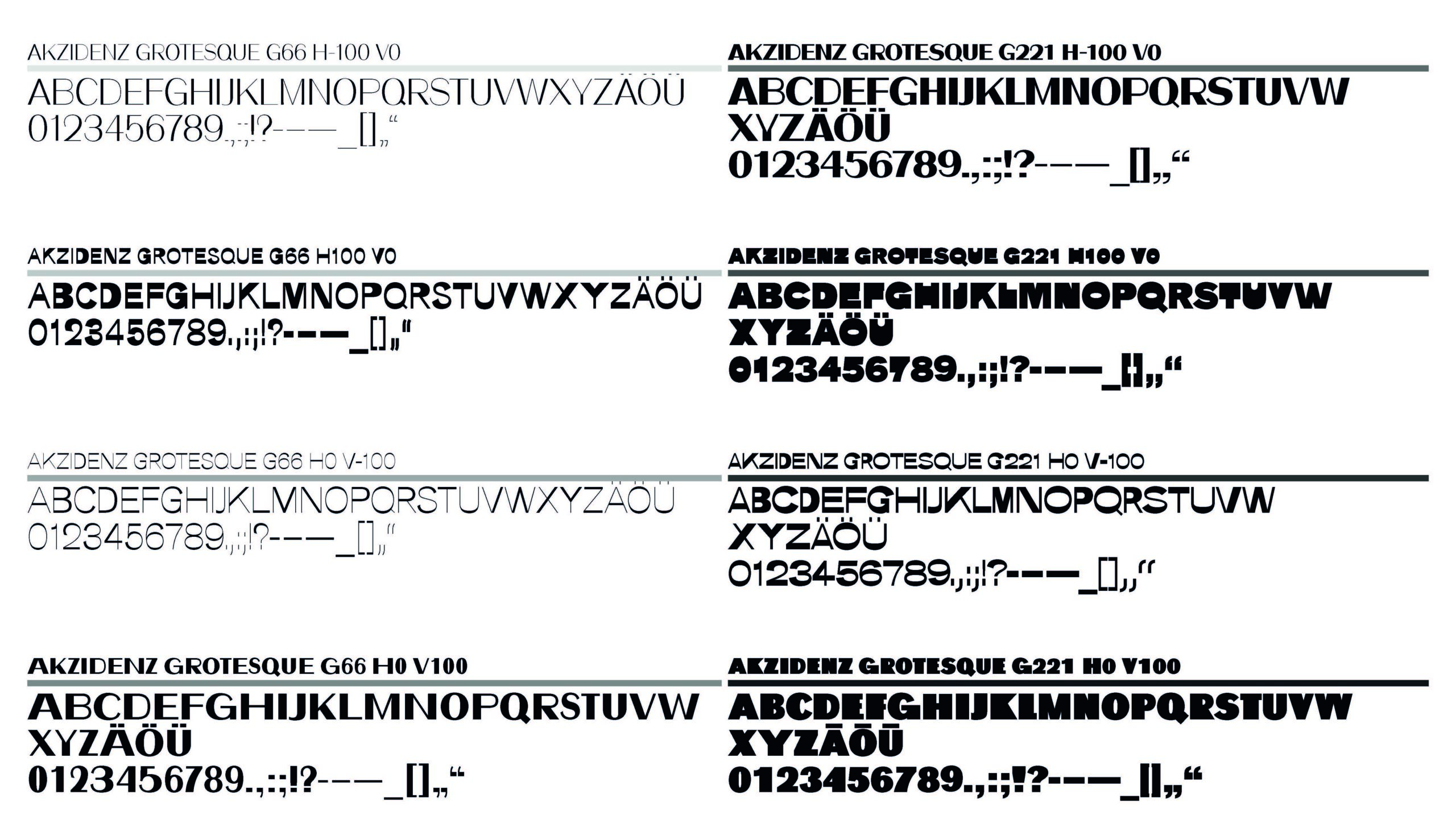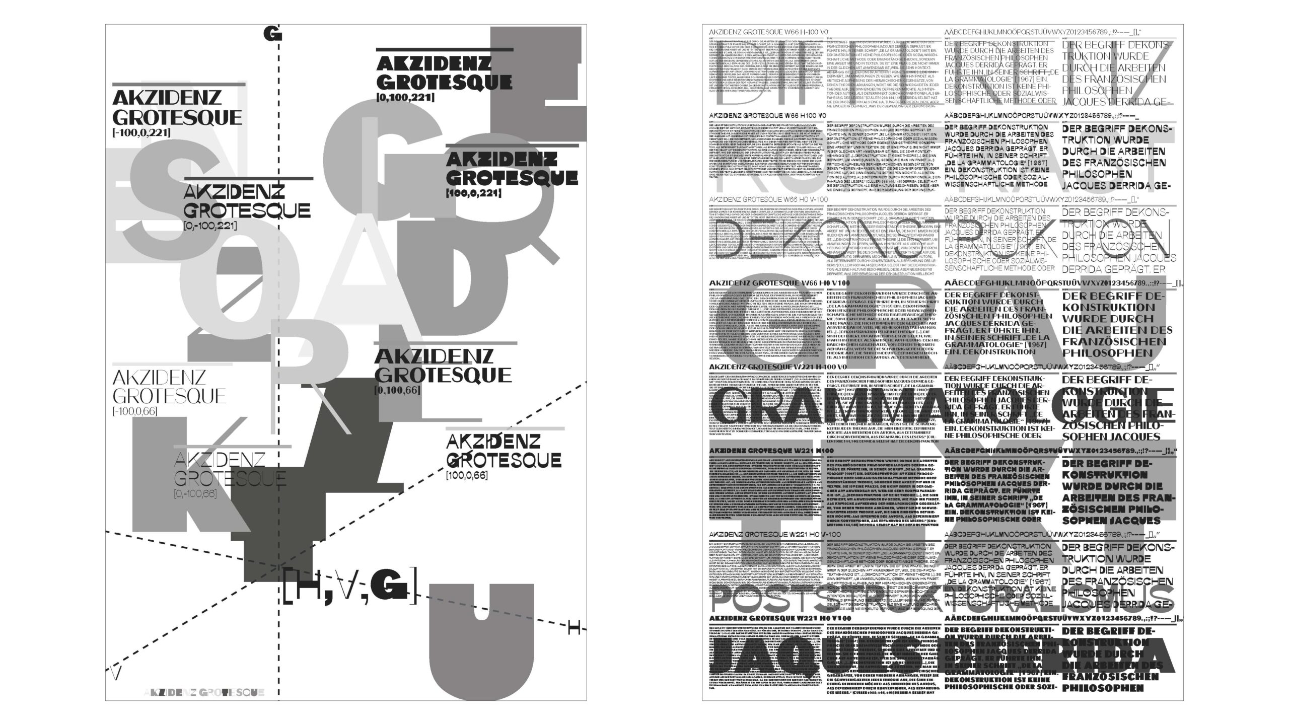 Die Akzidenz-Grotesque ist eine Variable Font mit 3 Achsen (Gewicht, Horizontal, Vertikal) sowie 8 individuellen Schnitten. Das Skelett stammt von der erstmals 1896 veröffentlichten Akzidenz-Grotesk. Der Name Akzidenz-Grotesque ist einerseits eine direkte Hommage an ihren Archetypen, andererseits spielt dieser auf die eigenwilligen, ungewöhnlichen, teils exzentrischen und bizarren Schriftbilder an. Durch die Sichtbarmachung der Anatomie eines Zeichens in Form von Horizontalen und Vertikalen werden diese individuell (be-)greifbar als auch veränderbar. In Folge werden Buchstaben und Zeichen als feste Form dekonstruiert.