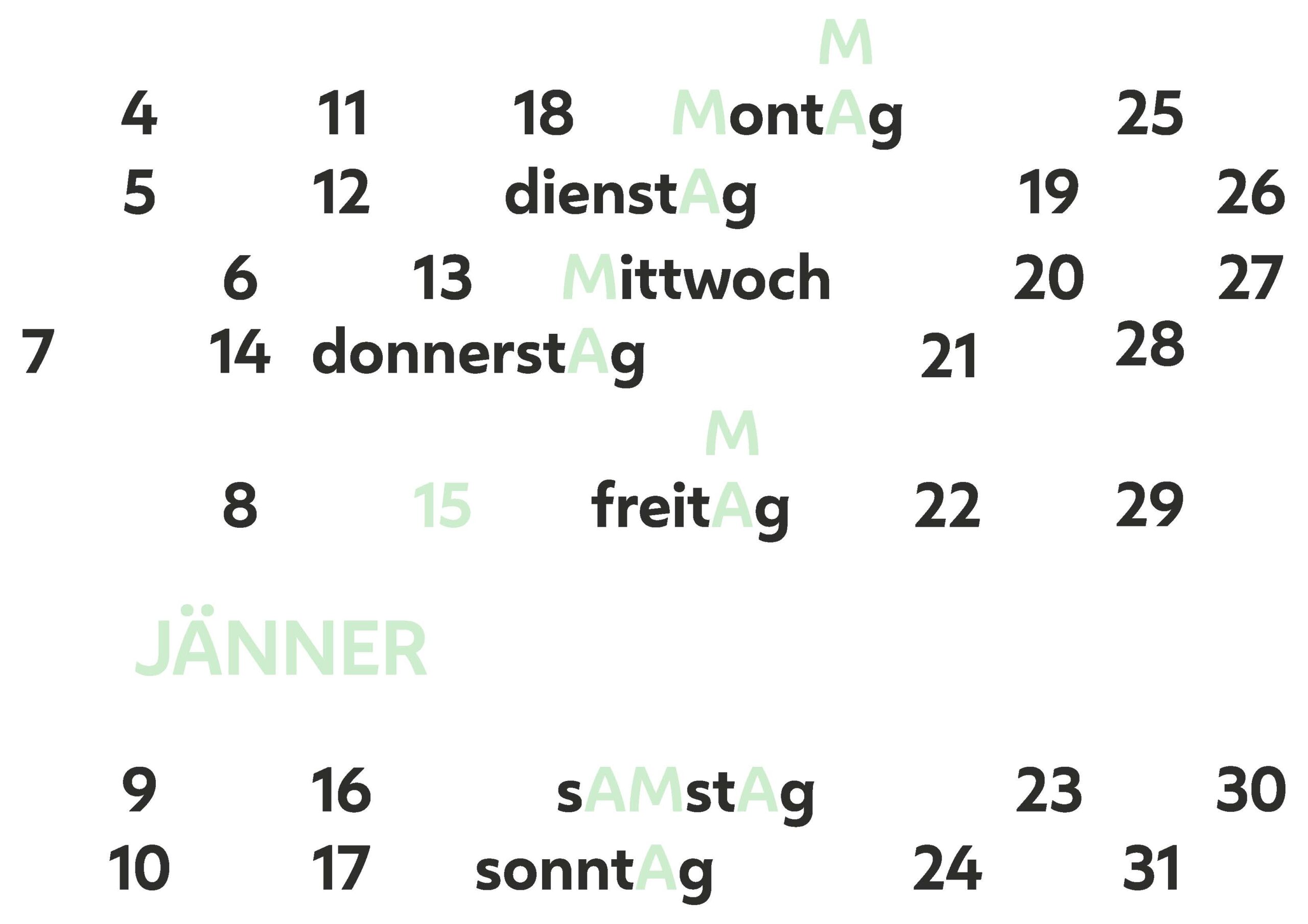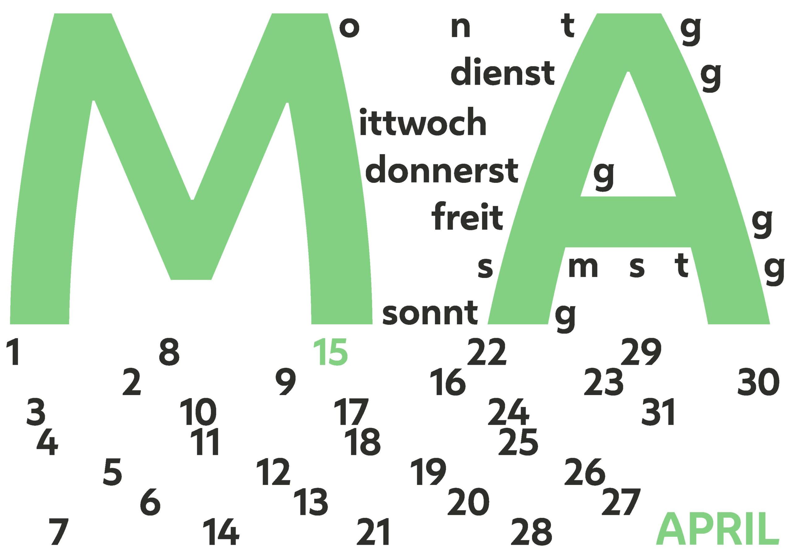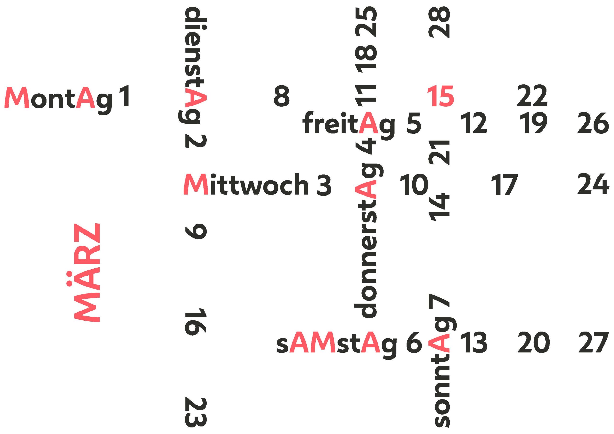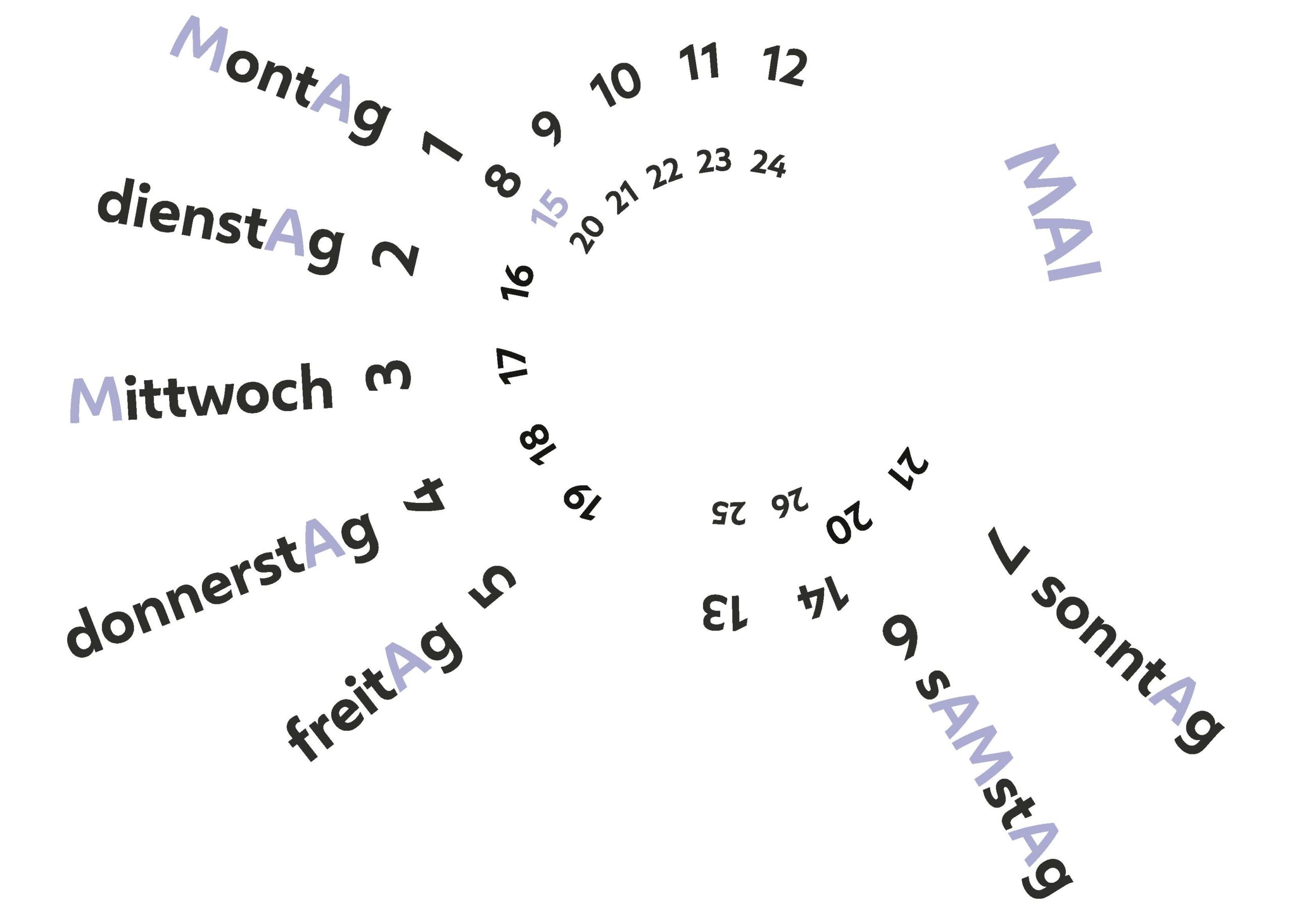 In diesem Projekt wurden unterschiedliche Darstellungen eines Kalendermonats erforscht. Diese entstanden durch einen Fokus auf die Buchstaben ›M‹ ›A‹ und die Ziffer ›15‹. Kompositionen und Ideen stammen aus der jeweiligen Namens der Unterabteilung.