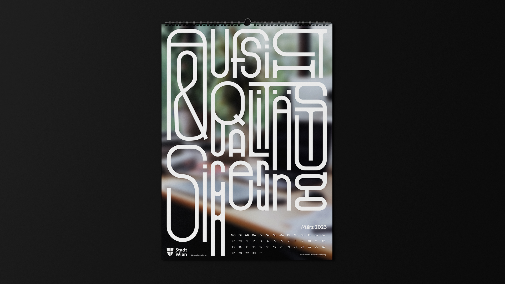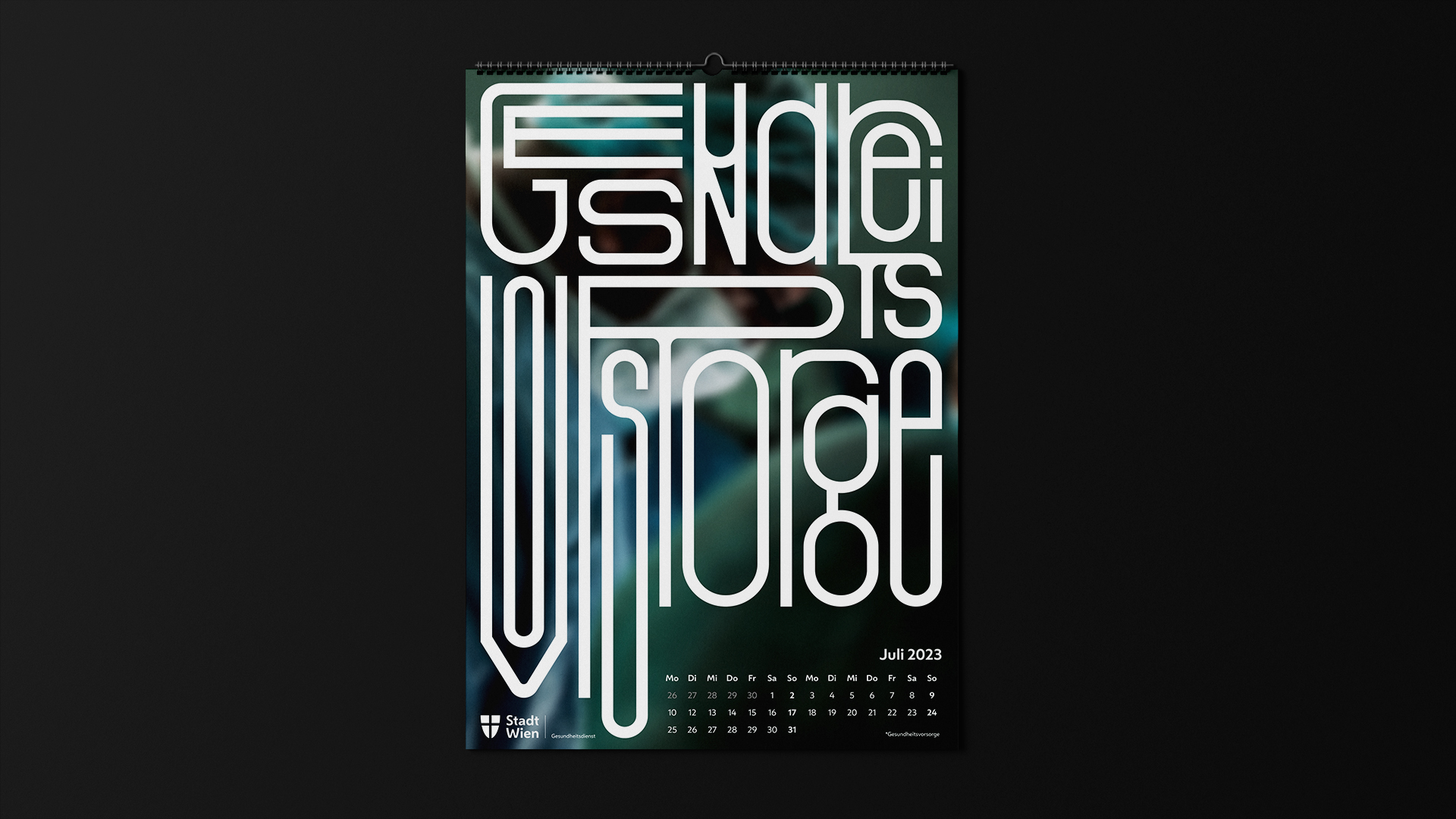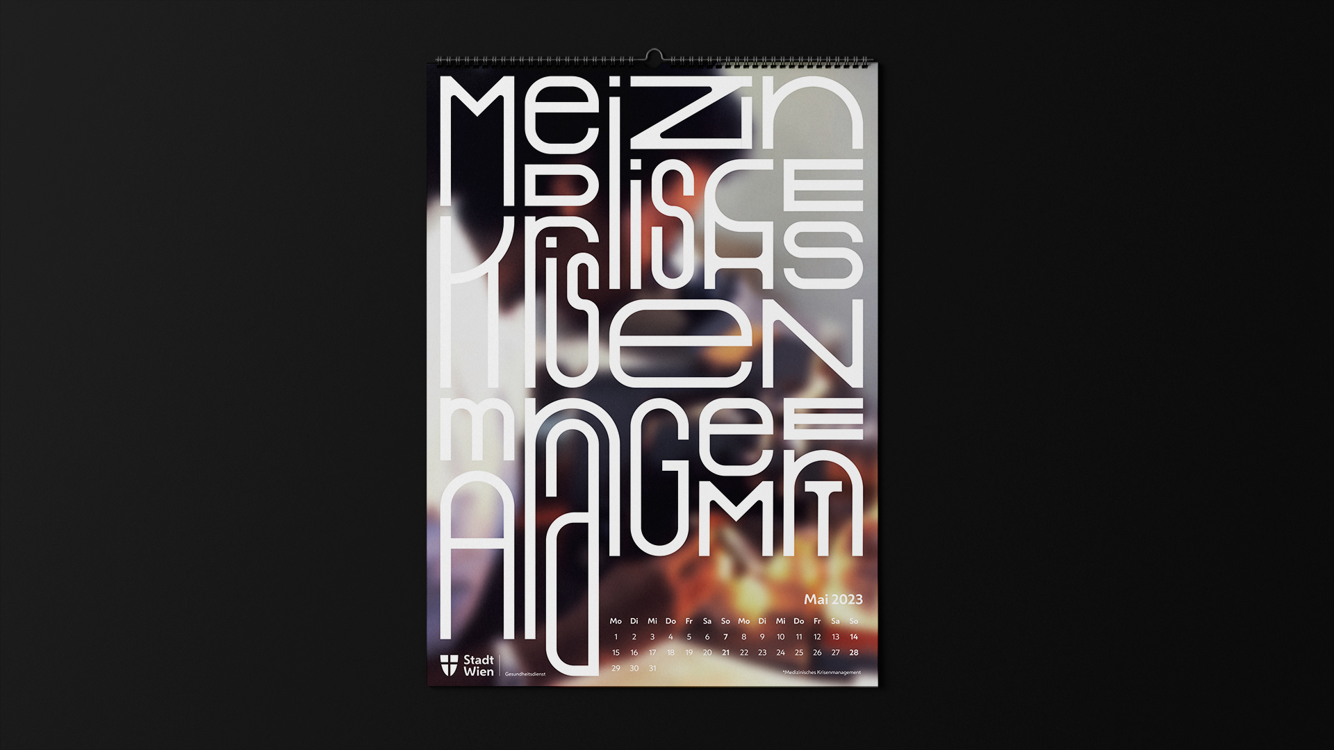 Die MA15 ist der Gesundheitsdienst der Stadt Wien. Sie hat viele Tätigkeitsbereiche und möchte sich bei ihren Mitarbeitern für die Arbeit mit dem Kalender bedanken. Der Kalender soll als interessantes Wandbild, aber auch als kleines Suchbild in den Pausen dienen. Die Typografie zeigt die einzelnen Tätigkeitsbereiche der fleißigen Mitarbeiter.