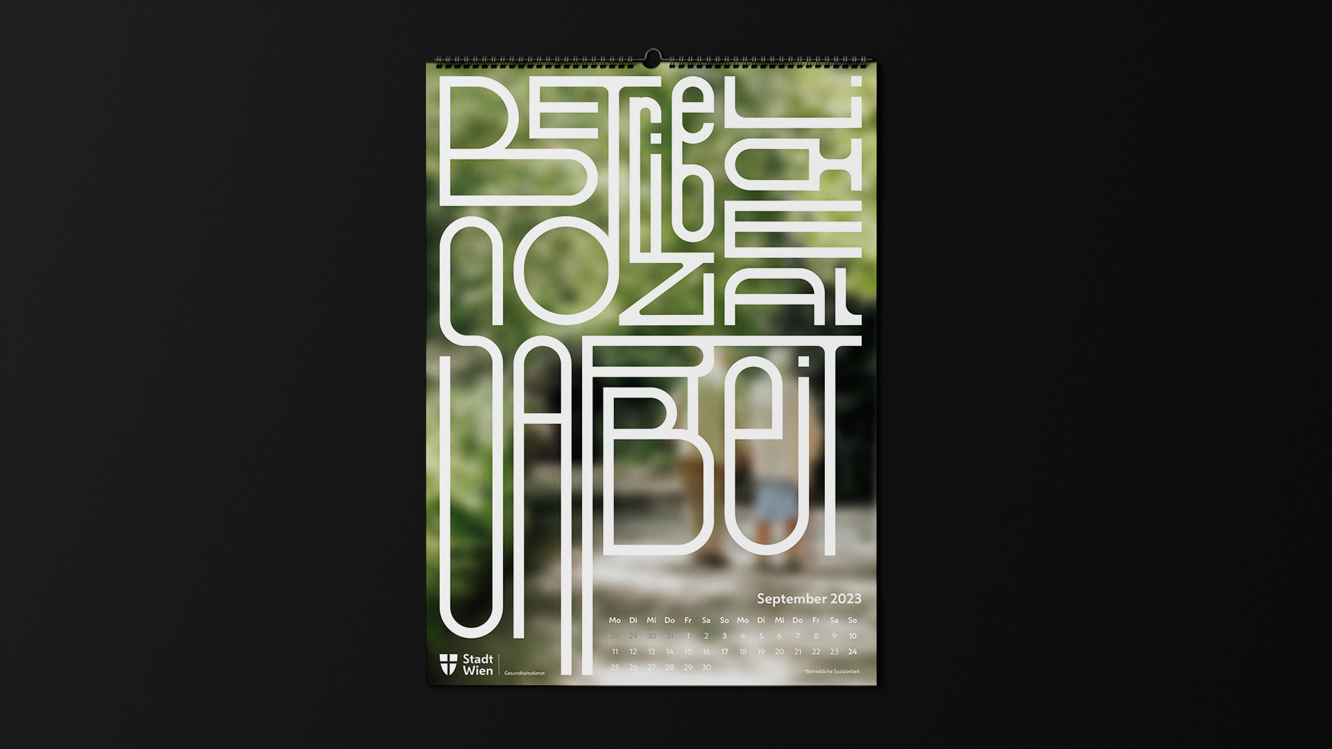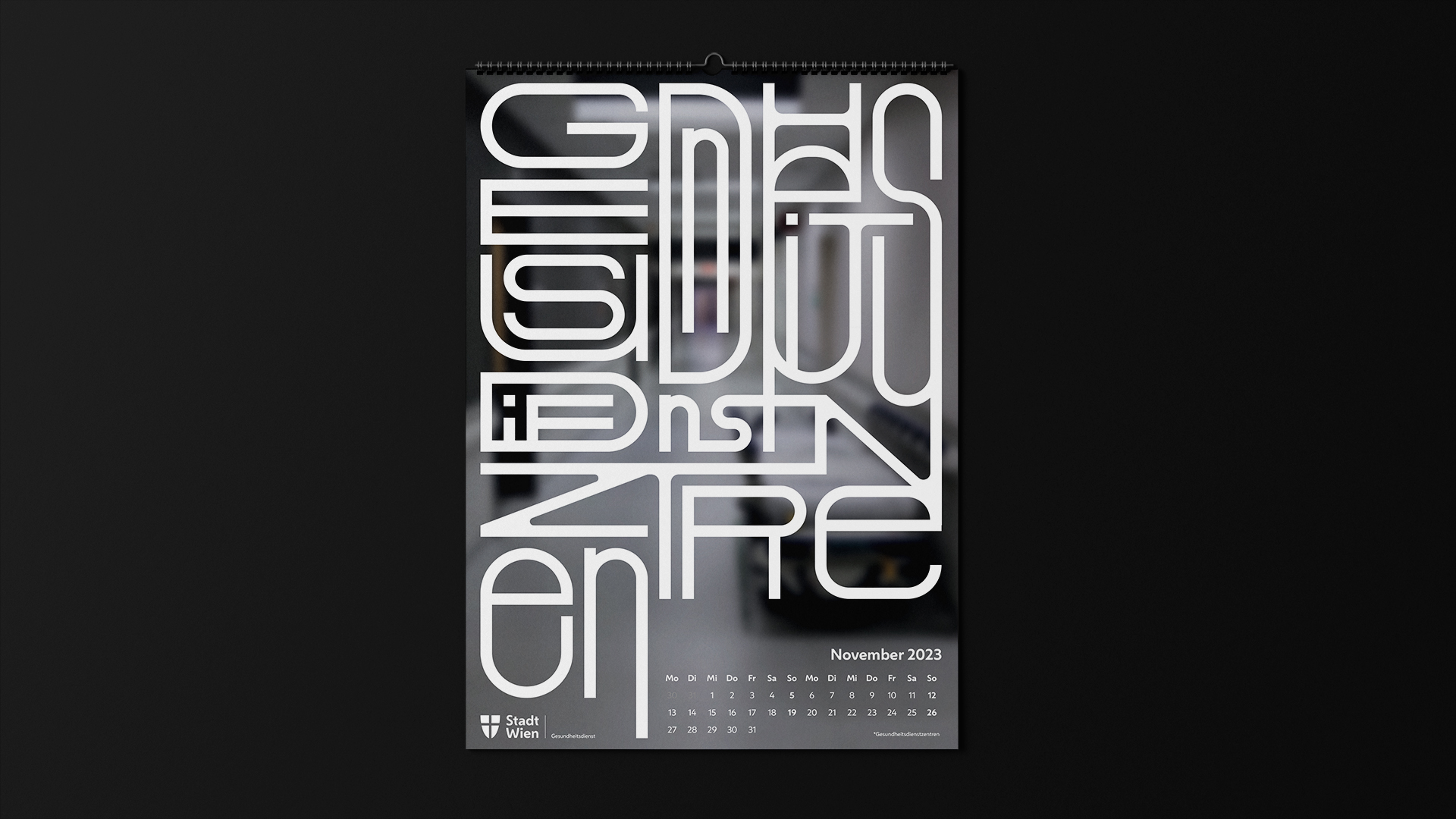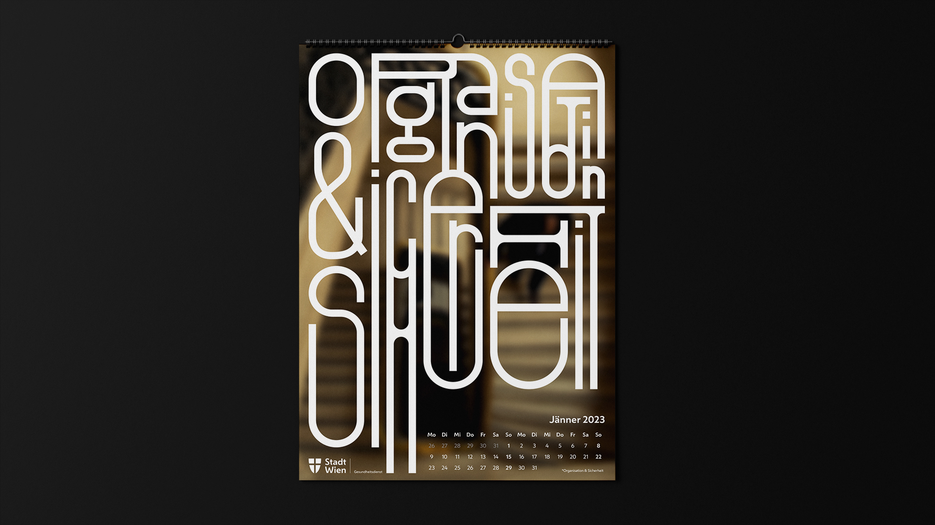 Die MA15 ist der Gesundheitsdienst der Stadt Wien. Sie hat viele Tätigkeitsbereiche und möchte sich bei ihren Mitarbeitern für die Arbeit mit dem Kalender bedanken. Der Kalender soll als interessantes Wandbild, aber auch als kleines Suchbild in den Pausen dienen. Die Typografie zeigt die einzelnen Tätigkeitsbereiche der fleißigen Mitarbeiter.