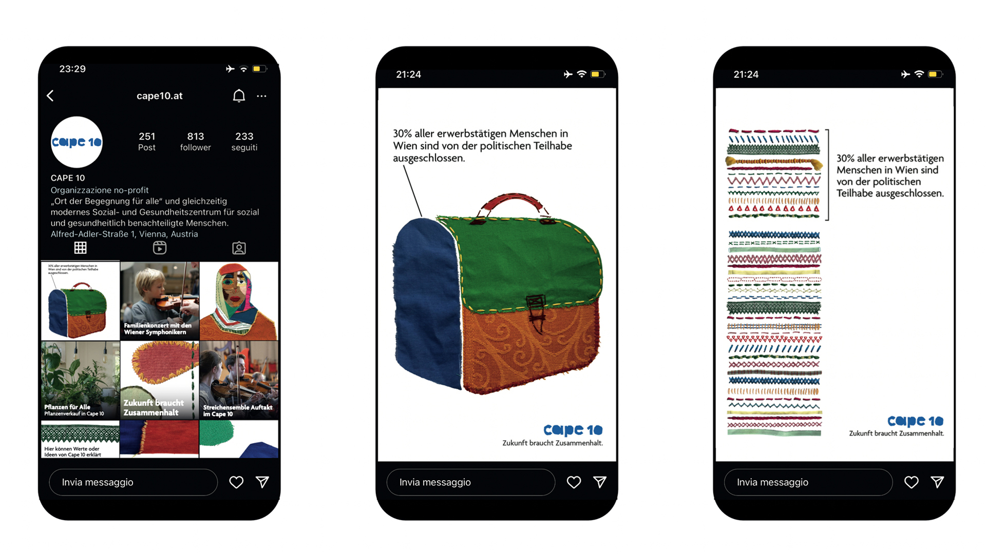 ›Zukunft braucht Zugehörigkeit.‹ Das Projekt umfasst das Re-Design, die Logogestaltung sowie die Entwicklung einer PR-Kampagne für die soziale Einrichtung ›CAPE 10‹. Die non-governmental-organisation ›CAPE 10‹ setzt sich für soziale Integration in Wien ein. Um zu größerer Förderschaft zu gelangen, starten die Meister*innen innerhalb eines Klasseninternen Wettbewerbs die Awareness Kampagne für den Kunden. Das Projekt belegte den 2. Platz für speziellen Zugang in der Art Direction. — mit Samuel Brazzo
