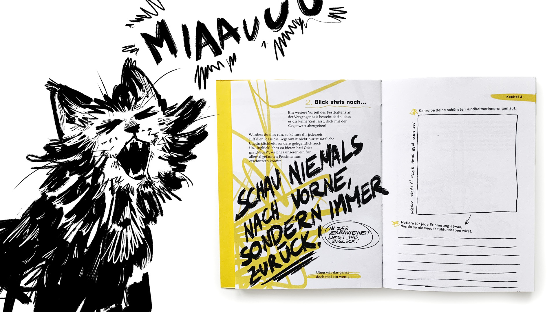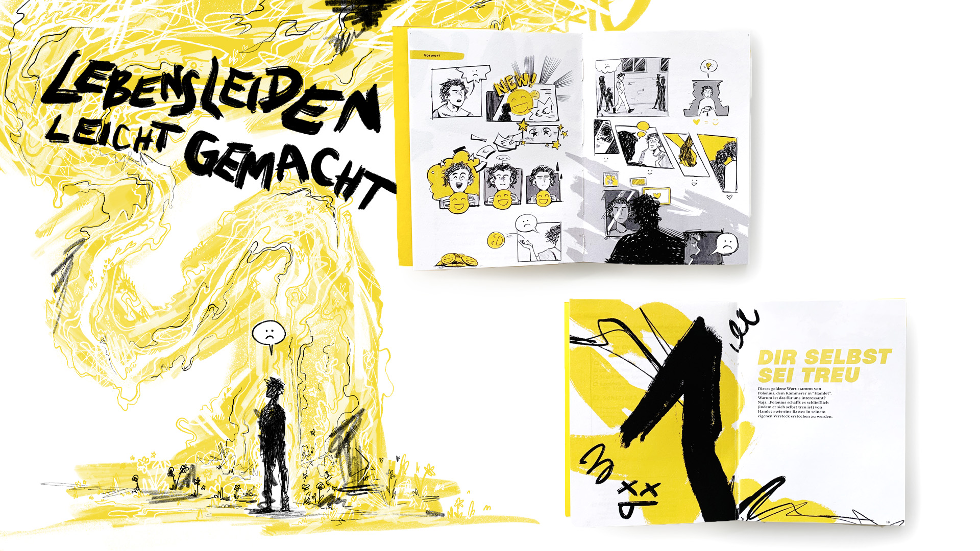 ›Glücklich sein, und was hast du dann davon?‹ ›Lebensleiden Leicht Gemacht‹ ist ein informatives, interaktives Anti- Selbsthilfebuch, welches einem die wichtigsten Taktiken und Techniken zum Unglücklichsein näherbringt. Mithilfe von gestalterischen Mitteln, die zwischen Schulbuch und Graphic Novel angesiedelt sind, werden die Inhalte aus Paul Watzlawicks ›Anleitung zum Unglücklichsein‹ in dieser Arbeit neu umgesetzt und kommuniziert. Weil man hat uns nun wirklich zu lange eingeredet, dass die Suche nach Glück uns dieses schließlich erbringen wird.