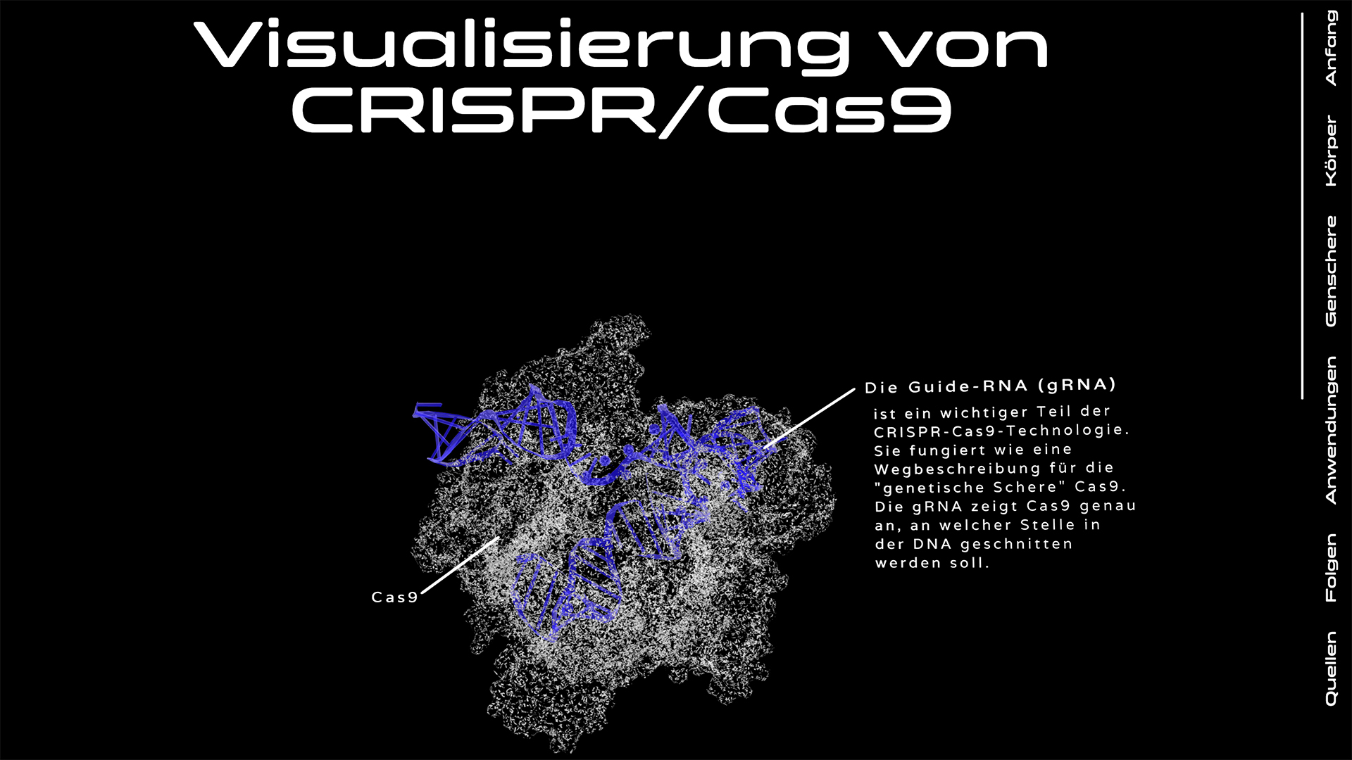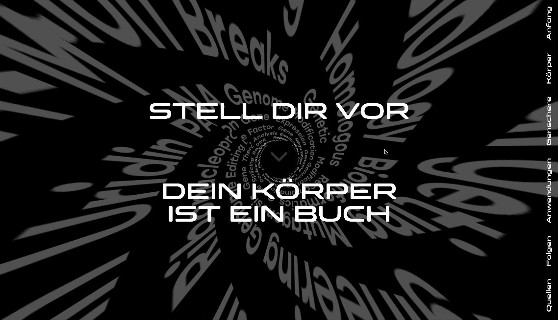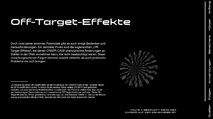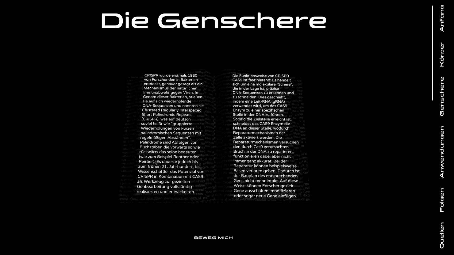 CC9, ein digitales Projekt, erzählt durch eine Kombination aus interaktiven und informativen Elementen eine Geschichte, welche das komplexe Thema von Gen-Editierung verständlich aufbereitet. Dabei wirft es nicht nur einen Blick auf die faszinierenden Möglichkeiten, die die Genschere CRISPR Cas9 bietet, sondern auch auf die ethischen Fragen, die mit solchen Technologien einhergehen. Wie werden wir in Zukunft mit genetischen Veränderungen umgehen und welche Auswirkungen werden sie auf unsere Gesellschaft haben? CC9