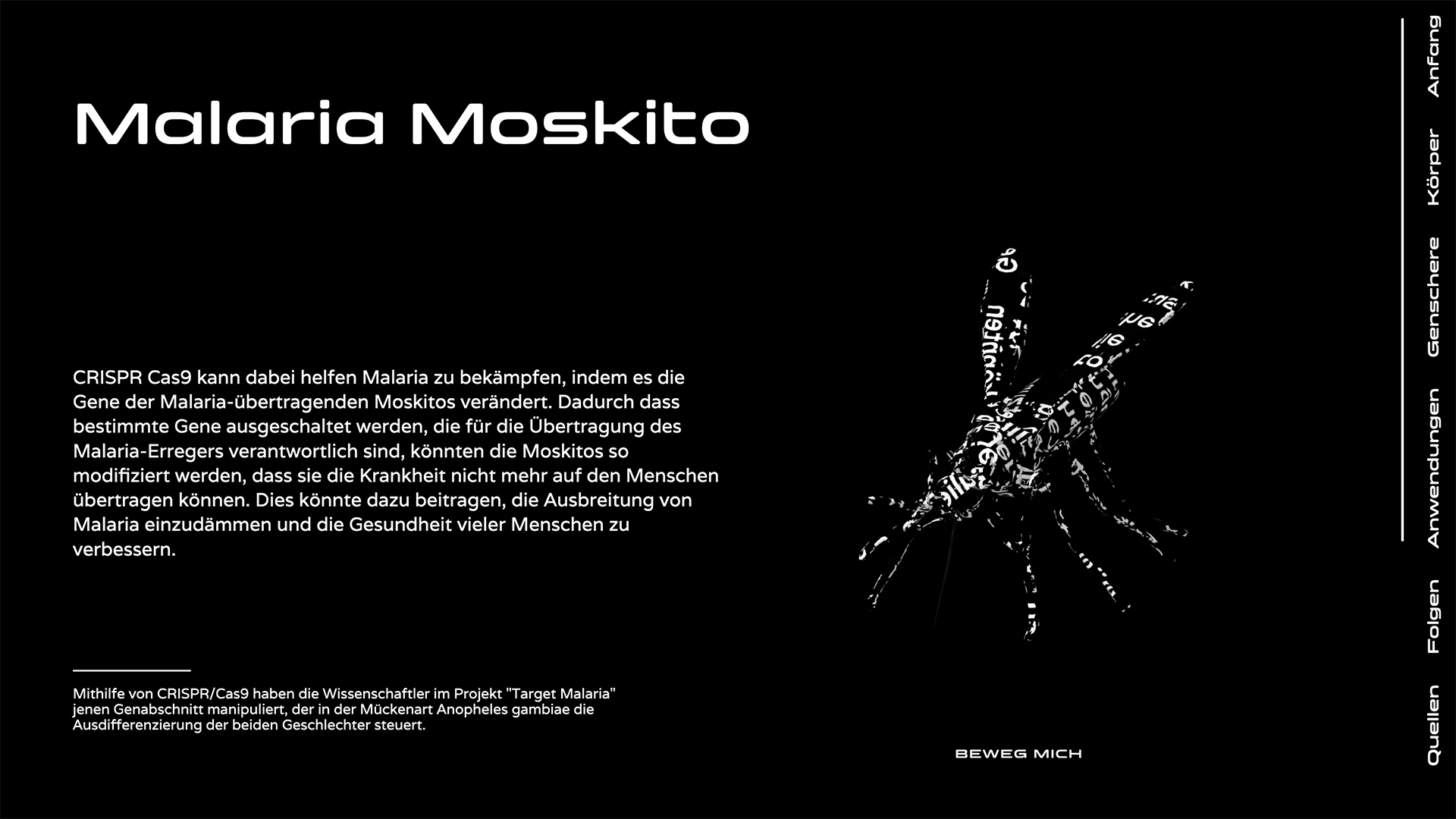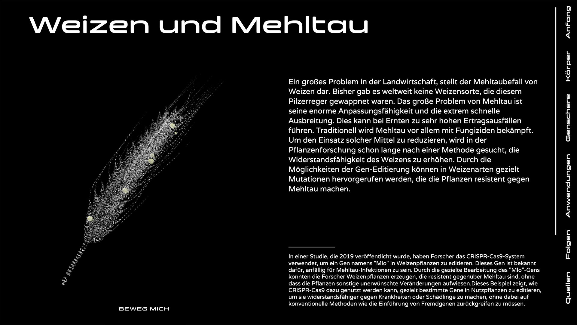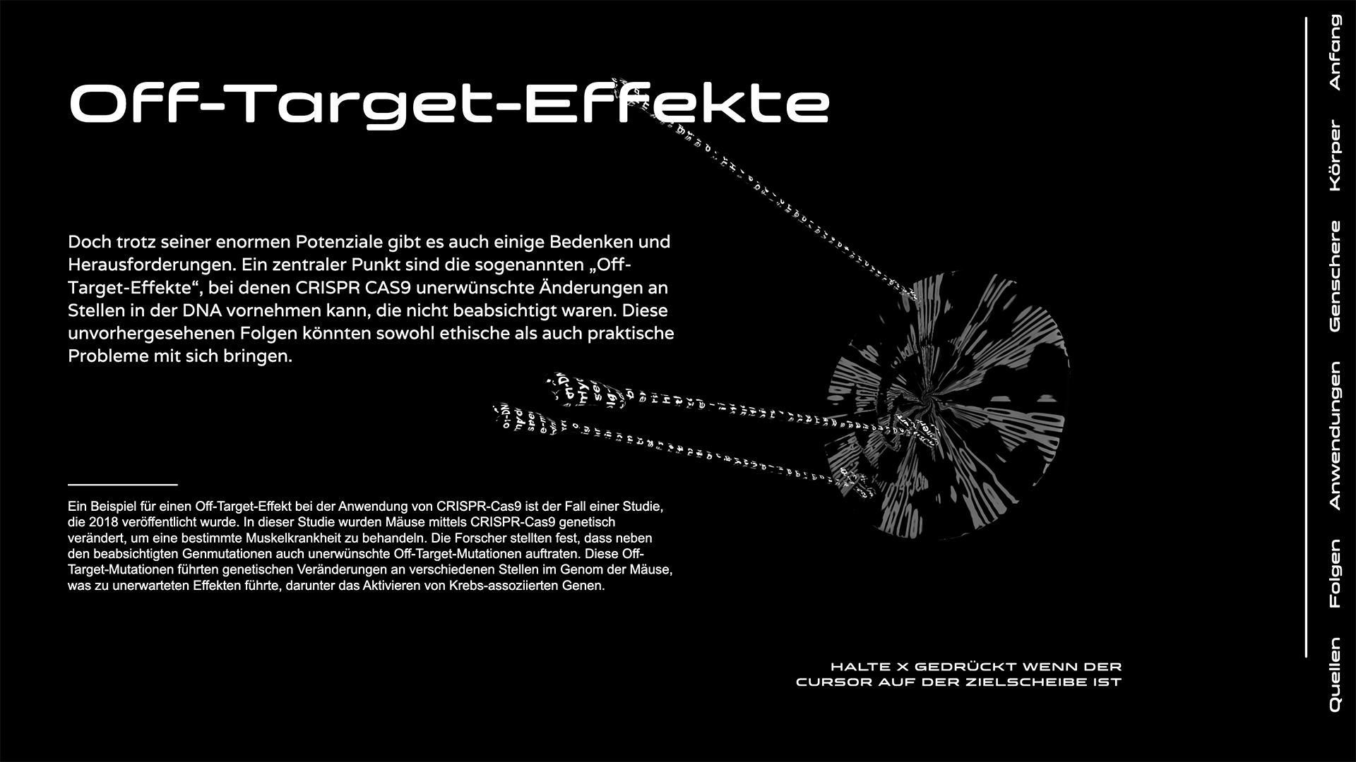 CC9, ein digitales Projekt, erzählt durch eine Kombination aus interaktiven und informativen Elementen eine Geschichte, welche das komplexe Thema von Gen-Editierung verständlich aufbereitet. Dabei wirft es nicht nur einen Blick auf die faszinierenden Möglichkeiten, die die Genschere CRISPR Cas9 bietet, sondern auch auf die ethischen Fragen, die mit solchen Technologien einhergehen. Wie werden wir in Zukunft mit genetischen Veränderungen umgehen und welche Auswirkungen werden sie auf unsere Gesellschaft haben? CC9