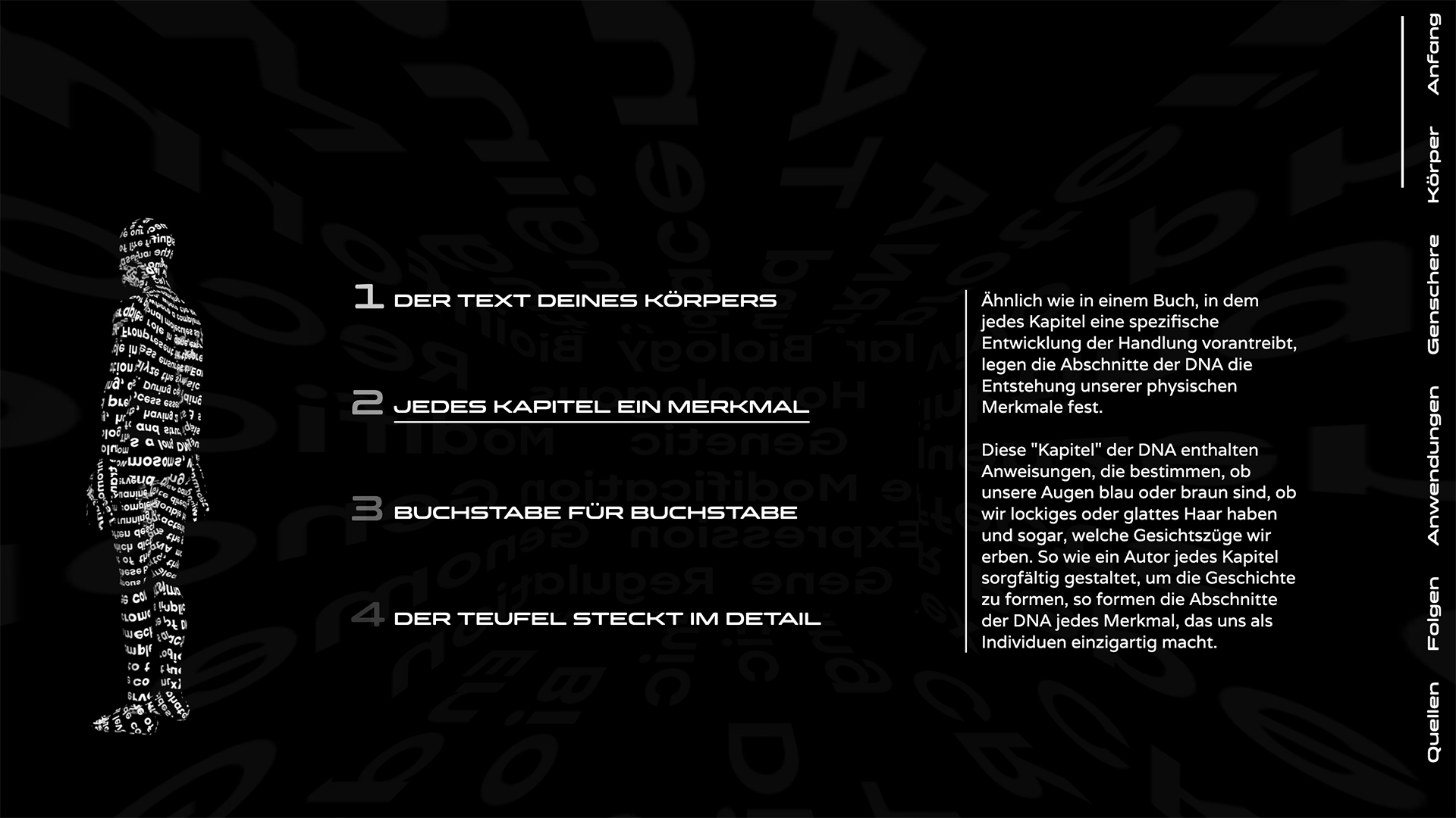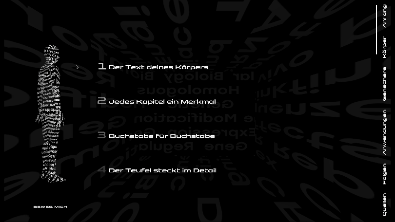 „Stell dir vor, dein Körper ist ein Buch“. Jede Seite ist ein Teil deines genetischen Codes, geschrieben in der Sprache der DNA.