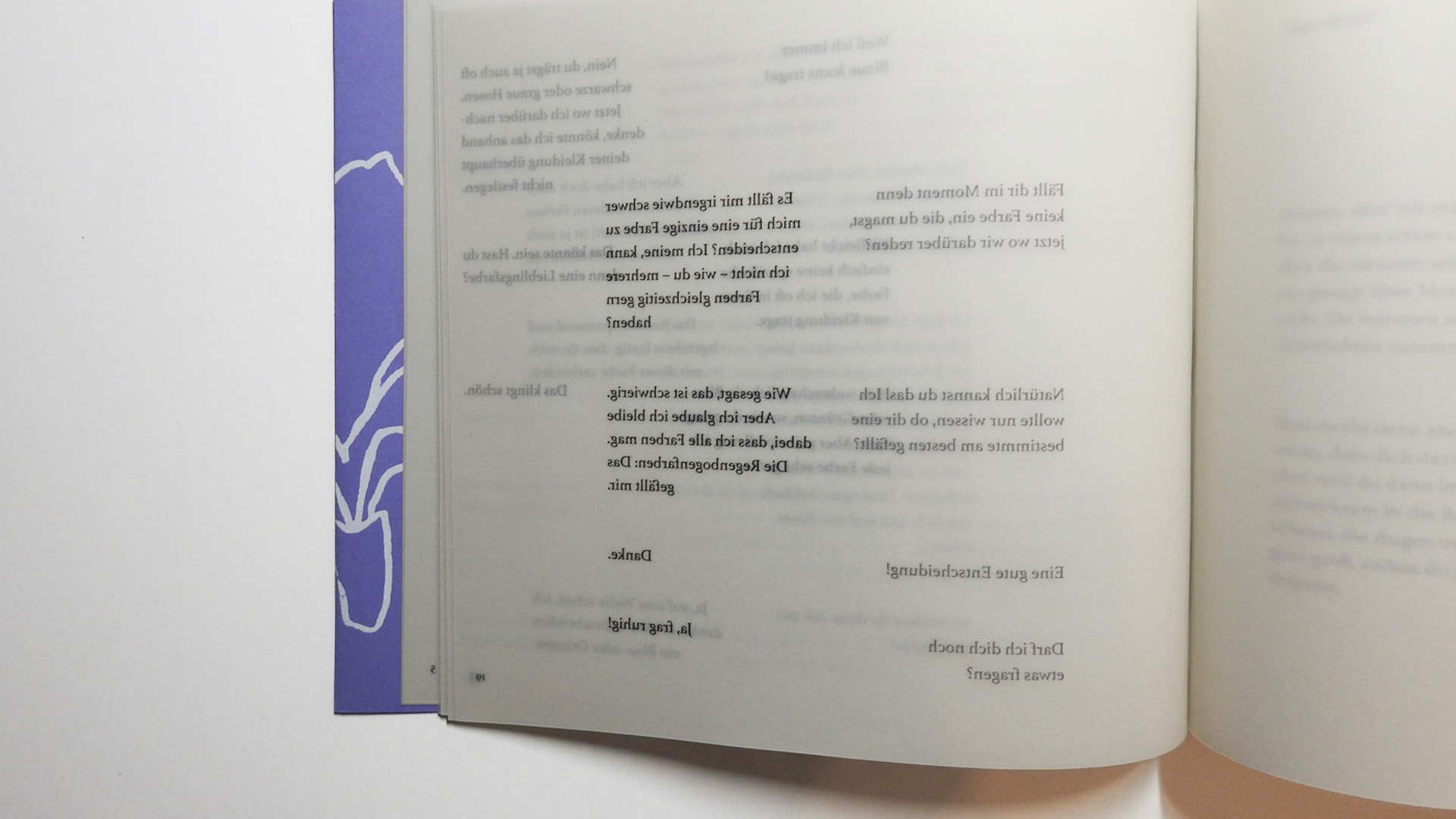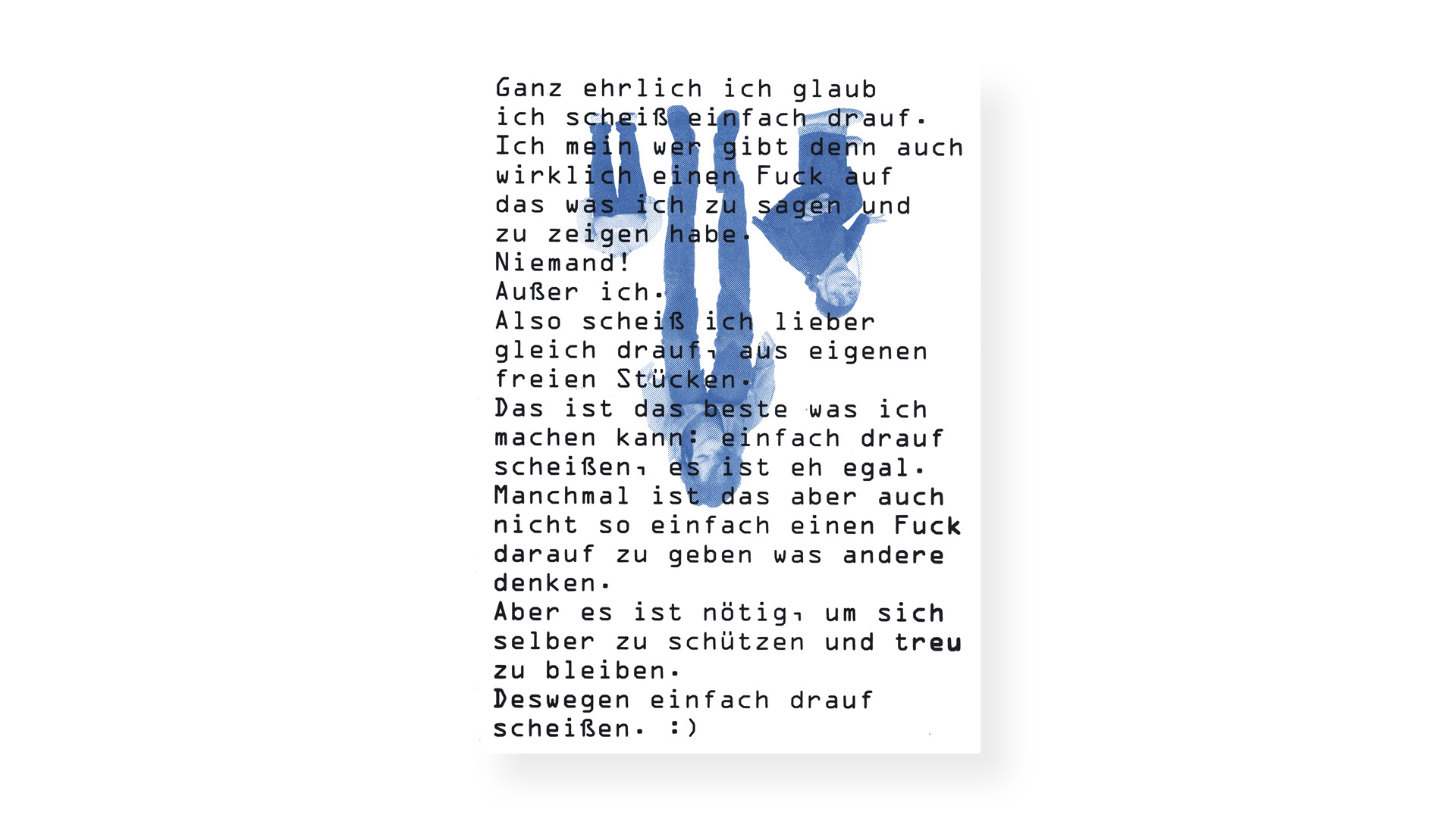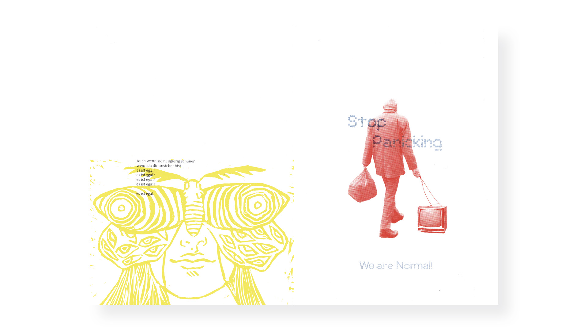 ›Lass dich gehen / Einfach darauf scheissen / Halb so wild / Juckt‹ Die Studierenden der Meister*innenklasse setzten sich gestalterisch mit dem Thema ›individuelle Selbstbestimmung und das Ich-Wir-Verhältnis‹ auseinander. Zwischen der Projektwoche im Kunsthaus Horn und der Originaldruckgrafik-Werkstatt der Graphischen ist ein handgebundenes Buch mit Grafiken in diversen Druckverfahren – zum Beispiel mit Buchdruck, Handsatz, Hoch-, Tief- und Siebdruck – entstanden. Wie kann man als Individuum in dieser stets fordernden Umwelt bei sich selbst bleiben? Indem man einfach ein bisschen mehr >auf alles scheisst<, das macht, was einem Freude bereitet und das Leben ein bisschen mehr zu genießen lernt. — mit Anna Rief und Mara Sulzer