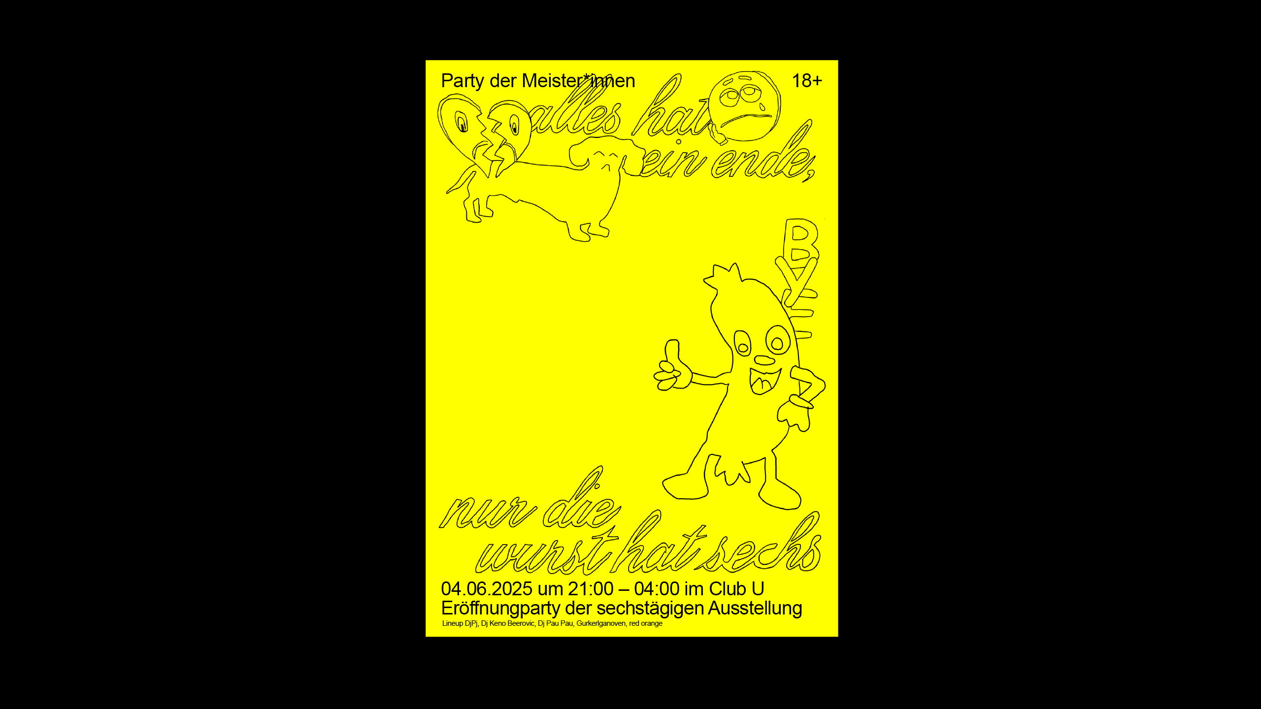 Für die Diplom After Party mit Paula Kraus habe ich ein auffälliges Plakat gestaltet, das mit gelbem Neon und selbstkreierten Illustrationen die Energie der Feier einfängt. Unter dem Motto „Alles hat ein Ende, nur die Wurst hat sechs“ – passend zur sechs Tage langen Ausstellung – soll dies als „Abschluss“ dienen.